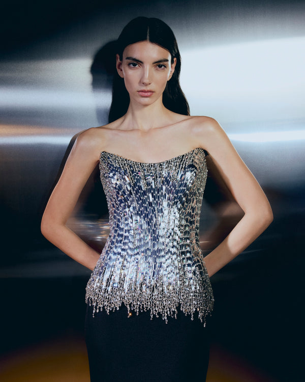 Embellishment becomes light itself. Paillettes, crystals and faceted stones are applied with artistic precision, designed not simply to catch the eye, but to express intent. Each dress, gown and tailored piece becomes a statement in craft, where detail is deliberate and decoration is transformed into identity.