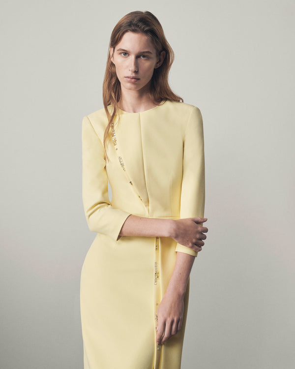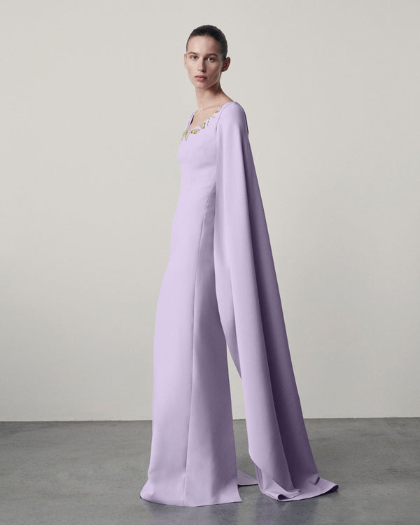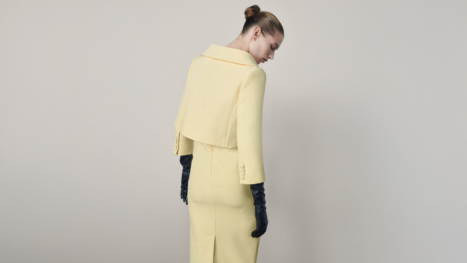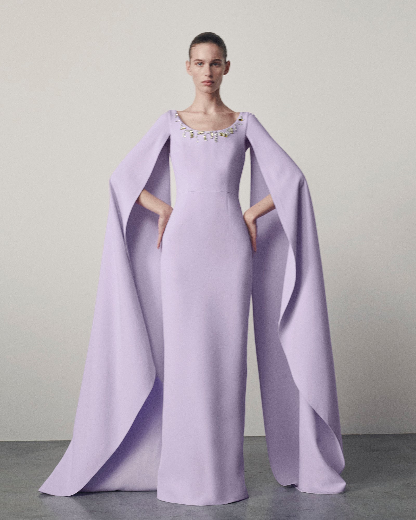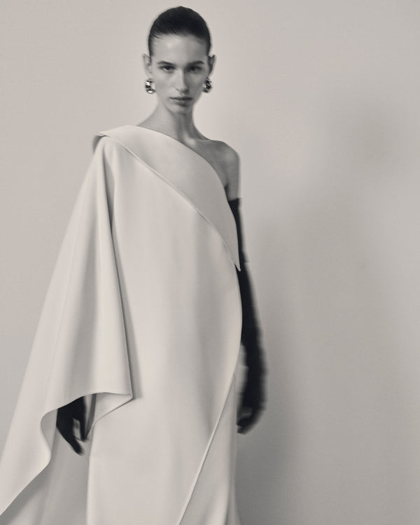 A palette of deep neutrals, soft pastels, and luminous tones defines the collection, offering versatility while maintaining a composed presence. Draped fabrics and sculptural construction create garments that feel considered without excess, balancing elegance with restraint.