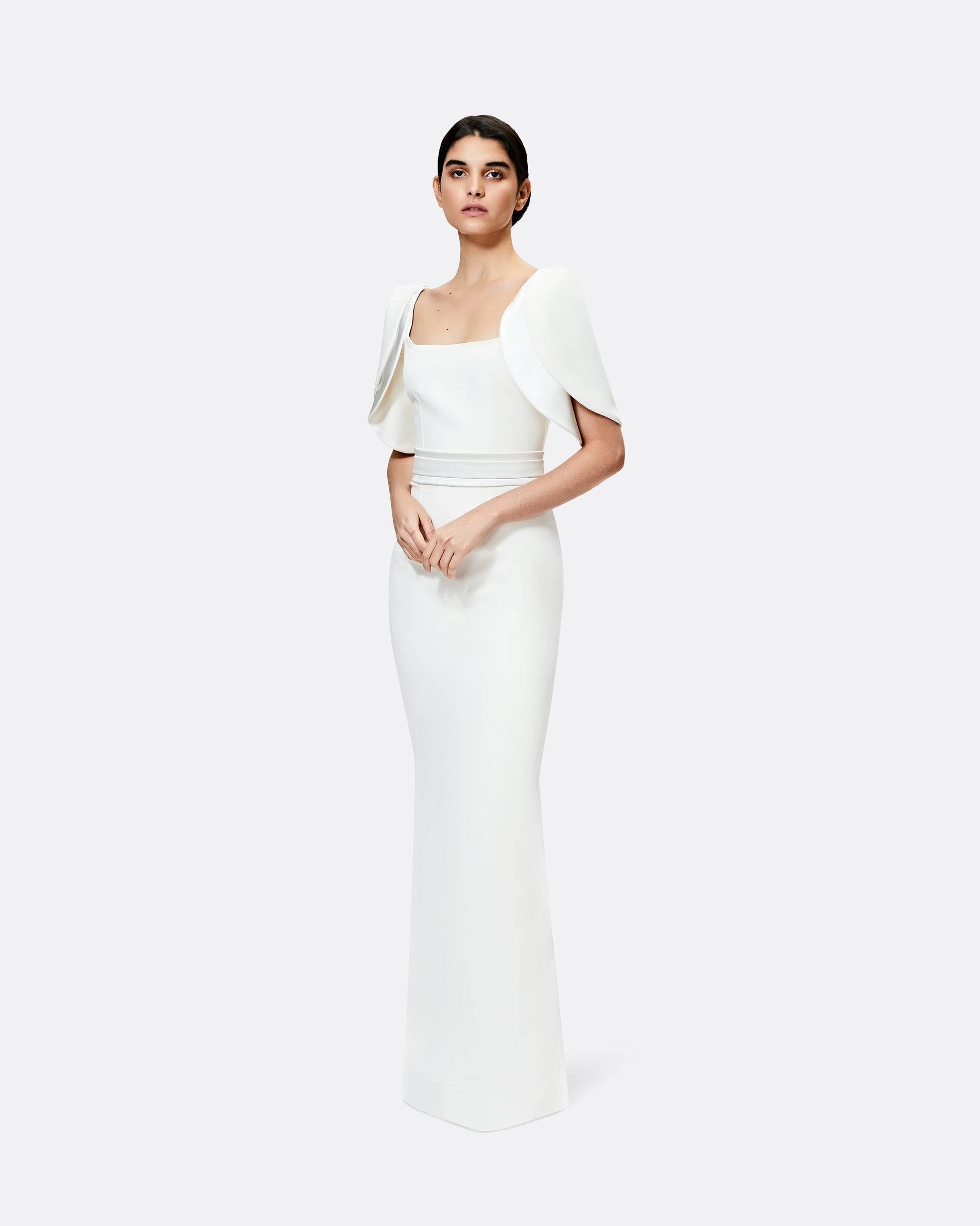 Square neck long dress in ivory heavy crepe, with ivory shine satin stretch lotus sleeve drape.