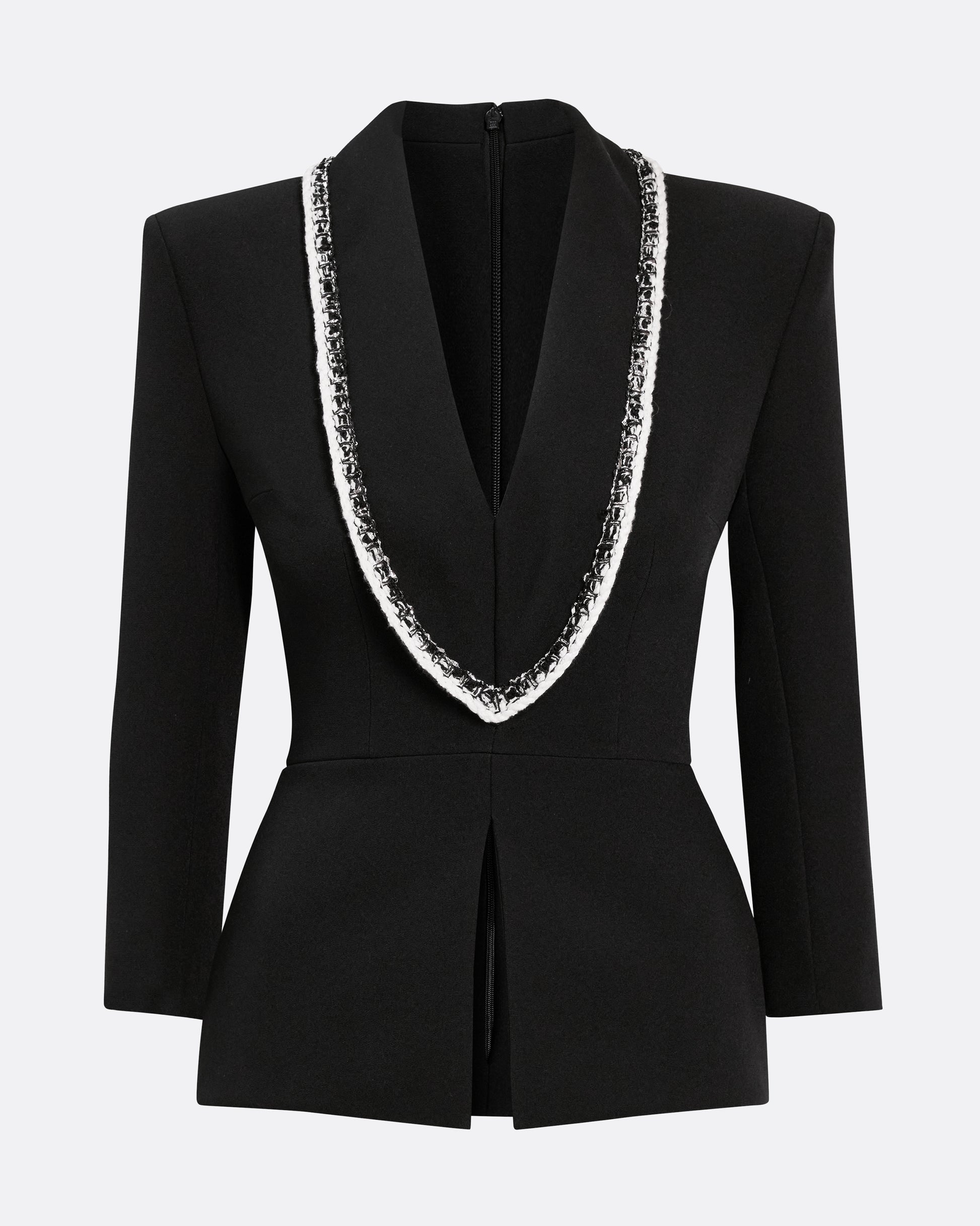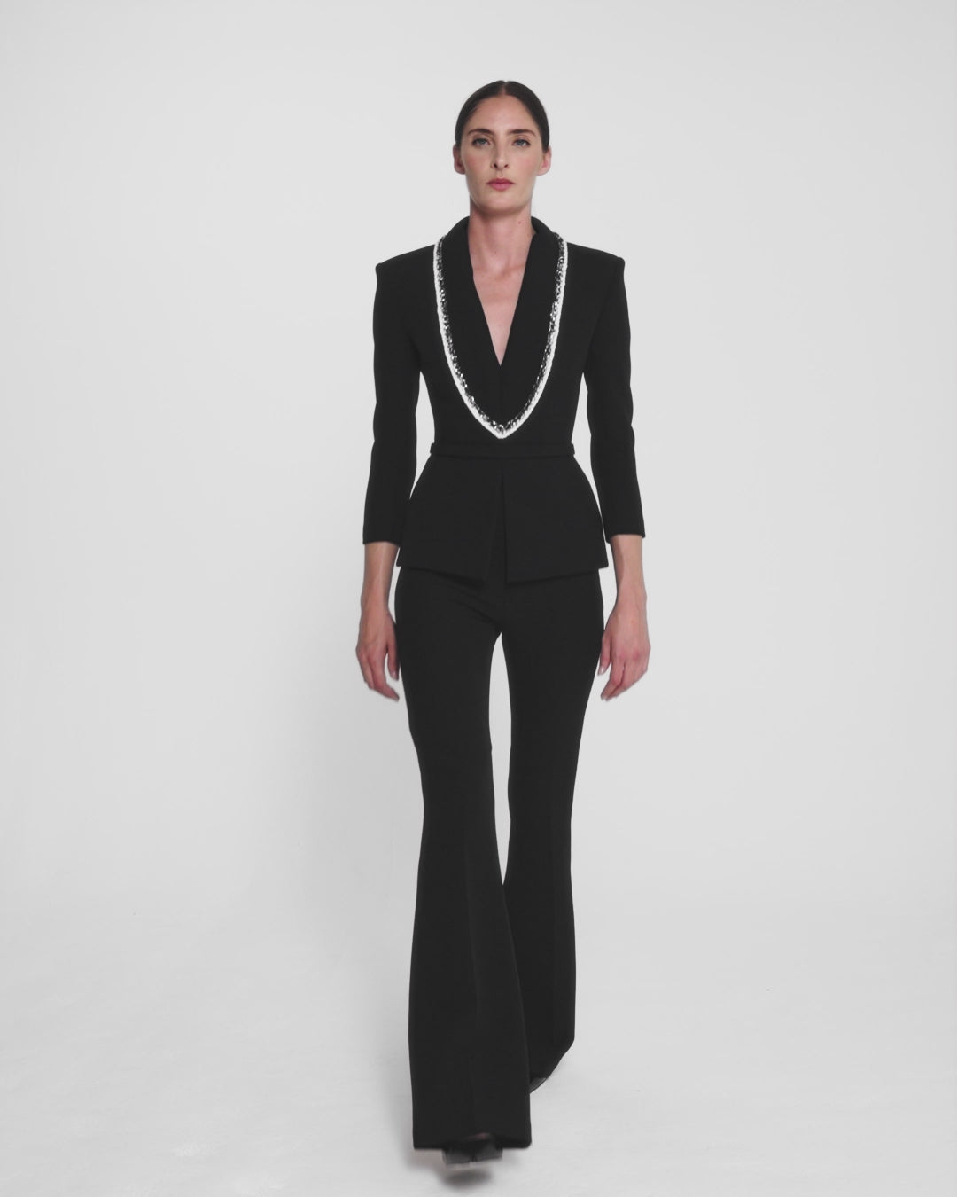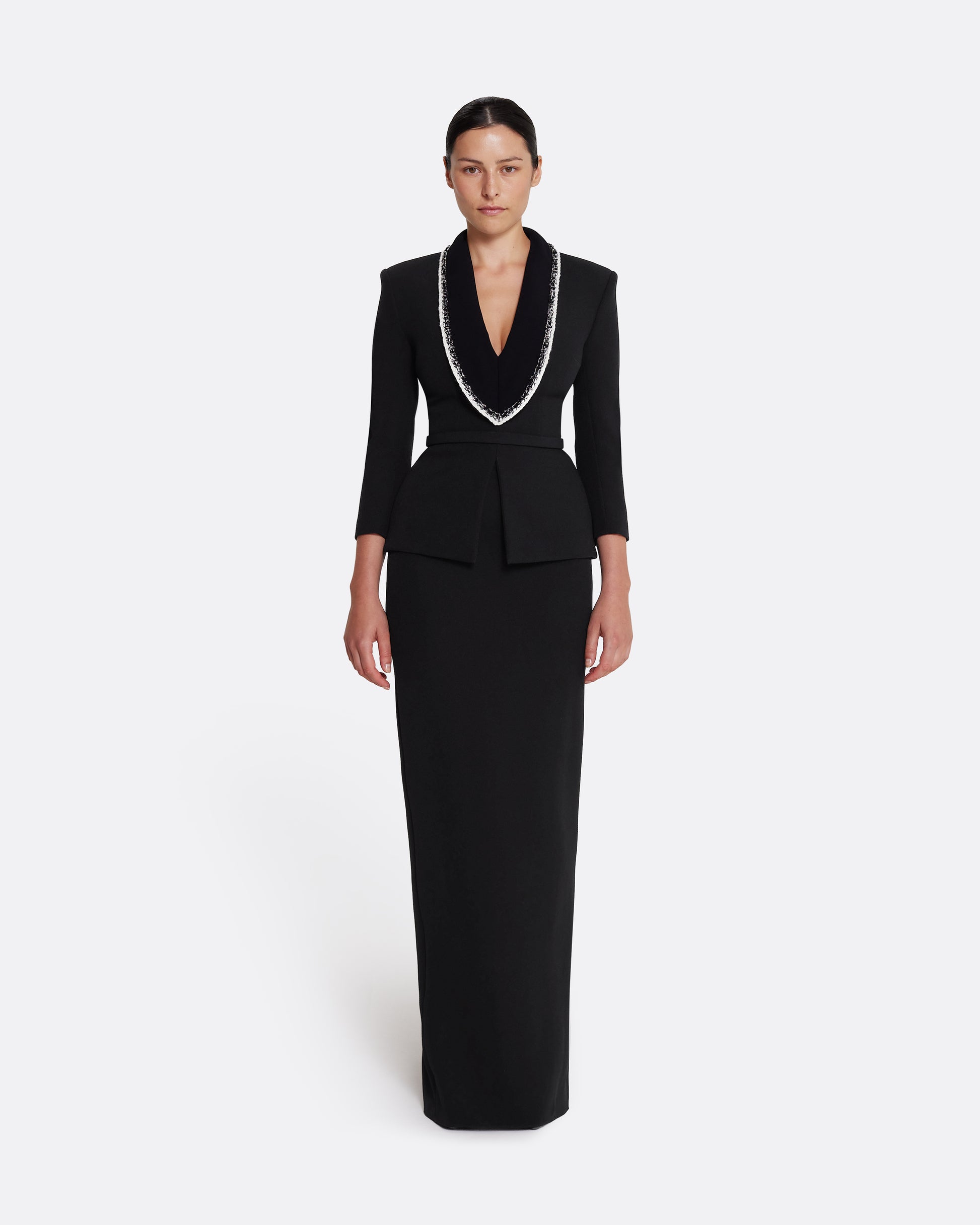 From the Spring Summer ’26 collection, the Adelina top in black is sharply tailored with a plunging neckline framed by contrast embellishment. Sculpted shoulders and a peplum waist define its commanding shape, while the Jonia belt in greyscale punctuates the look with graphic precision.