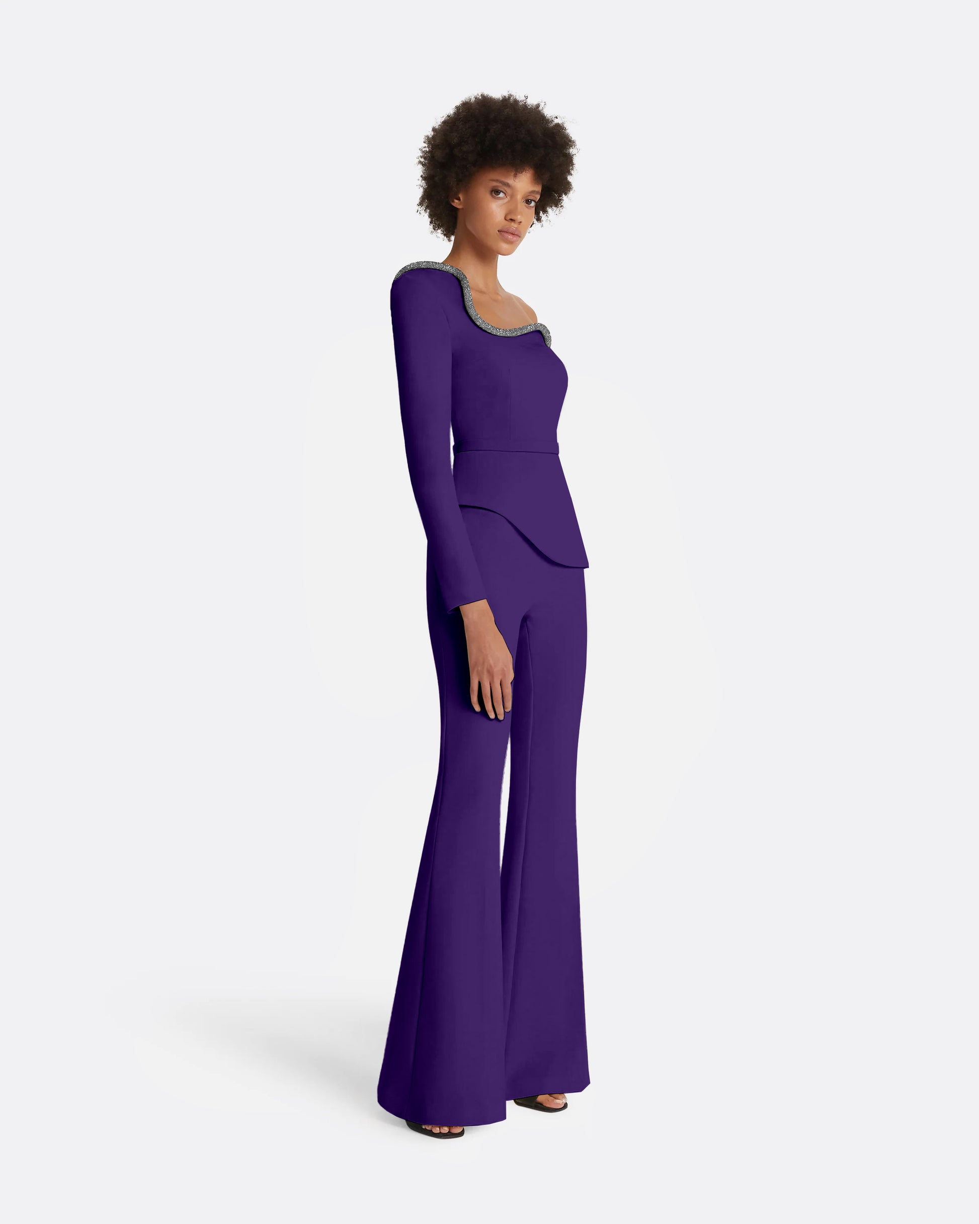 A Safiyaa Icon, the Aime top in pansy blends architectural form with intricate embellishment. Its asymmetric neckline and peplum silhouette are brought to life by delicate Crystal Cord embroidery, adding a refined layer of texture and light.