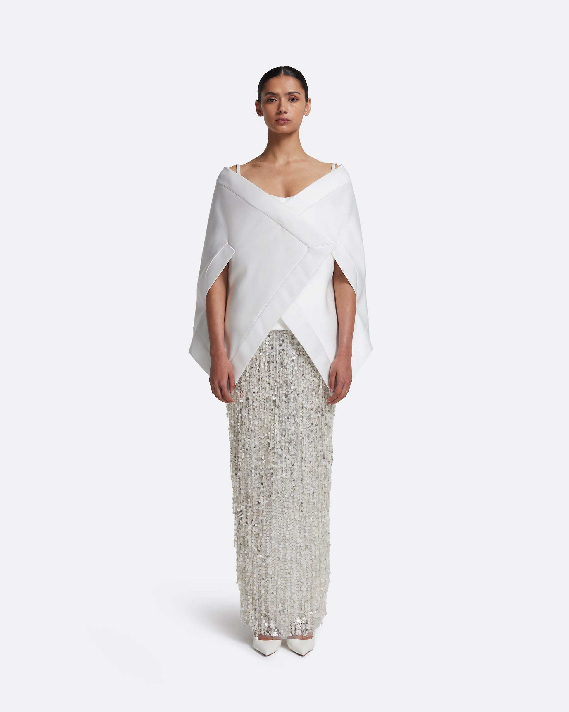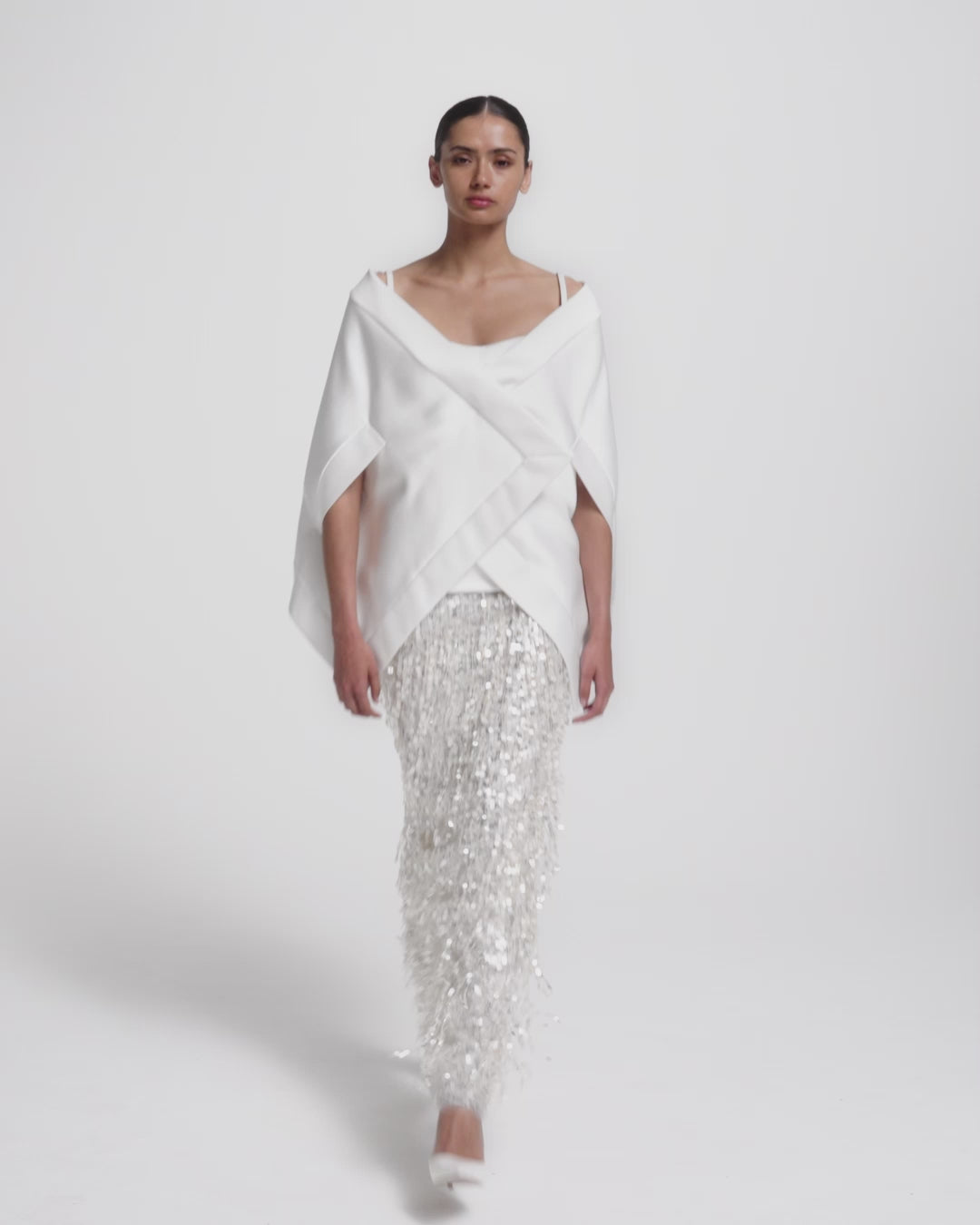 From the Bridal ’26 collection, the Akari harness in porcelain introduces sculptural layering with a soft, cocooned shape. The draped shawl detail adds quiet drama, making it an expressive addition to structured foundations.