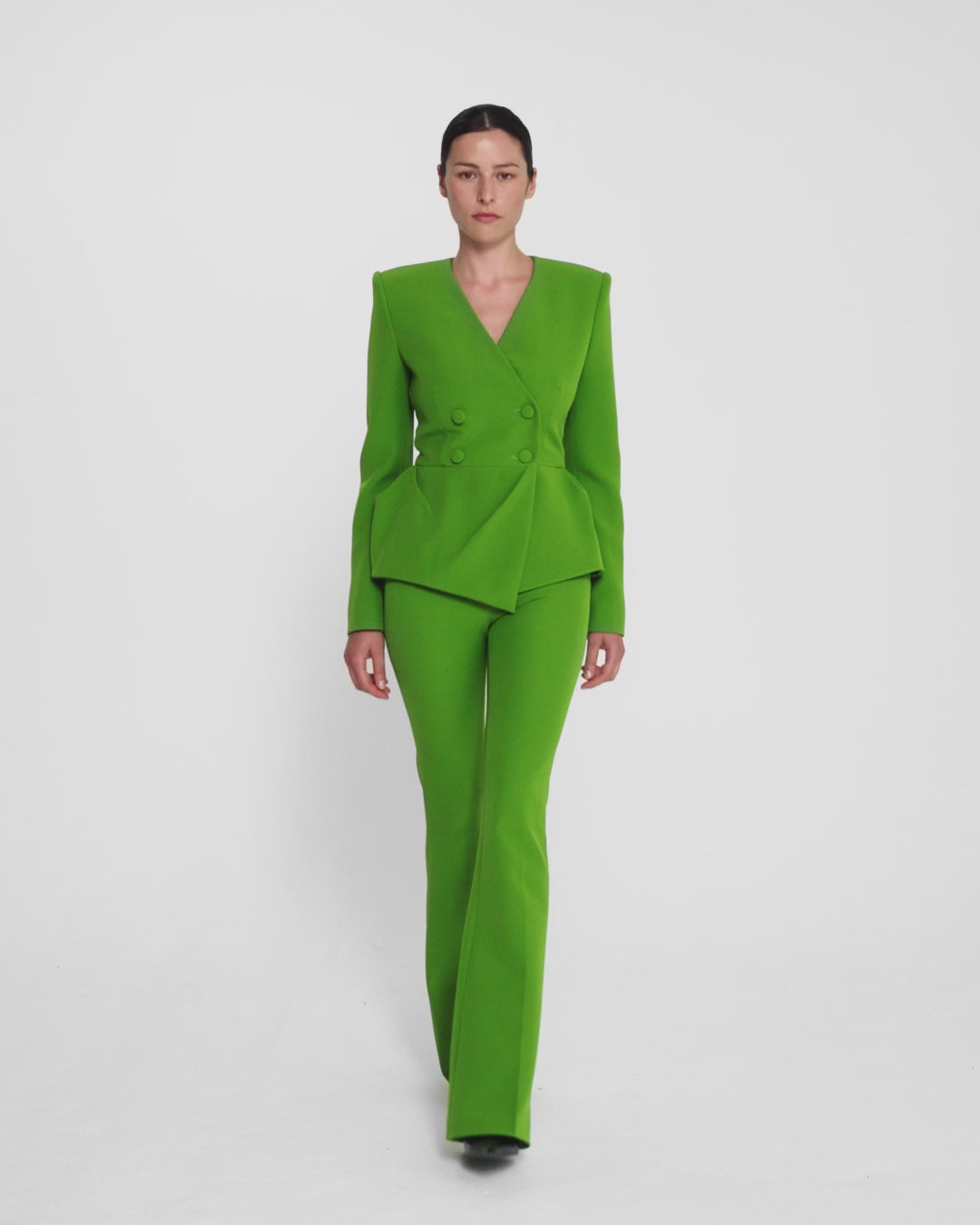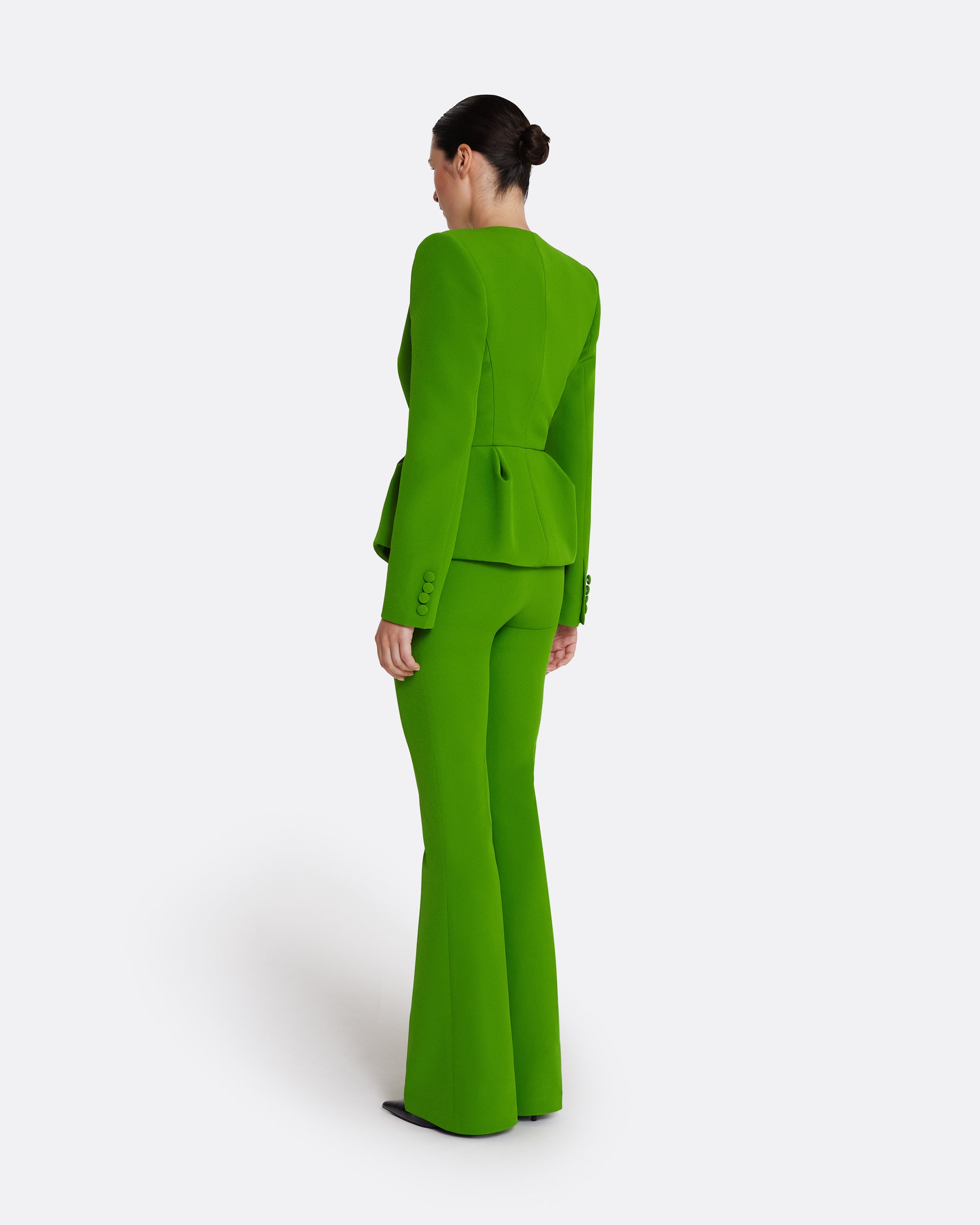 From the Spring Summer '26 collection, the Alexa trousers in verdant green present a bold, modern statement. With their expressive silhouette and distinctive flared legs, they are designed to transition seamlessly from day to evening.