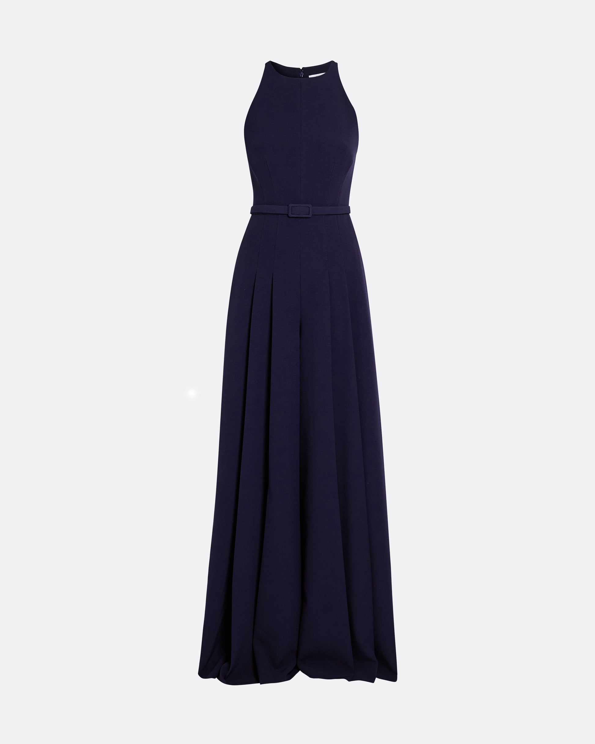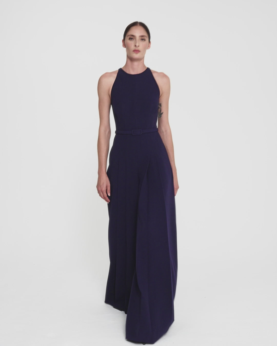 From the Spring Summer ’26 collection, the Althea jumpsuit and Bertha belt in azurite merge the ease of tailoring with a softened, feminine mood. The halterneck cut is clean and minimal, while wide, pleated legs create the effect of a flowing skirt in motion. A tonal Jonia belt defines the waist.