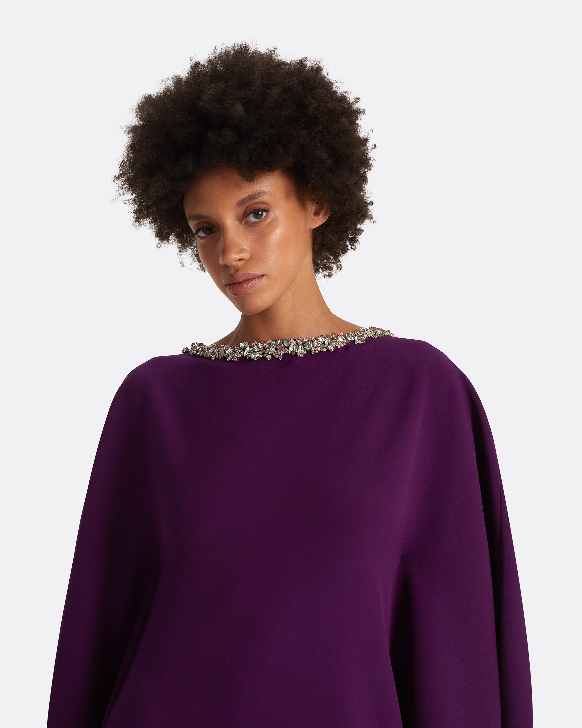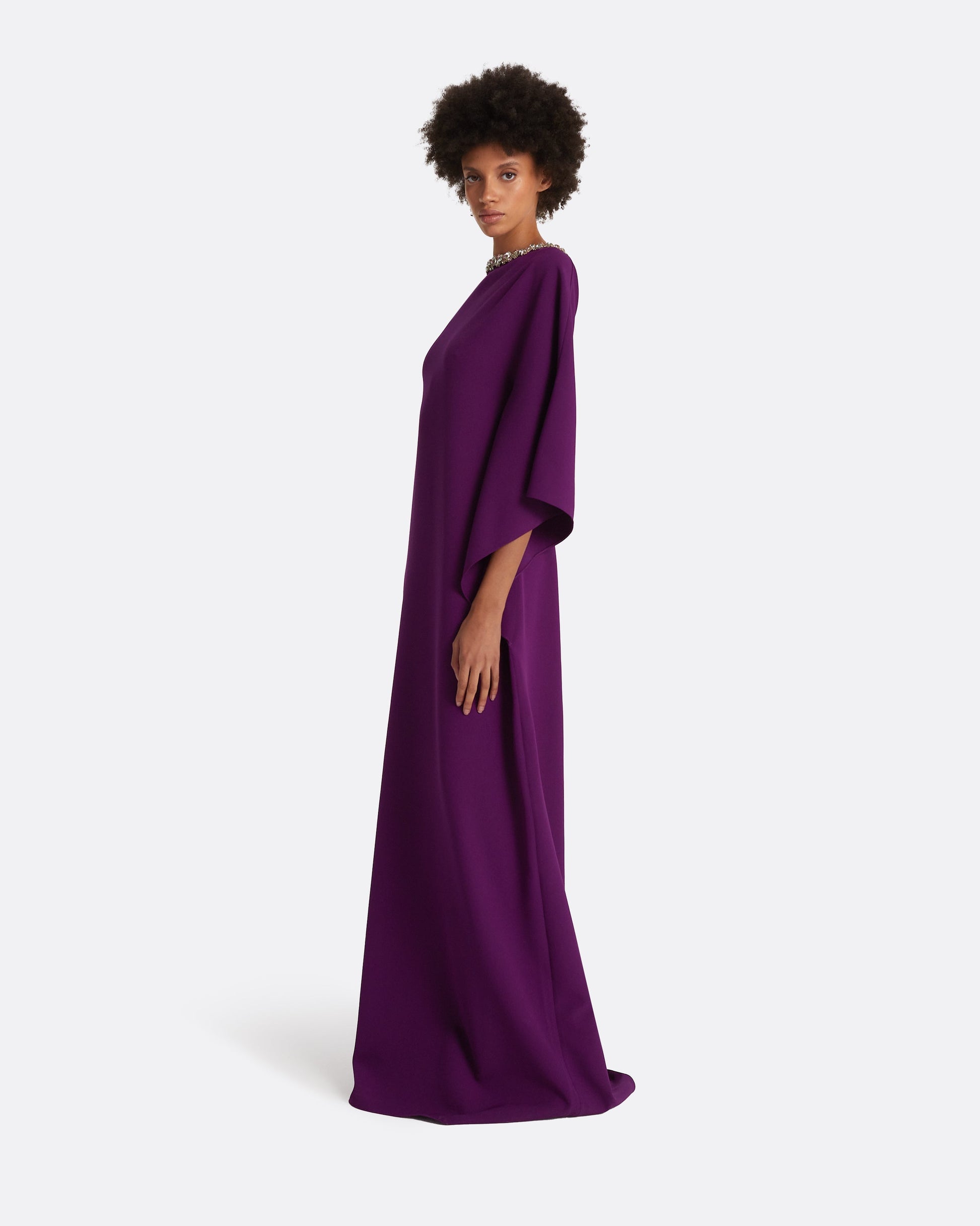 Flowing kaftan gown with flattering seam detail in currant Heavy Crepe with multi-pastels Crystal Trim B.