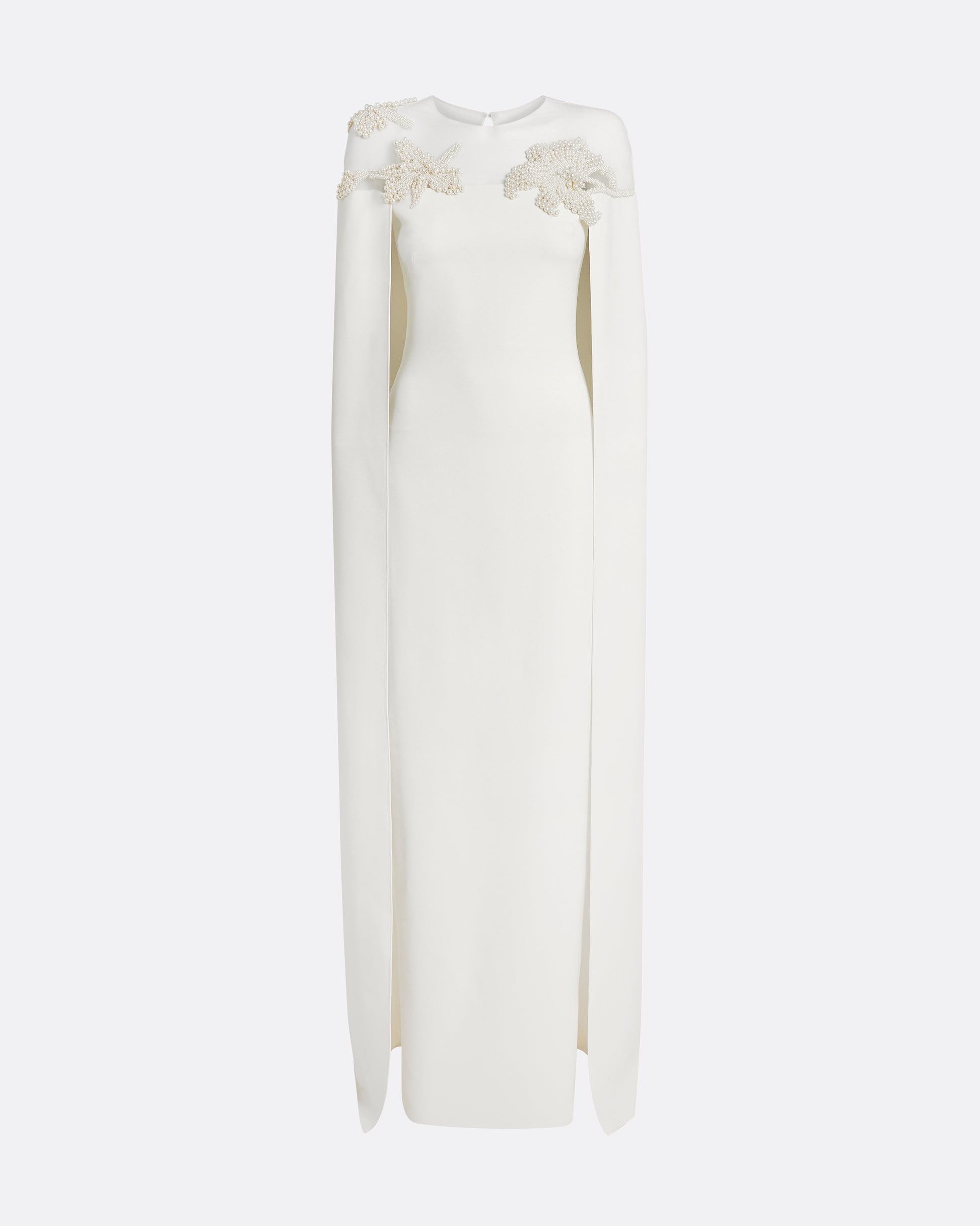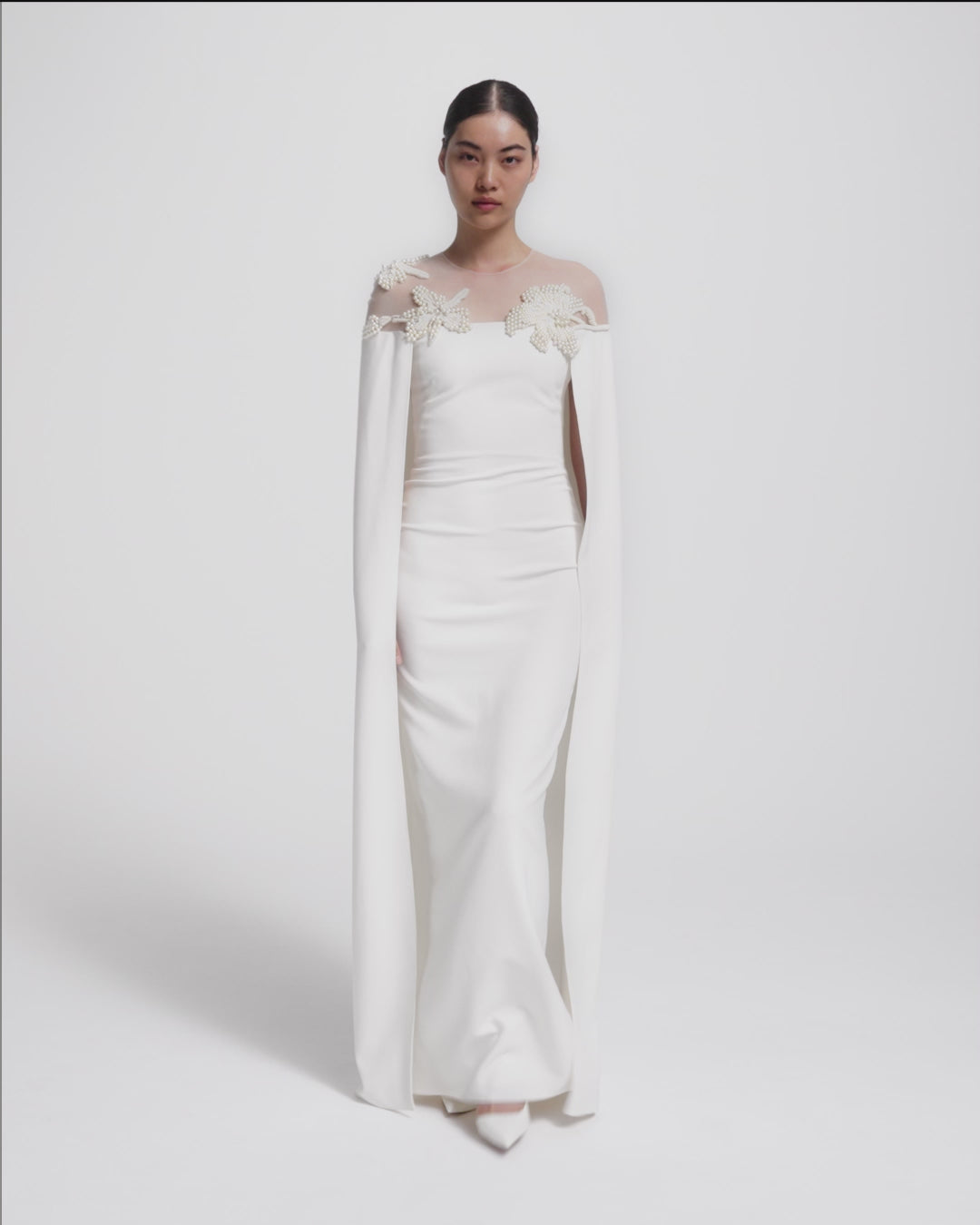 From the Bridal ’26 collection, the Ambere gown in ivory conveys stately refinement. The floor-length cape adds dramatic presence, while pearl accents at the neckline introduce a luminous focal point.