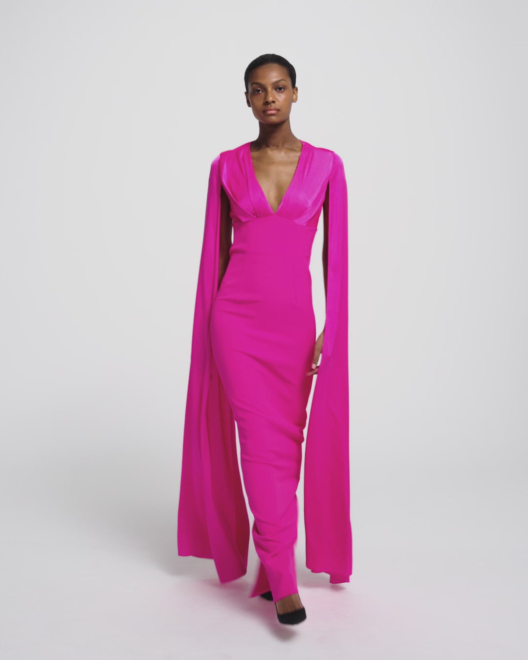 Draped V neck long dress with long caped sleeves and V-shape back in beverley.