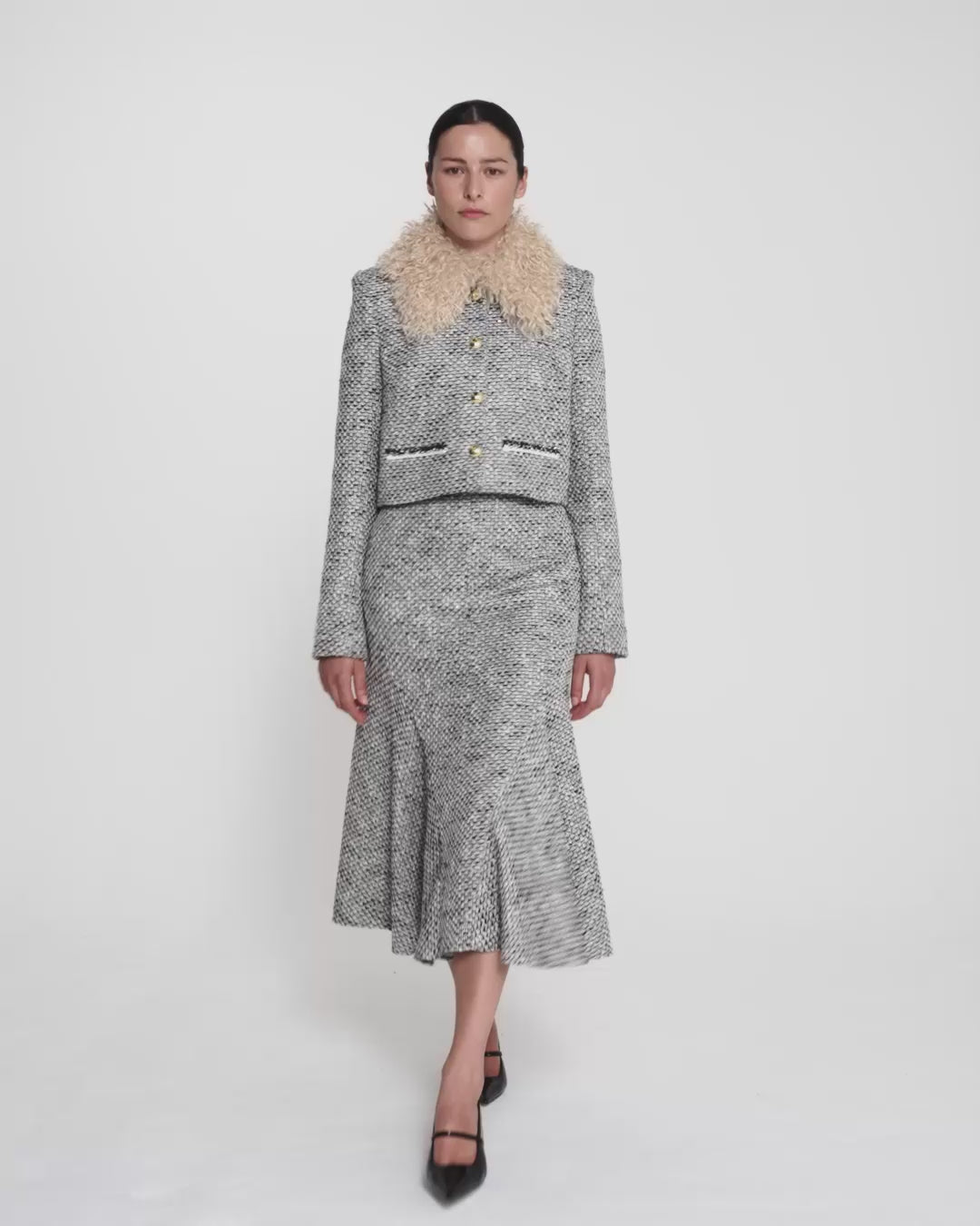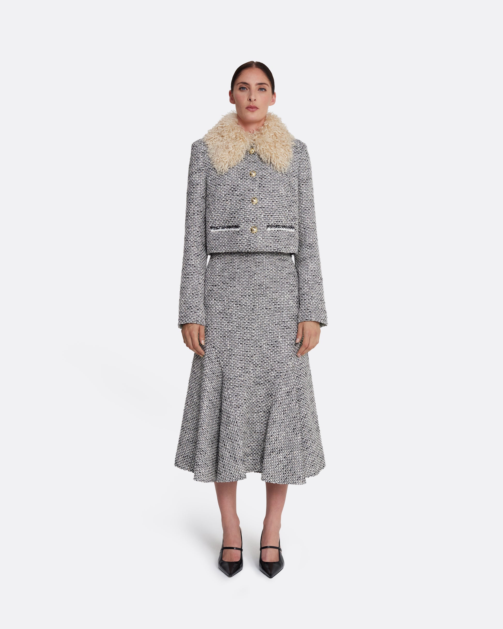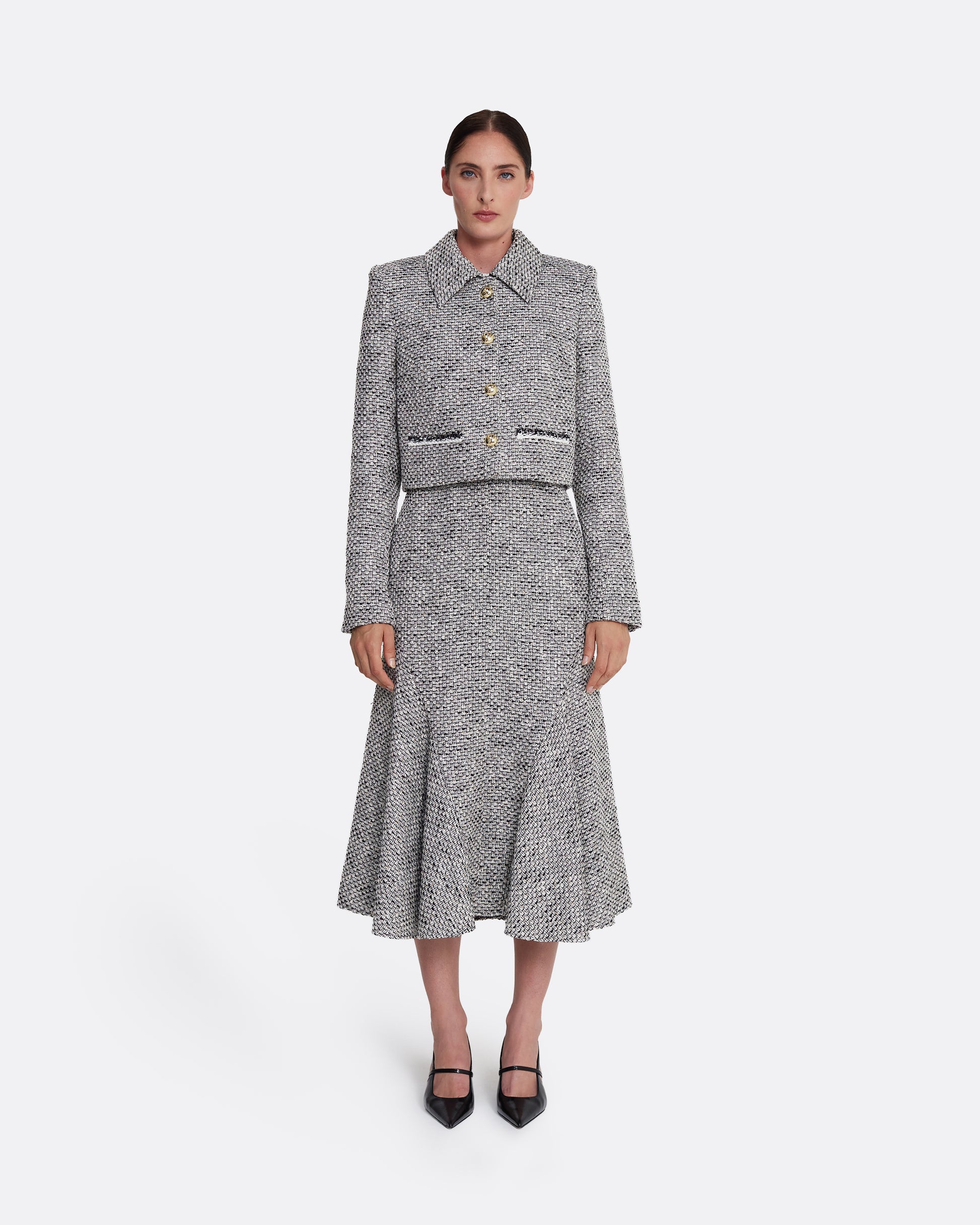 From the Spring Summer ’26 collection, the Annalisa Jacket in greyscale offers a cropped interpretation of classic tailoring. Crafted in a textured weave with a soft contrast collar, it balances structure with softness, while gold-toned buttons introduce a subtle sense of polish.