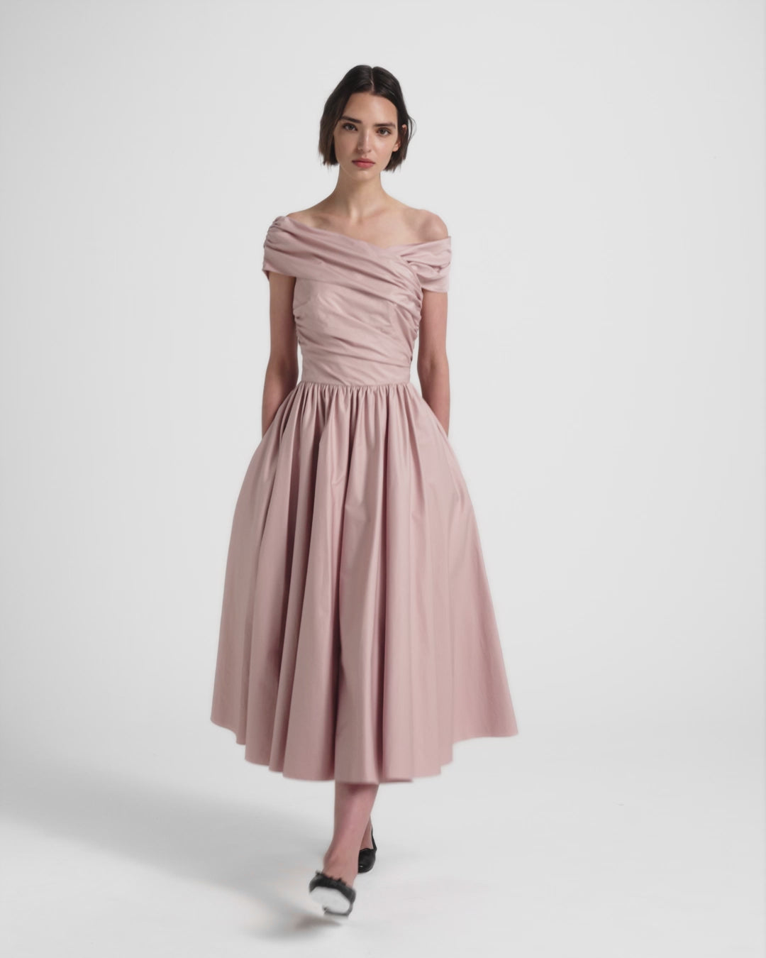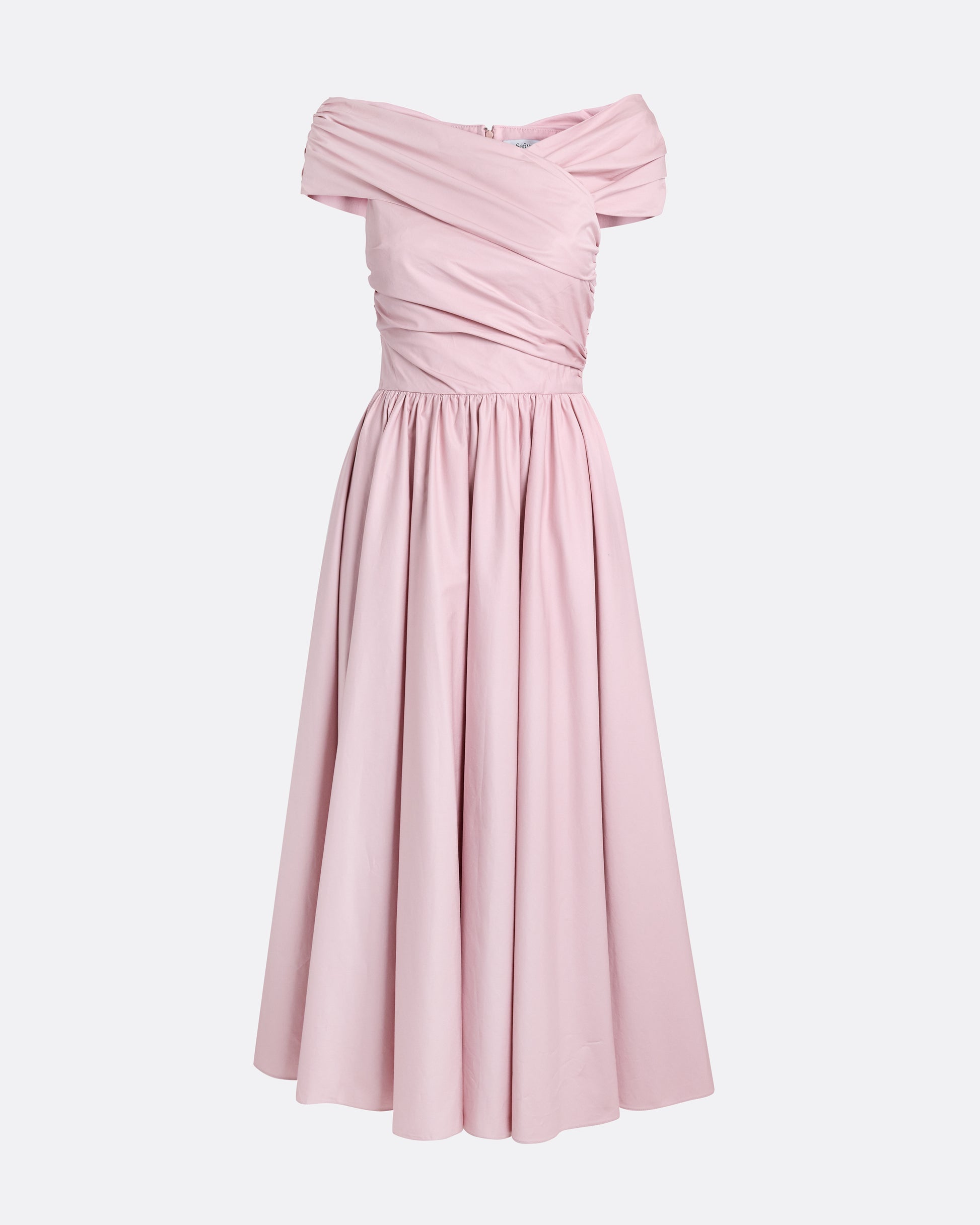 From the Pre-Fall ’26 collection, the Apolline Midi Dress in soft pink cotton is a day-to-night dress designed for warm-weather events and elevated daytime dressing. Cut to an A-line silhouette, it features draping across the bust and an asymmetric off-the-shoulder neckline. Lightweight cotton brings ease and movement, balancing structure with softness.