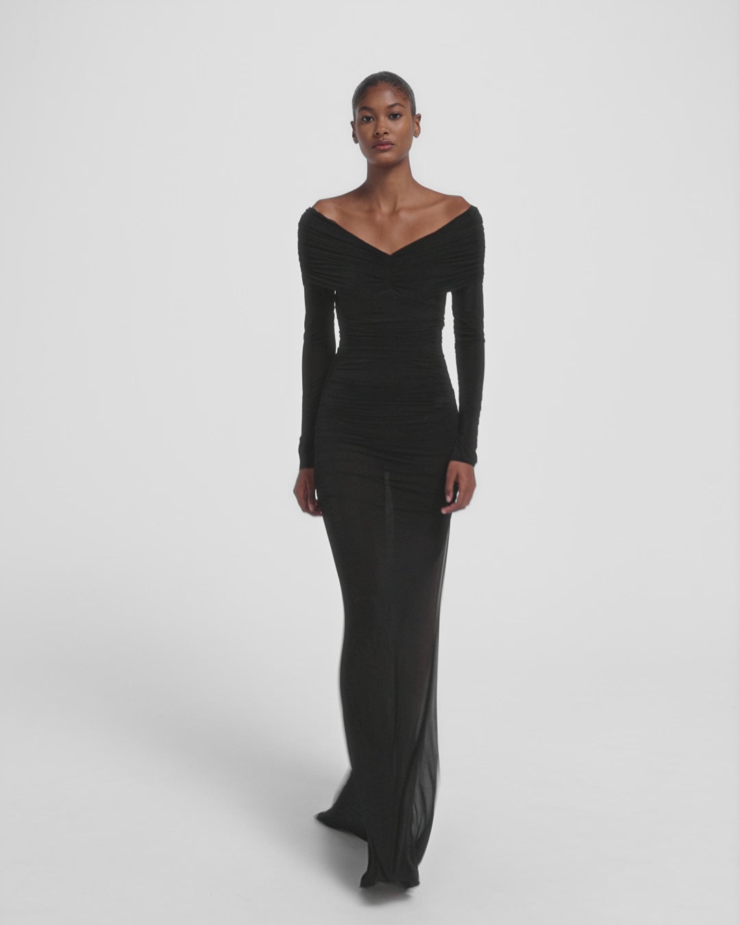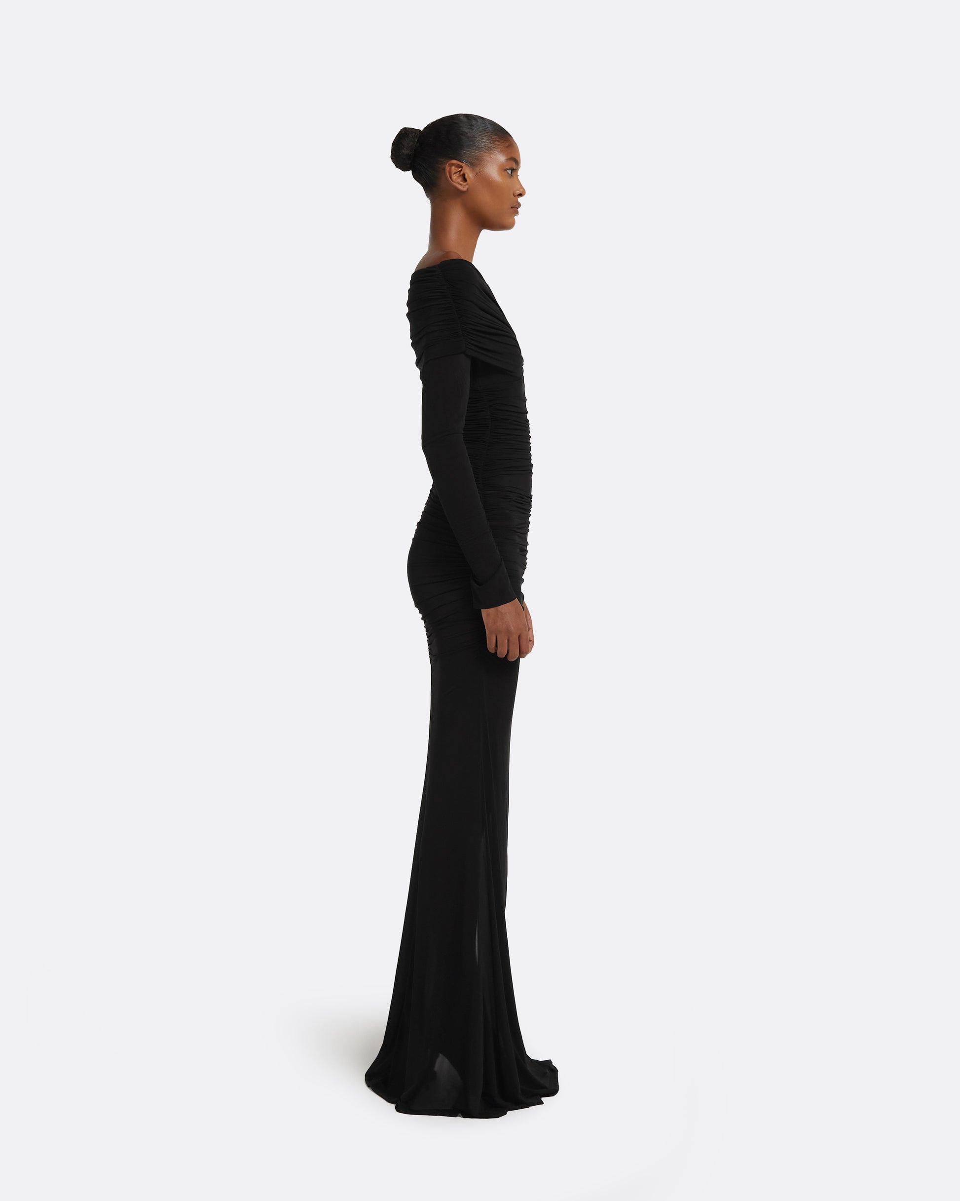 Long sleeve gown with of the shoulder drape detail