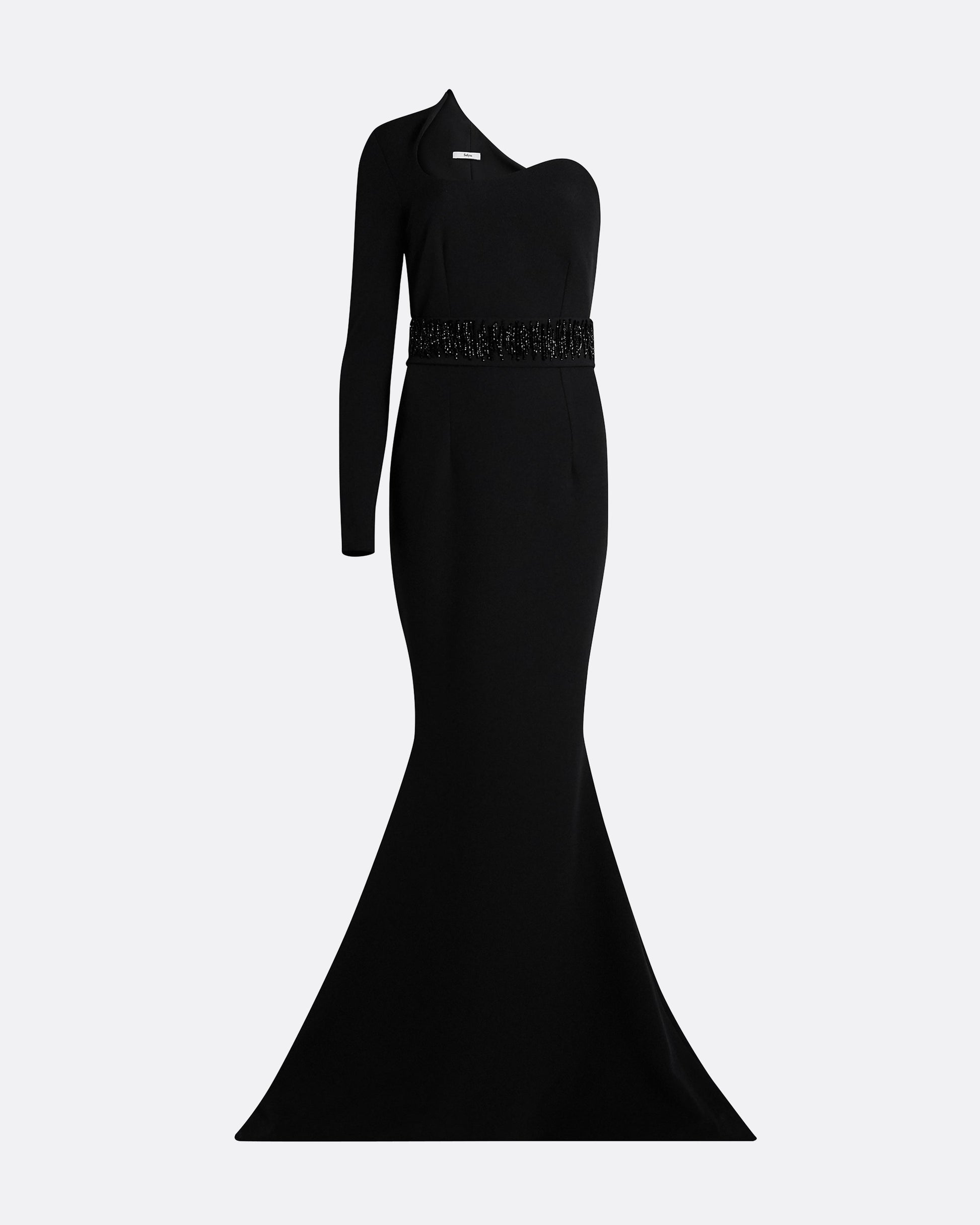 Single sleeve gown with scoop neck detailing in black.