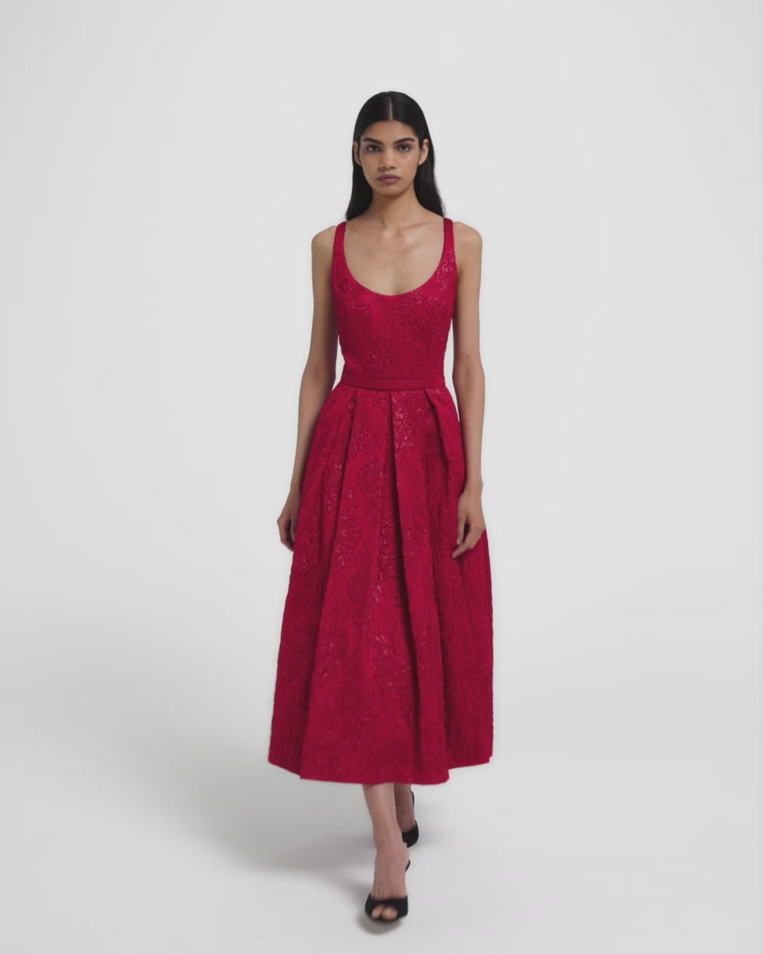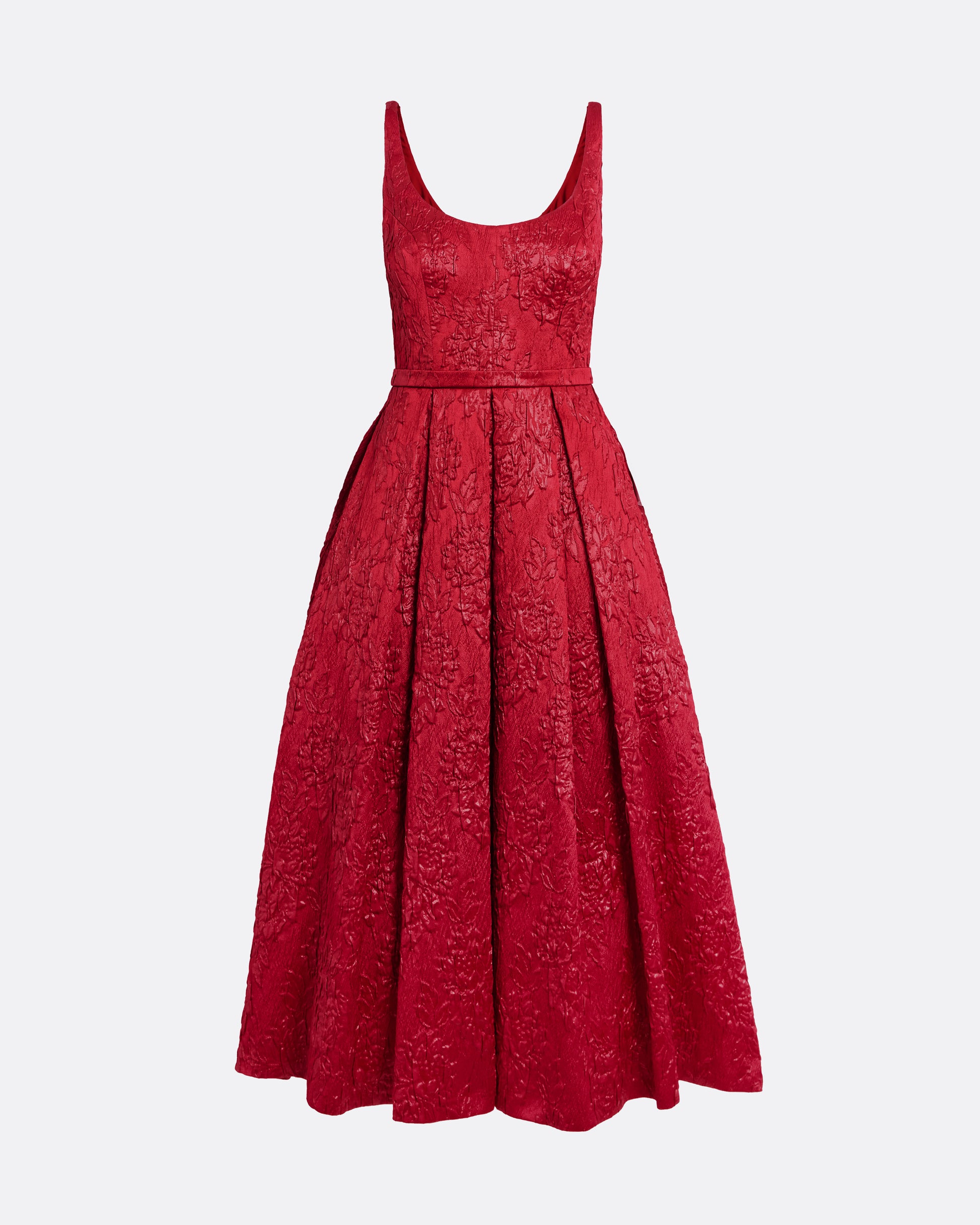 From the Resort '26 collection, the Asher dress in crimson presents a dramatic interplay of shape and texture. Cut with a soft scoop neckline and cinched at the waist, the full skirt moves with volume and precision. Crafted in sculpted floral jacquard, its lacquered surface catches the light with subtle definition.