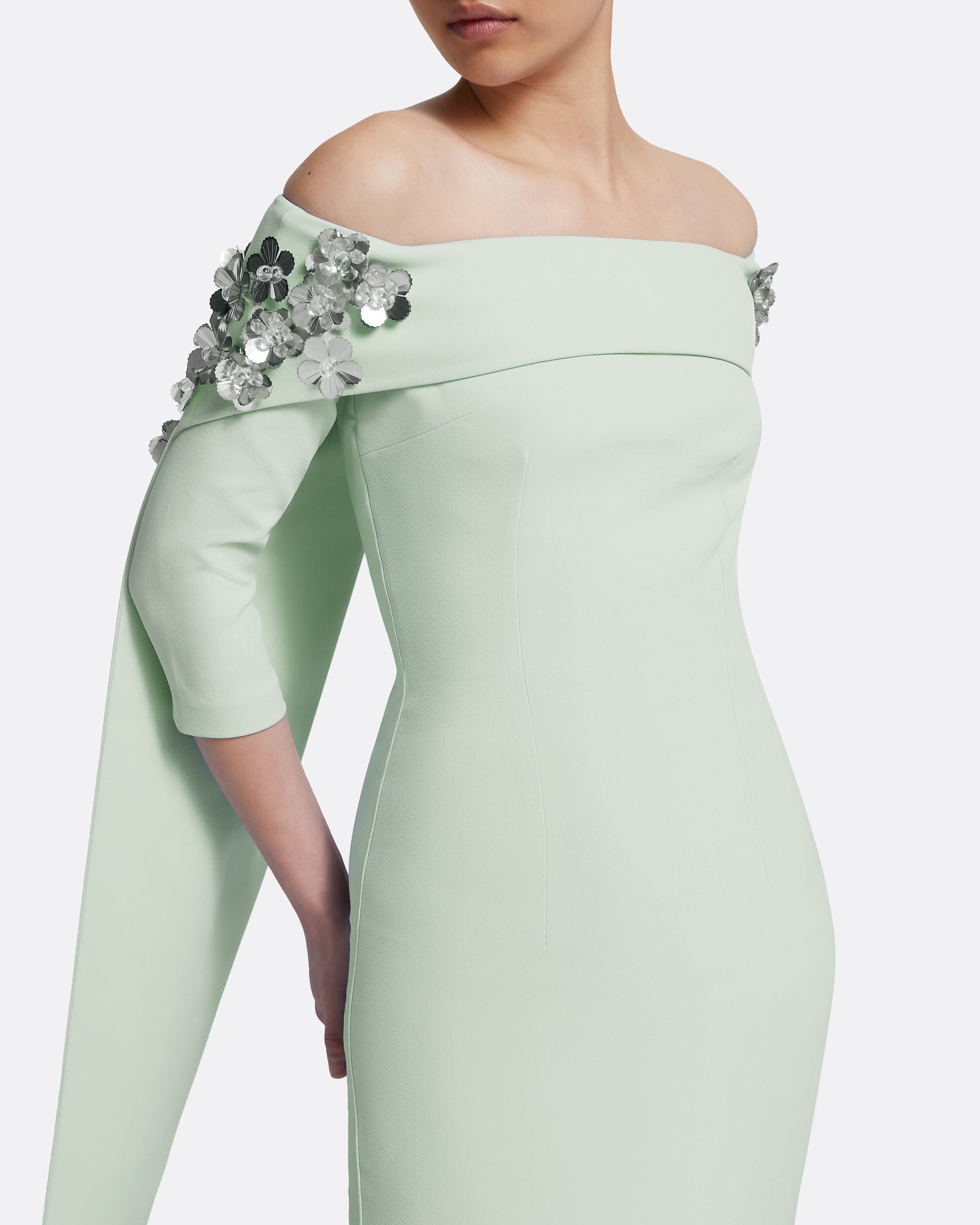 Bustier long dress and off shoulder topper with trail long back and straight sleeve, in spearmint and silver flora embroidery.