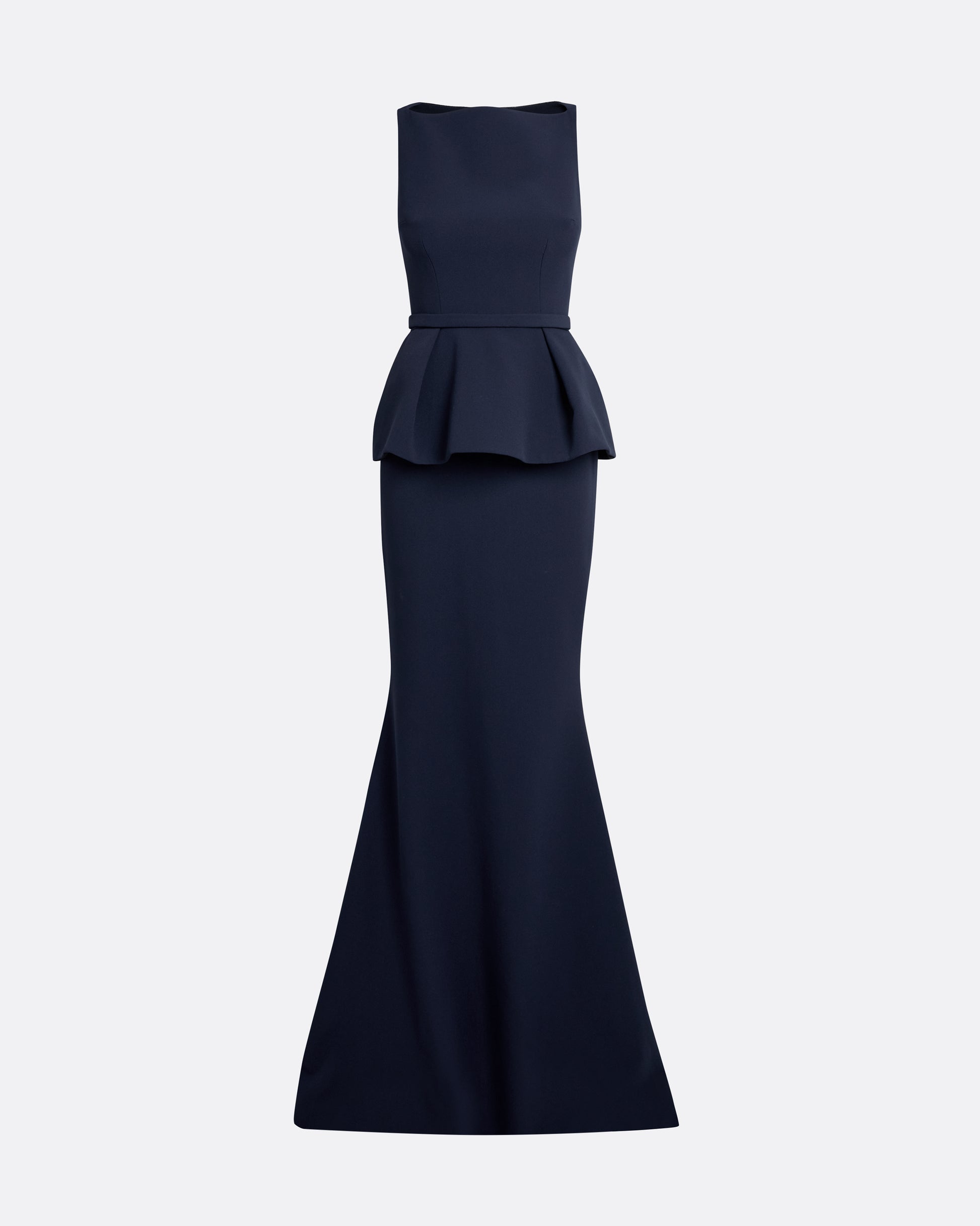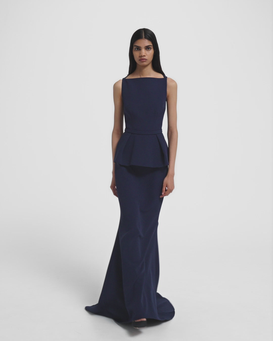 From the Resort ’26 collection, the Carter long dress in maritime blue is a sculptural evening silhouette. Defined by a high boat neckline and a flared peplum, the sleeveless design balances elegance with architectural ease.