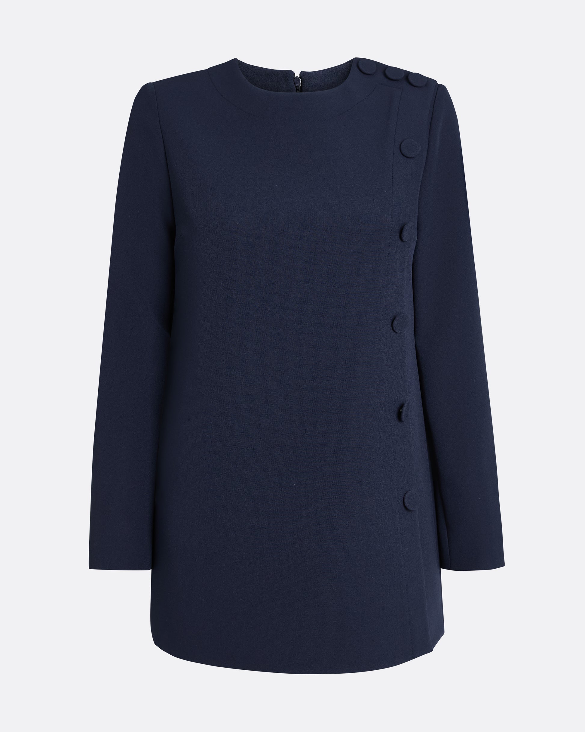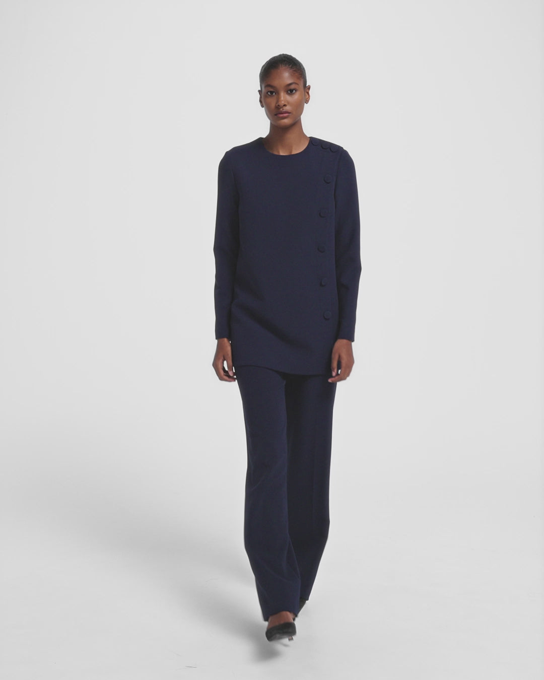 Minimalism with a twist. The Chance Top is defined by its clean line and asymmetrical button detailing, bringing sculptural depth to a polished staple. Designed with a high, crew neckline and long sleeves, it balances structure with subtle design accents.