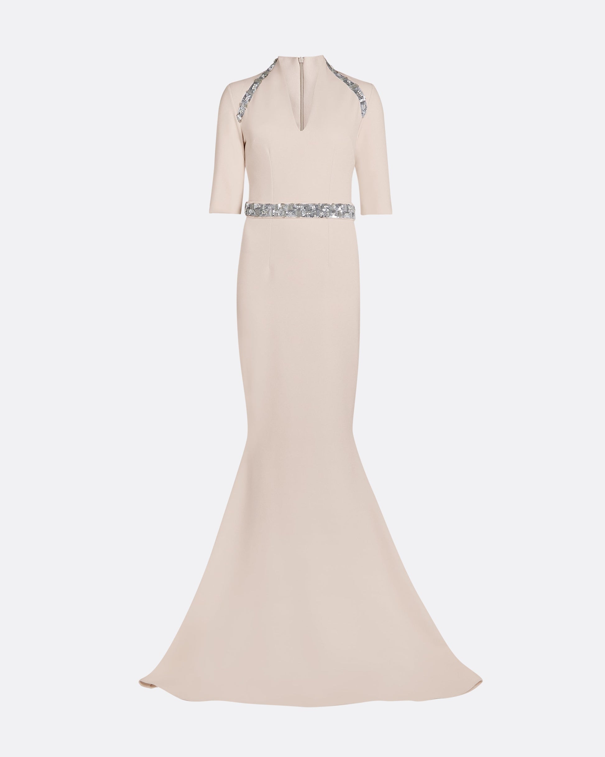 V neck long dress with cropped sleeves and fishtail skirt in silver on powder.