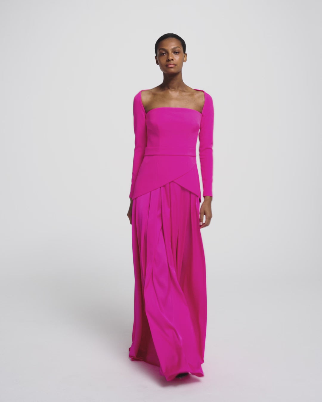 Long dress with fluid skirt and long sleeved, wide square neck top in beverley.