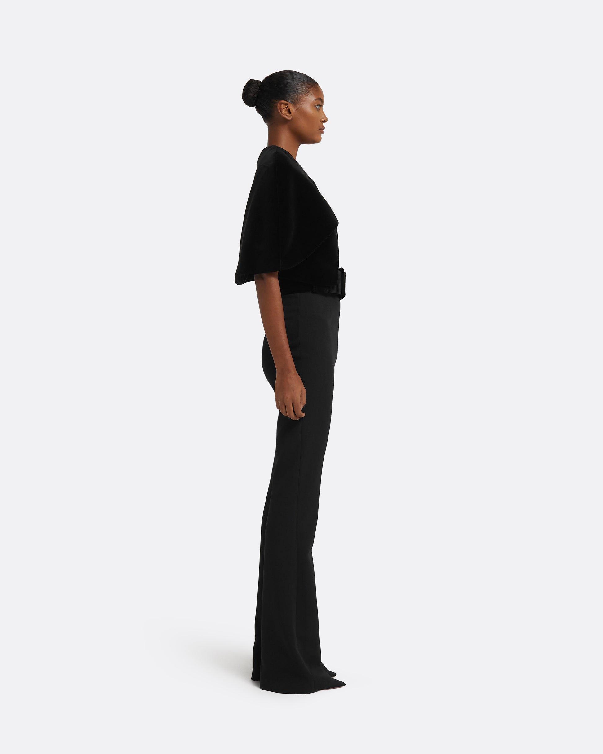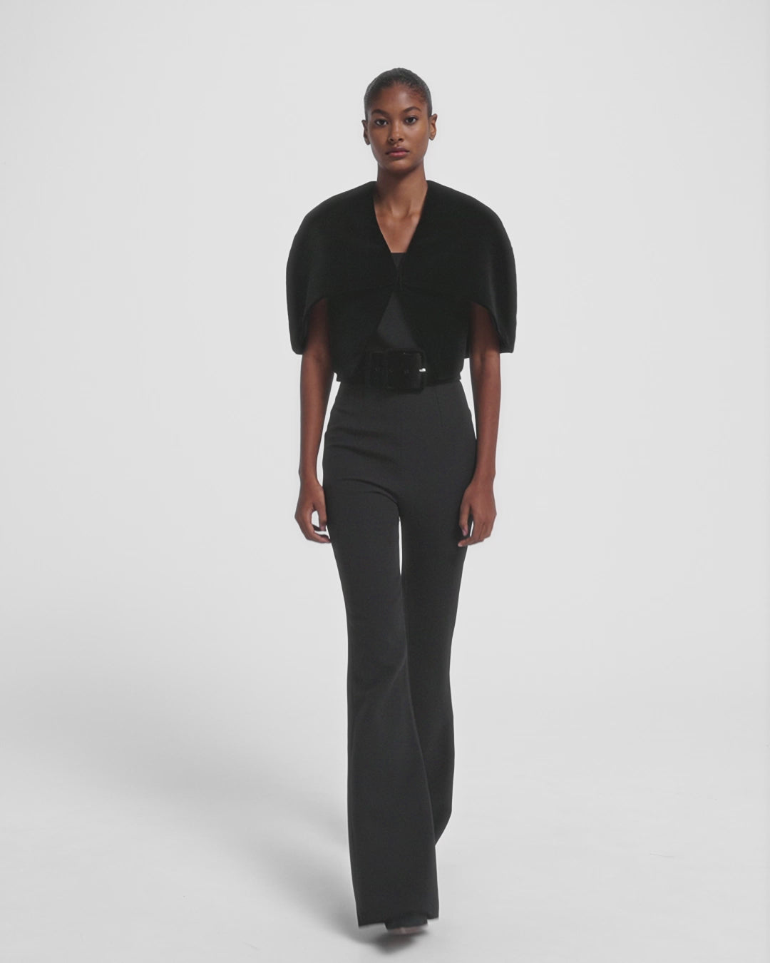 A sculptural study in softness, the Devon Cape is shaped with volume and a rounded line. Designed to sit just above the elbow, its cropped proportions lend modernity to evening dressing, while a concealed front closure preserves its seamless finish.