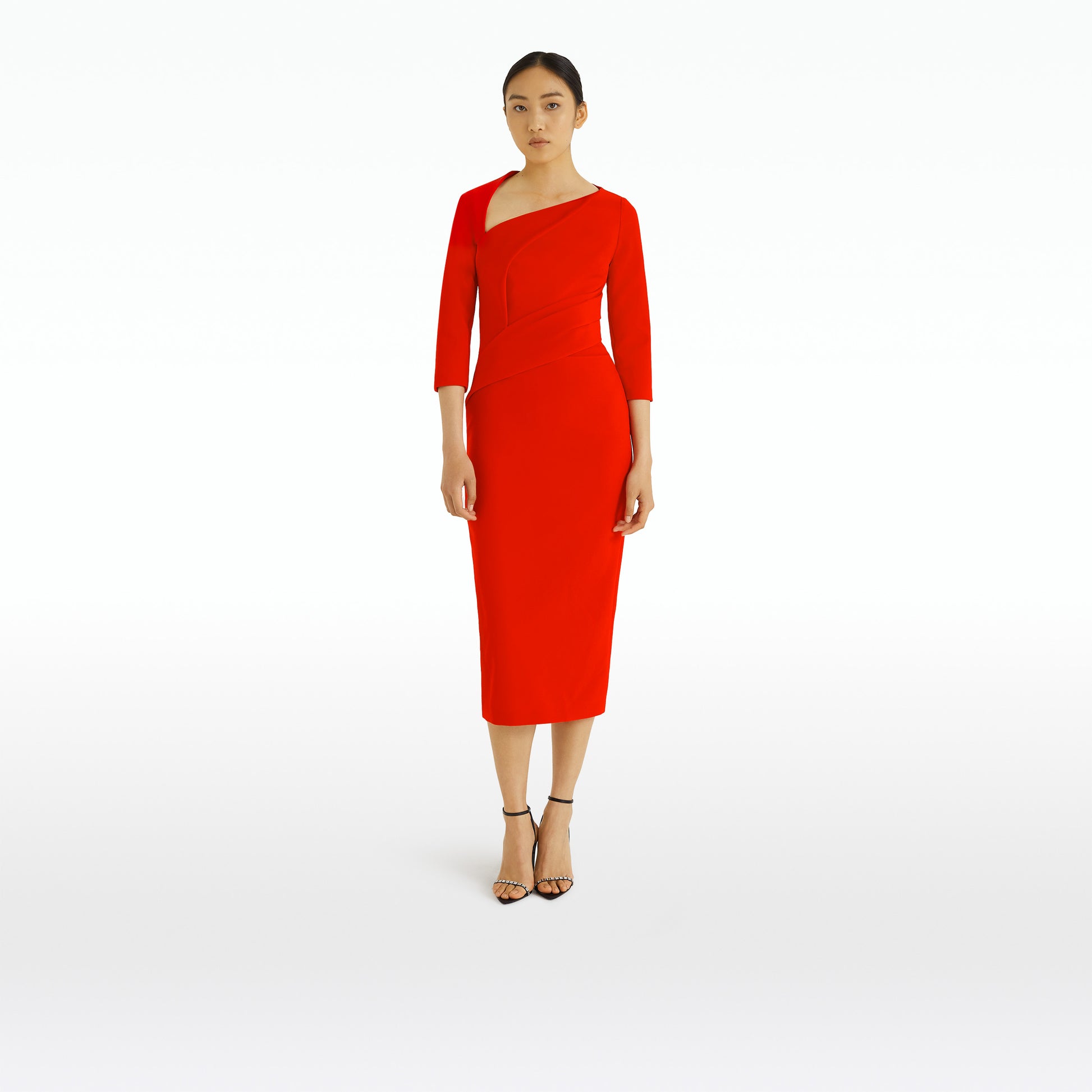 Cocktail dress with flattering bust drape and three quarter length sleeves in cherry red Heavy Crepe.