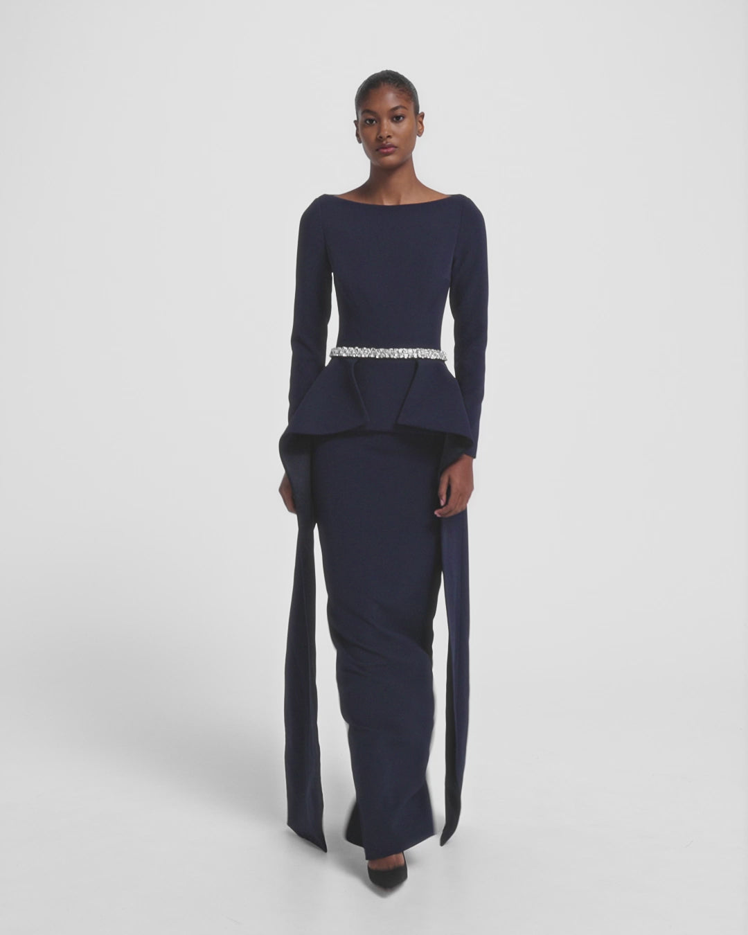 From the Resort ’26 collection, the Dylan top in midnight navy on maritime pairs structural poise with sculptural design. Defined by its flared peplum and sweeping side tails, the silhouette is anchored by a clean boat neckline and long sleeves.