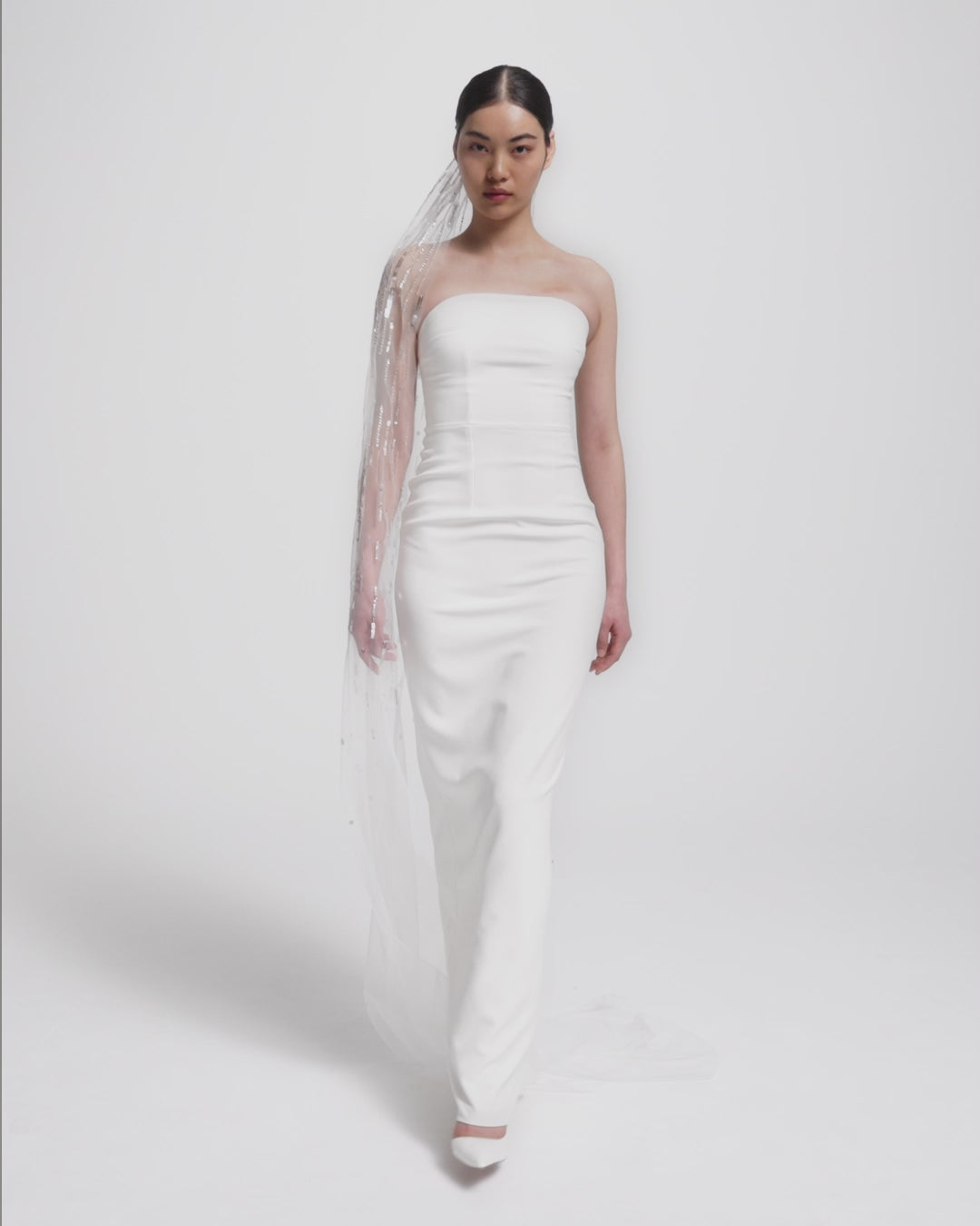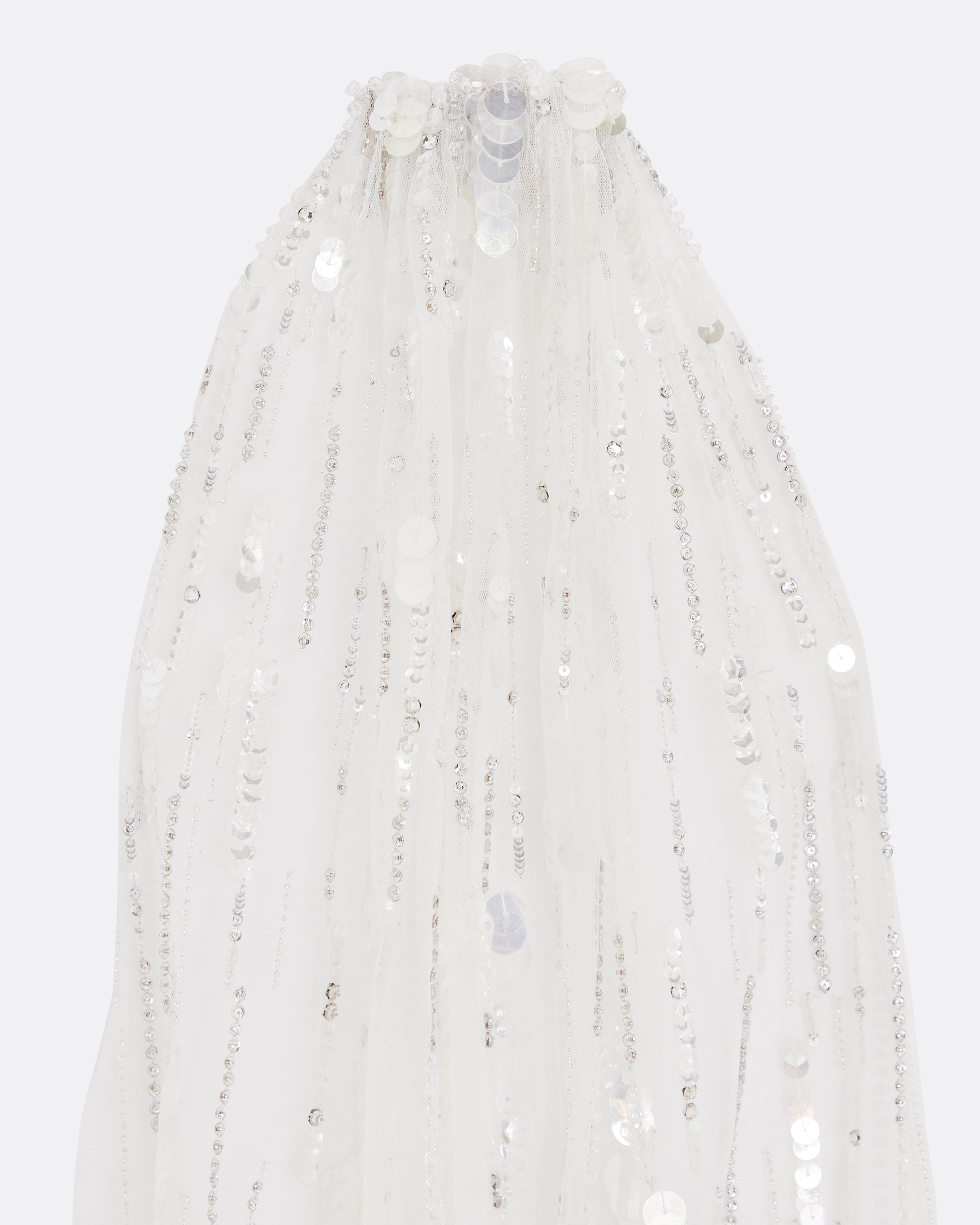 From the Bridal ’26 collection, the Edith veil in ivory is shaped with cascading lines that fall effortlessly to elongate the frame. Crystal accents trace the length, adding subtle luminosity.
