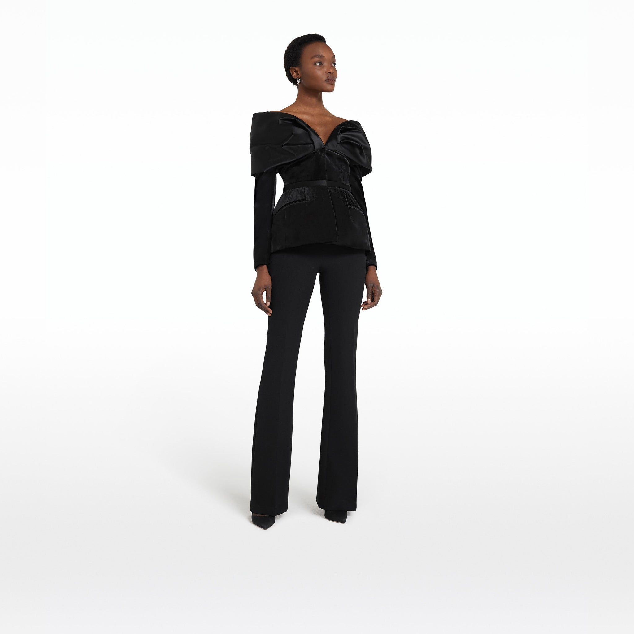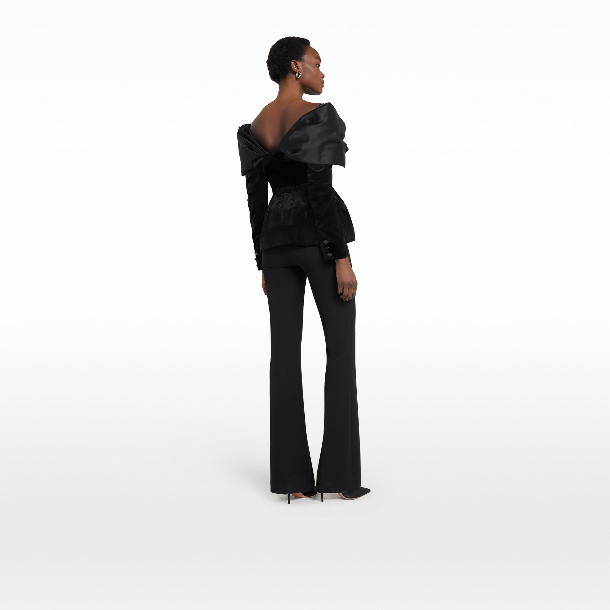 Tailored, sleeveless jacket with off the shoulder statement drape in black Silk Velvet and Duchess Silk.