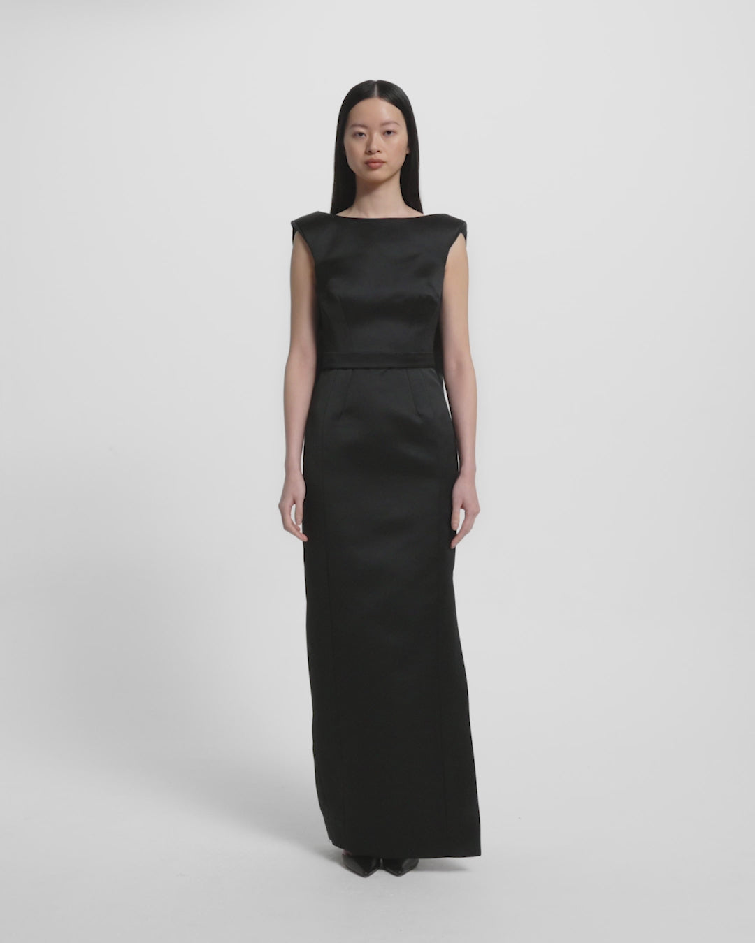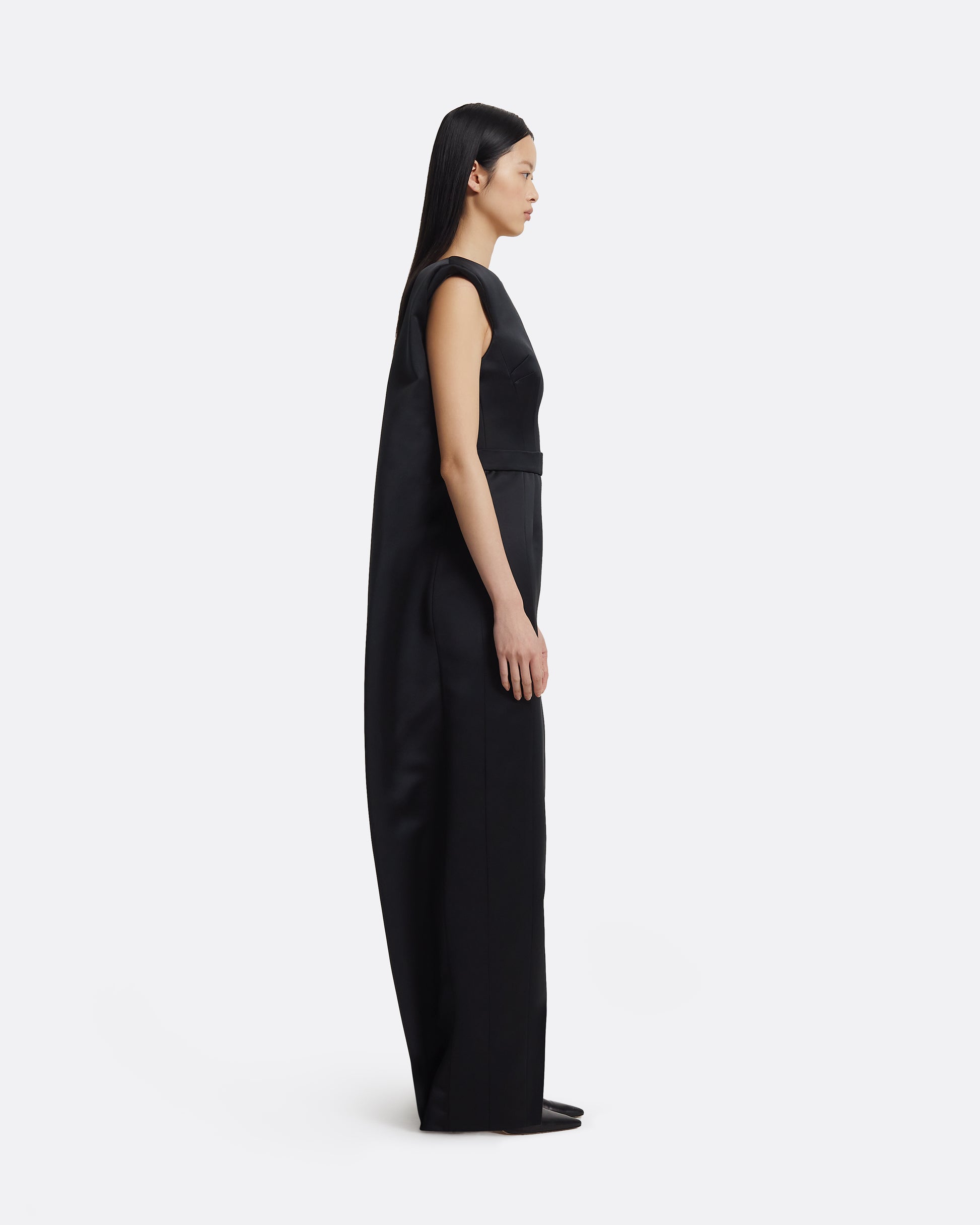From the Autumn Winter '25 collection, the Erica gown in black explores shape through pure, uninterrupted lines. The structured cape detail adds presence to its sleeveless frame, while a side slit lends movement to the pared-back design.