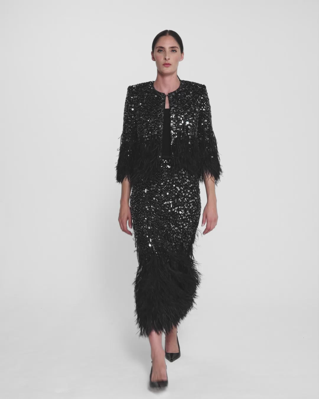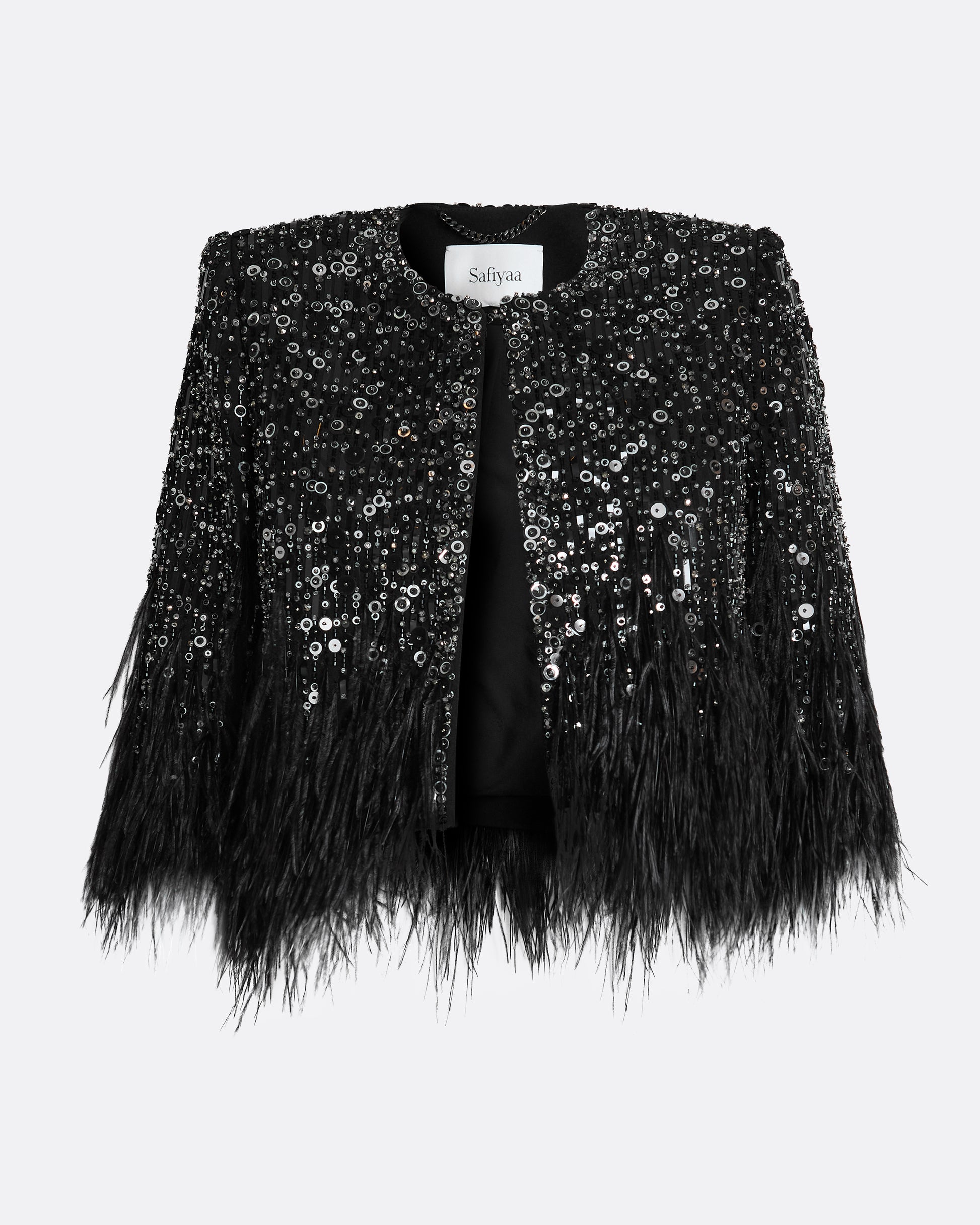 From the Spring Summer ’26 collection, the Fabianna Jacket introduces a considered touch of glamour through texture and movement. A clean, simple silhouette is crafted on a light tulle base, intricately embroidered and finished with feather embellishment that moves fluidly with the body. Designed to pair with the Vivica Skirt for a complete, head-to-toe statement.