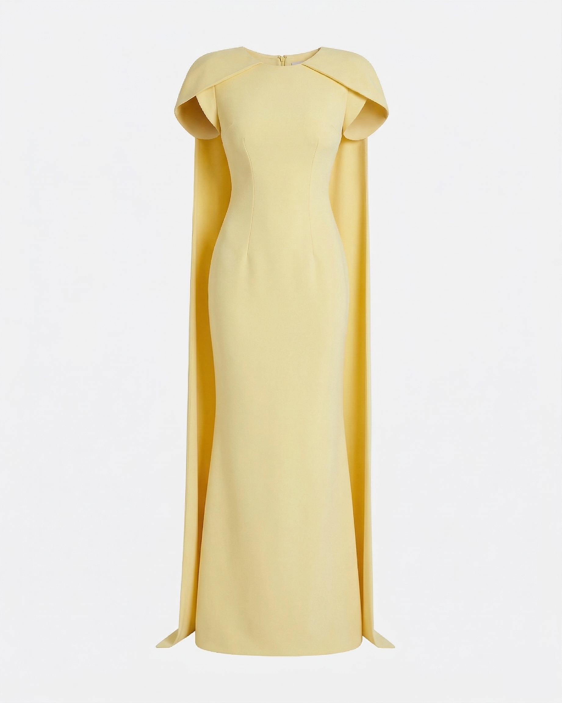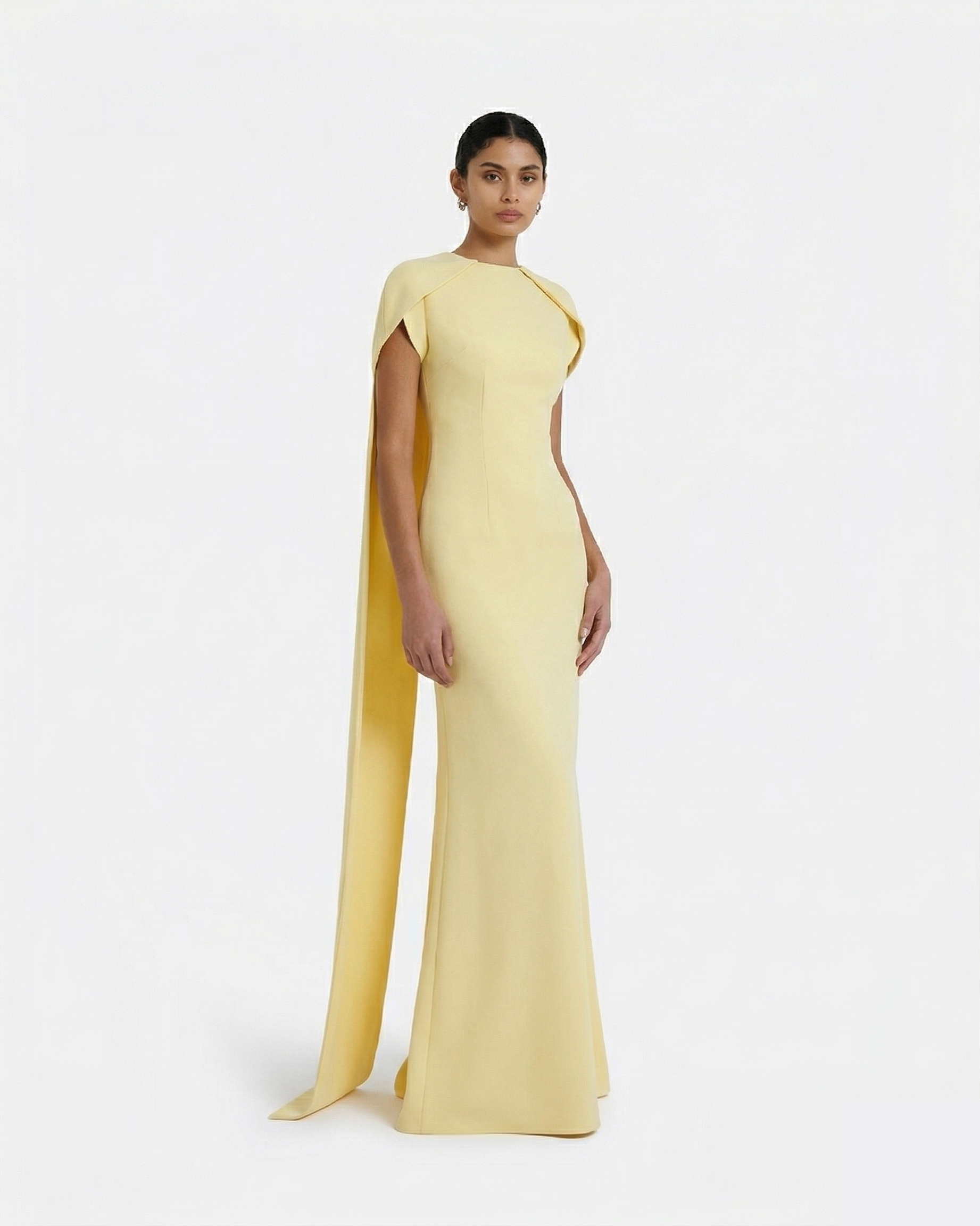 Full-length fitted short sleeve cape dress with a long tailed back with a deep split and covered buttons, in pale yellow.