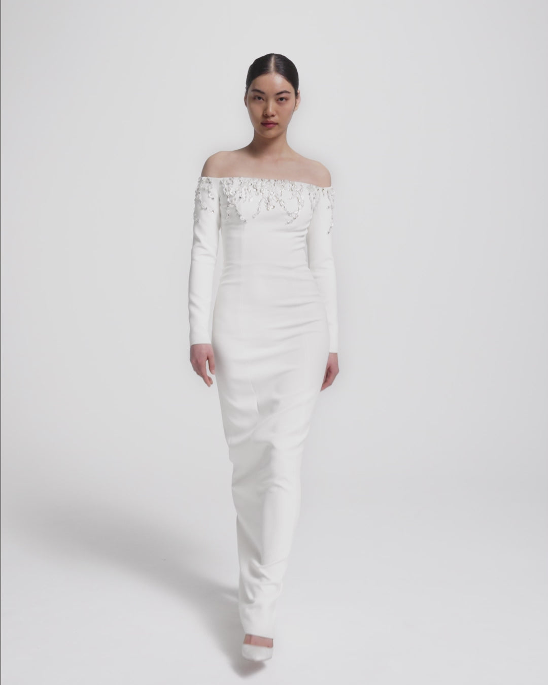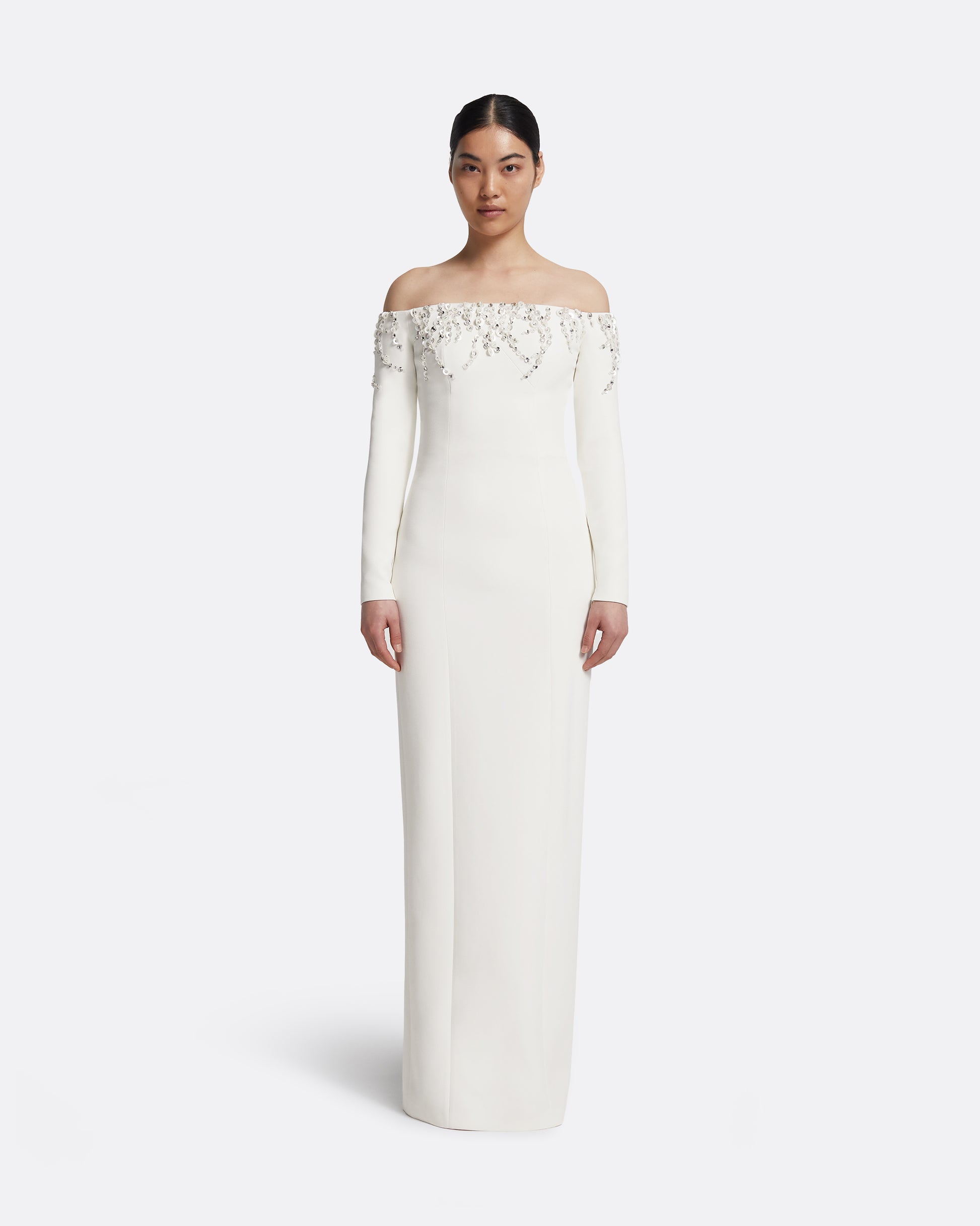 Gioia Long Dress in Ivory with Crystal Embroidery