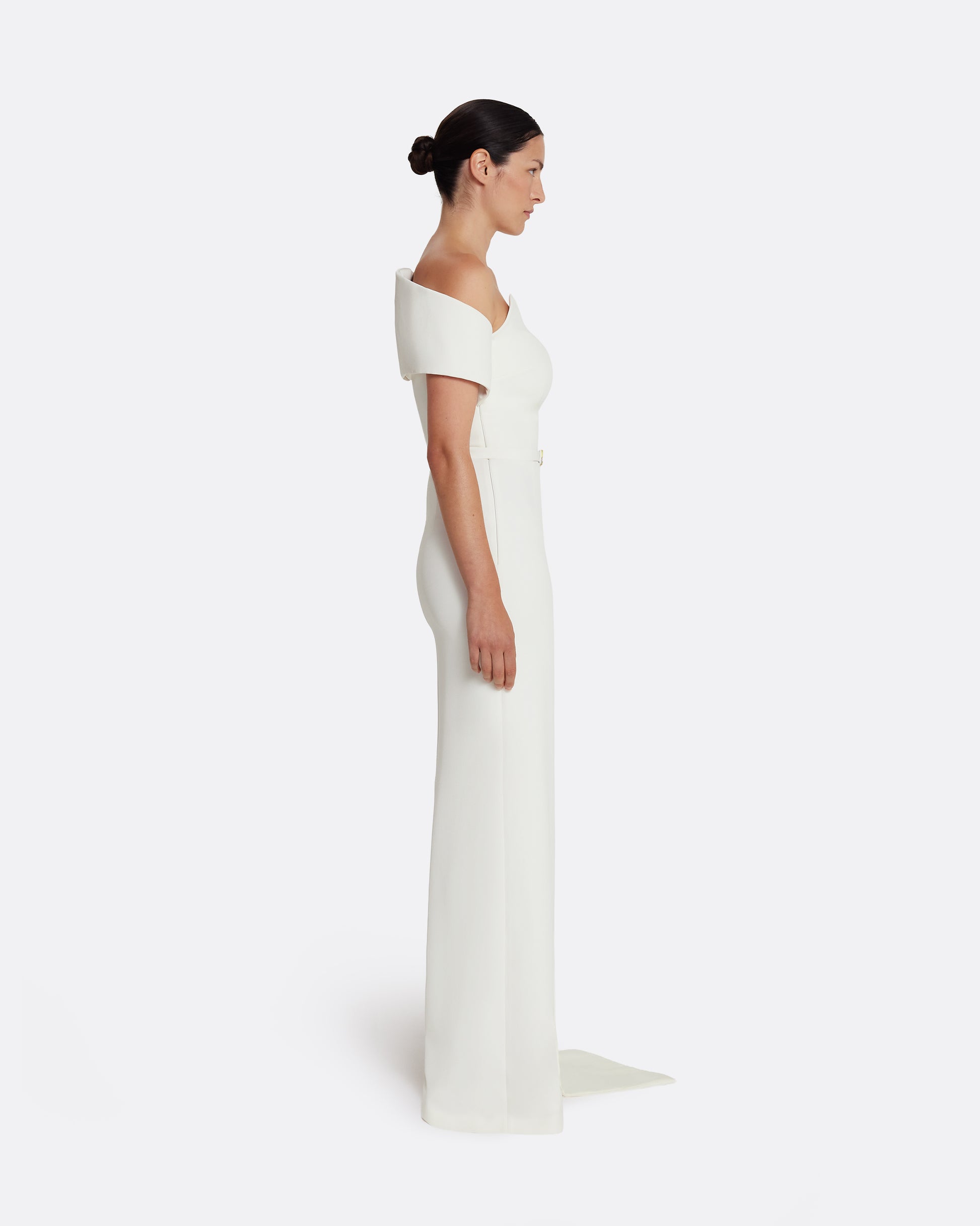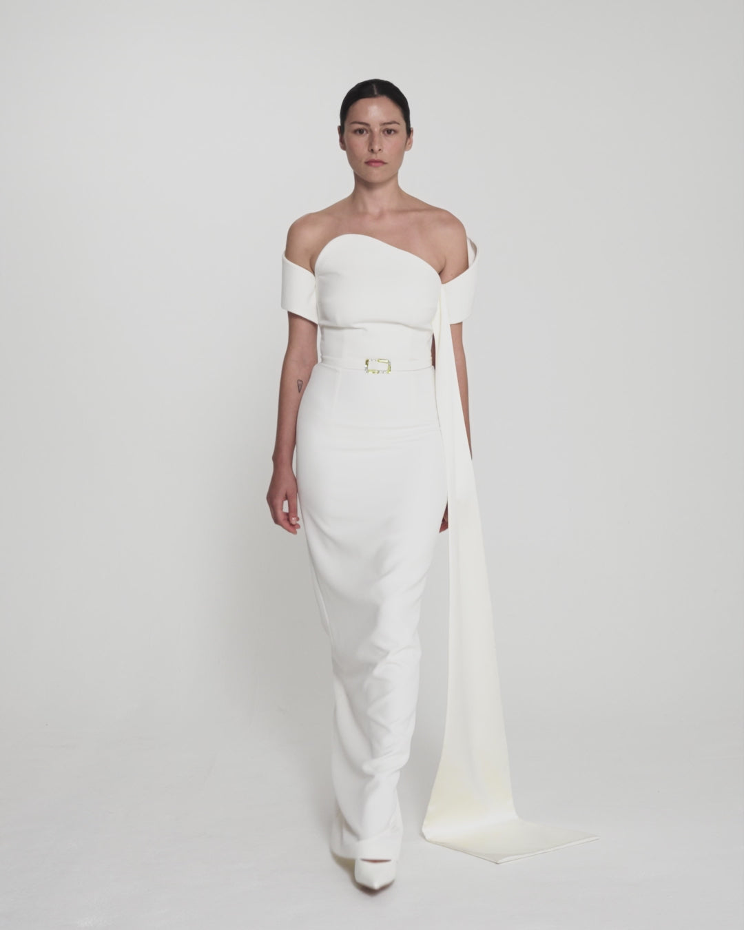 From the Spring Summer ’26 collection, the Giorgia Gown in ivory is defined by a precise, column silhouette. A sash with ivory shine satin stretch introduces subtle contrast paired with a structured shoulder detail.