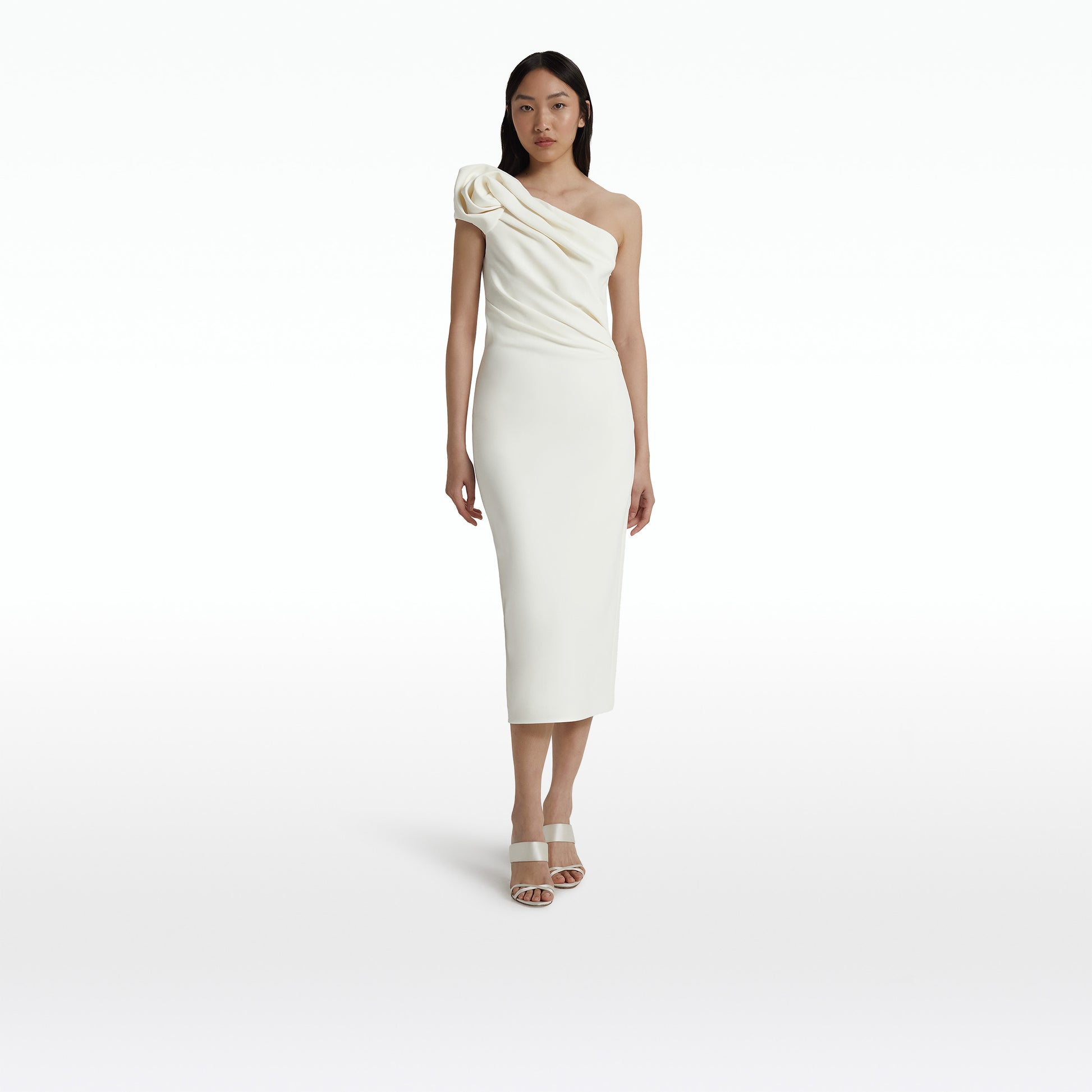 Cocktail dress with pleated bodice drape in ivory Heavy Crepe.