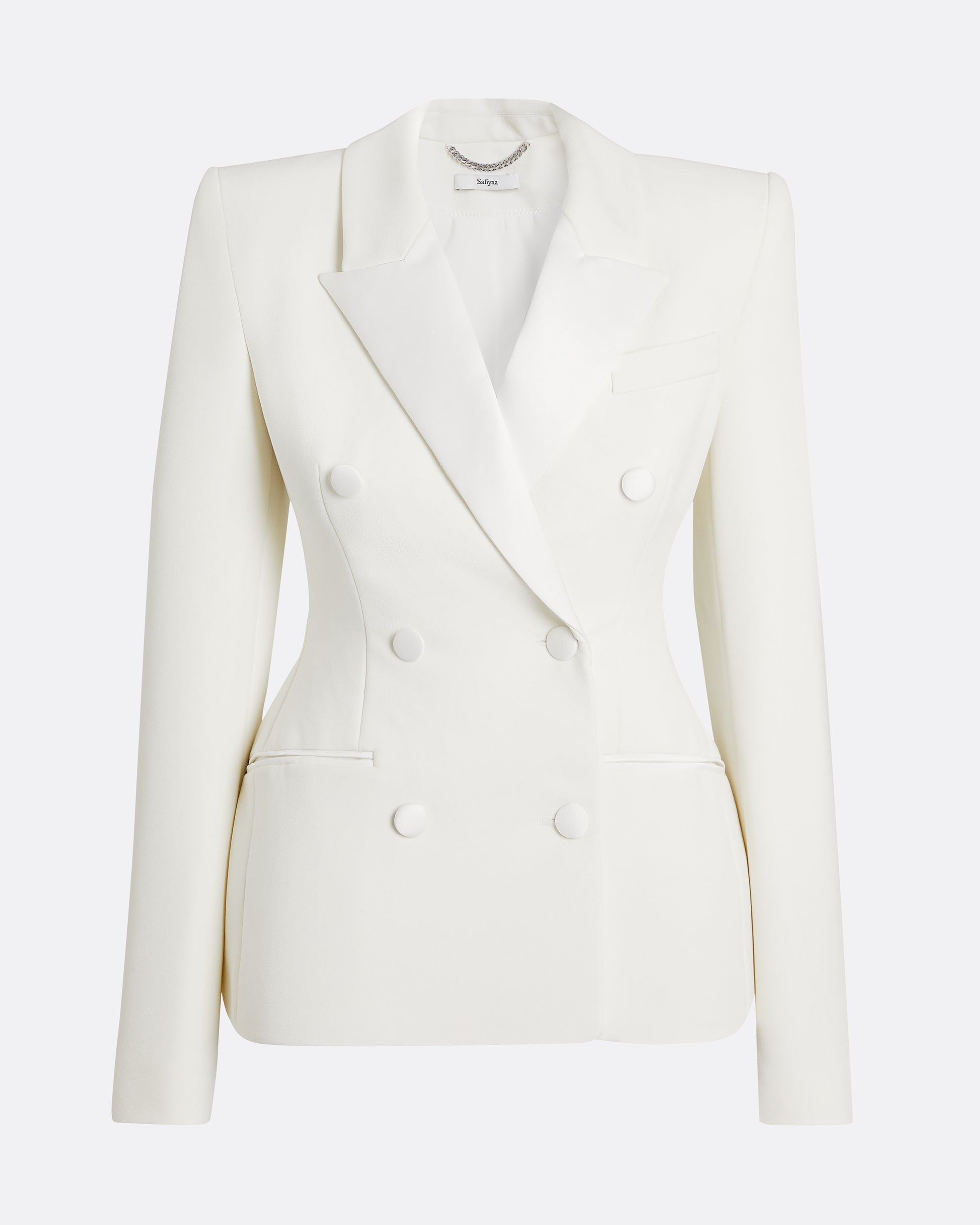 From the Bridal ’26 collection, the Gulsen jacket in porcelain on ivory channels a commanding silhouette through sharp tailoring and bold proportion. Designed to define, it brings modern structure to power dressing.