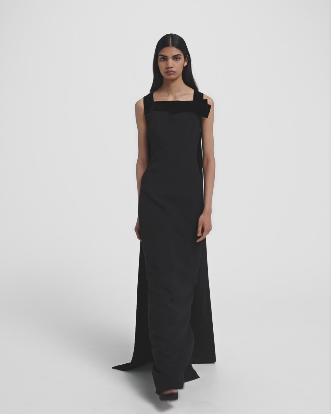 From the Resort ’26 collection, the Harley dress in black strikes a balance between structure and distinction. A floor-length cape falls seamlessly from the shoulders, while bow accents at the square neckline introduce a sculptural touch.