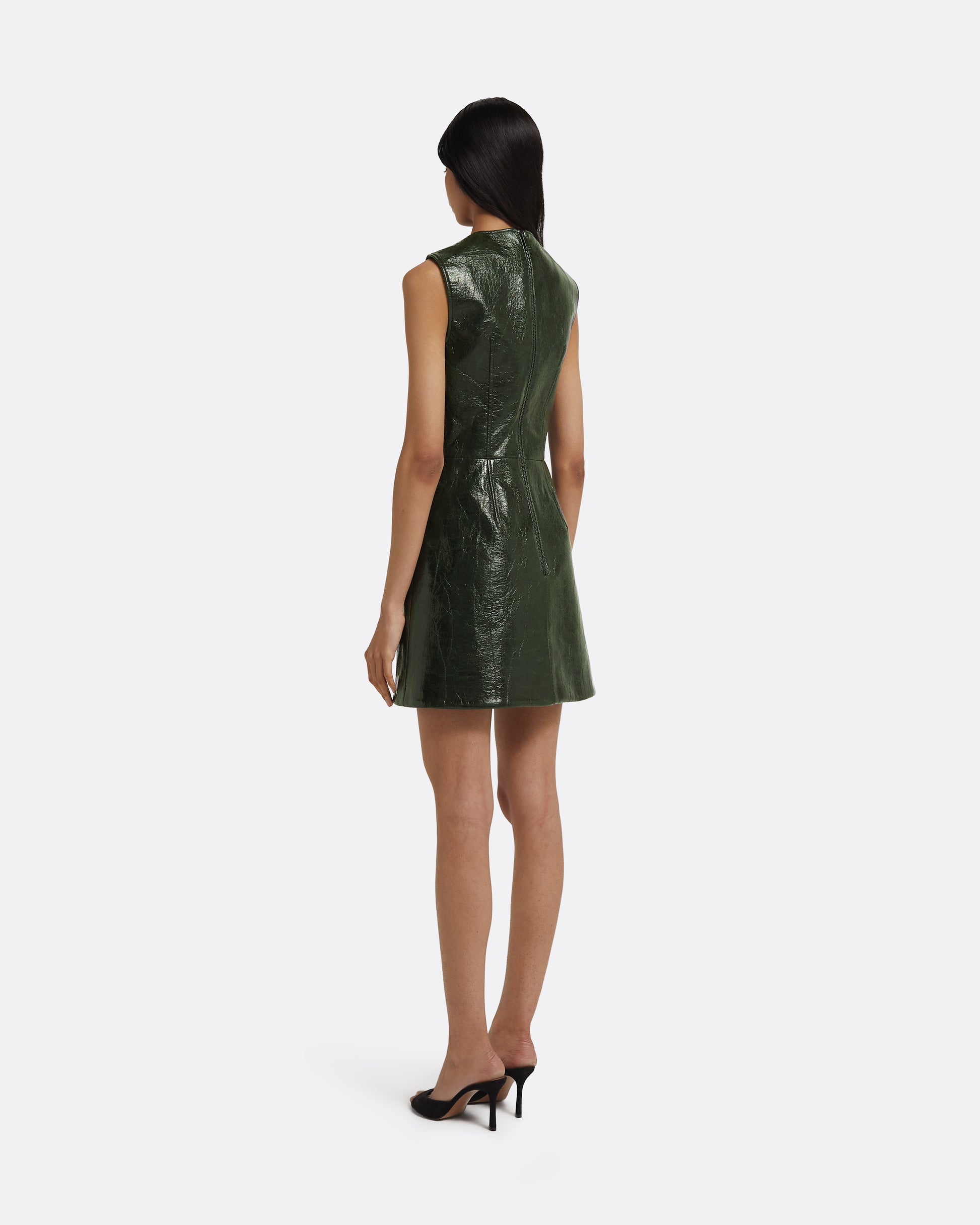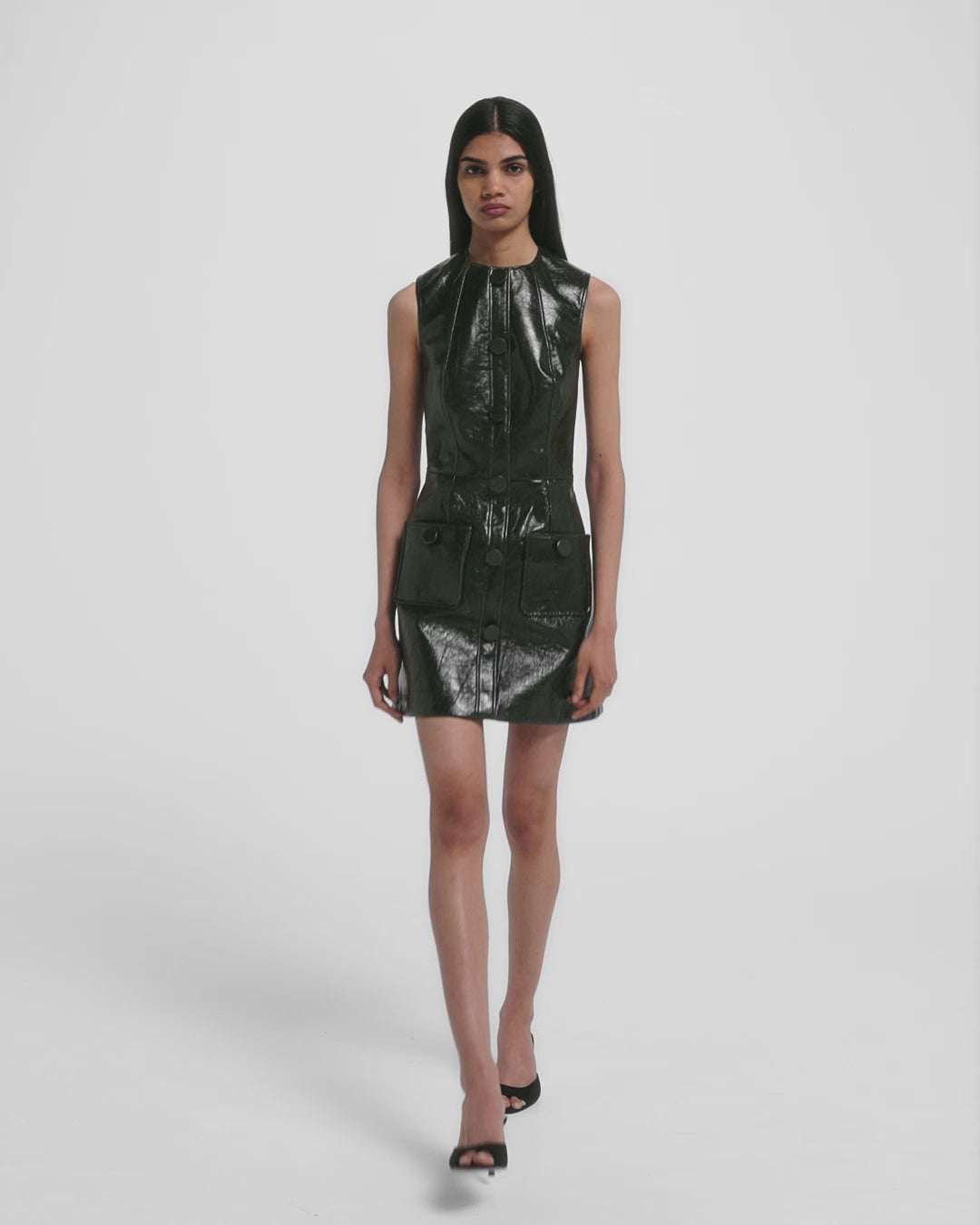 From the Resort ’26 collection, the Hunter dress in collard green captures a modern edge with its high-shine finish and precise tailoring. The glossy surface enhances the clean cut, giving a sculpted sense of presence to this short style.