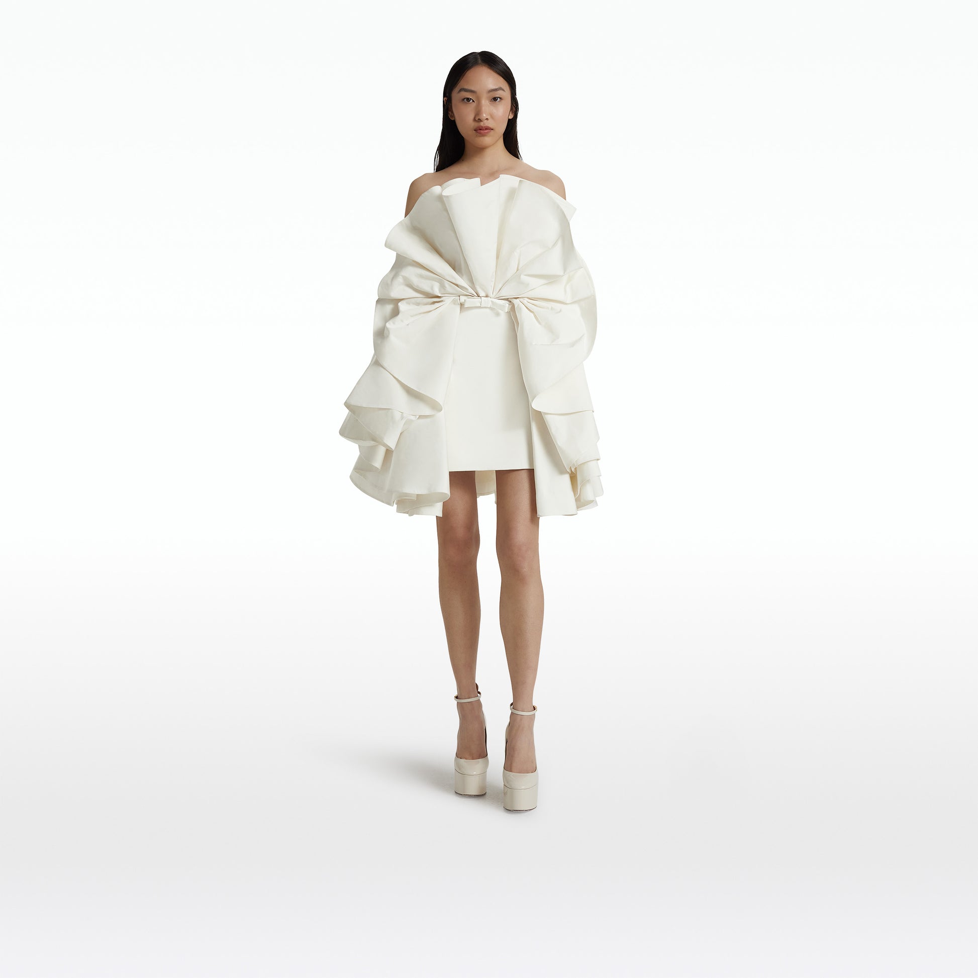 Striking mini dress with contrast ruffle drape in ivory Heavy Crepe, Faille and Satin Back Crepe.