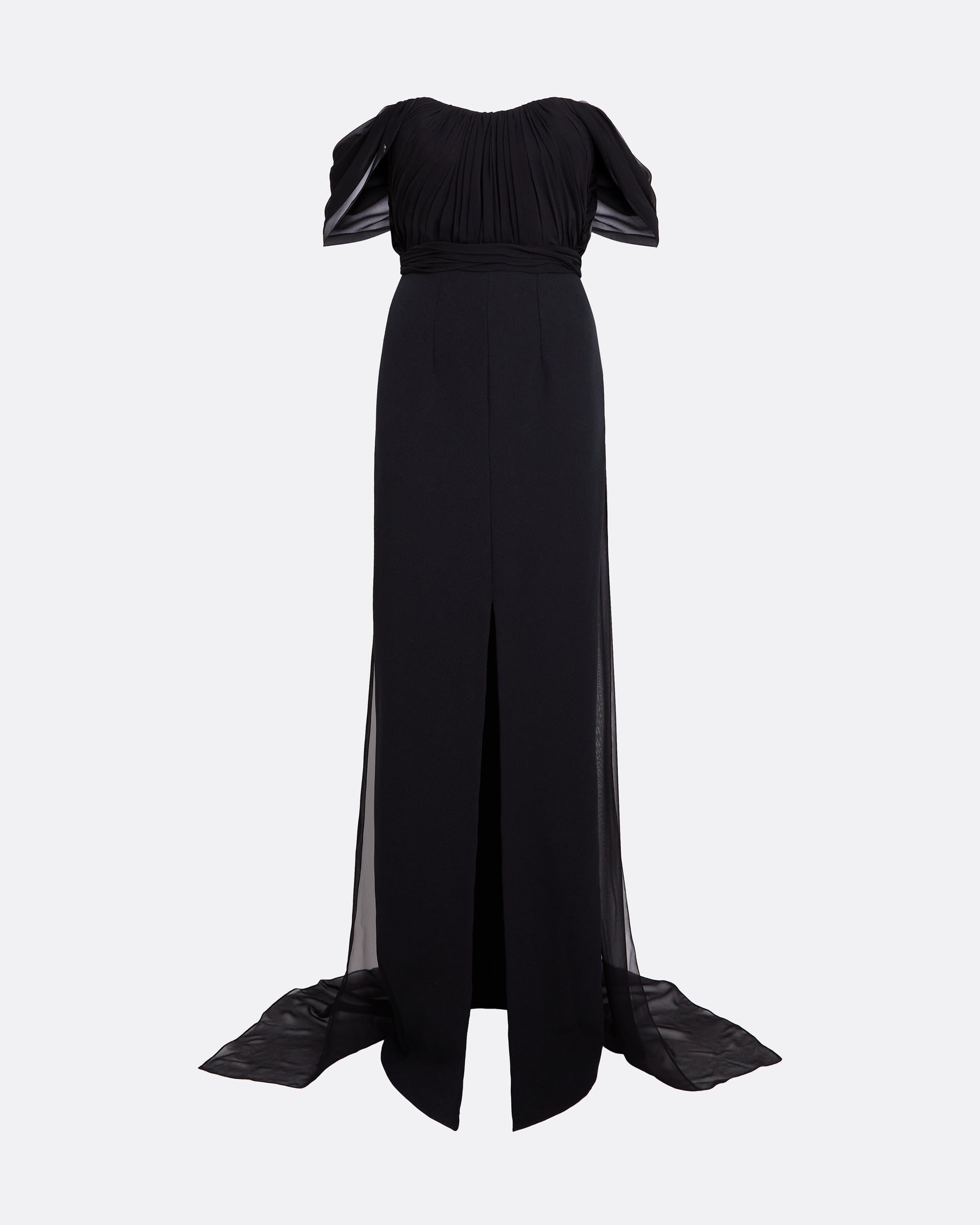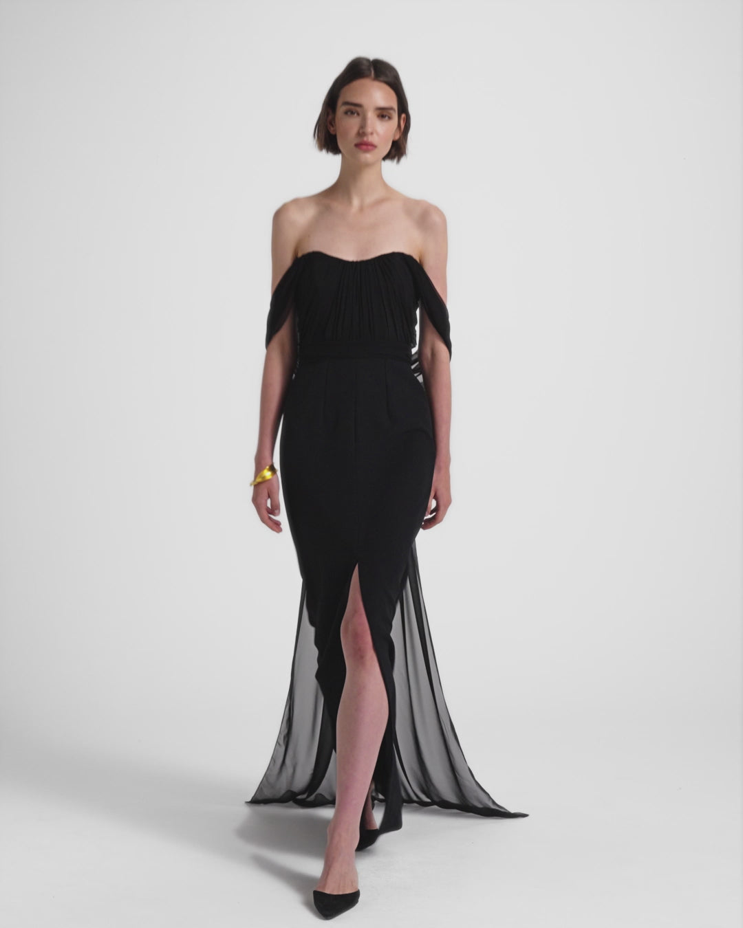 From the Pre-Fall ’26 collection, the Iselle Long Dress in blackis an evening gown designed for formal occasion dressing. A micro chiffon bodice is softly draped, falling into a structured Heavy Crepe column skirt with a front slit that introduces fluid movement and ease.