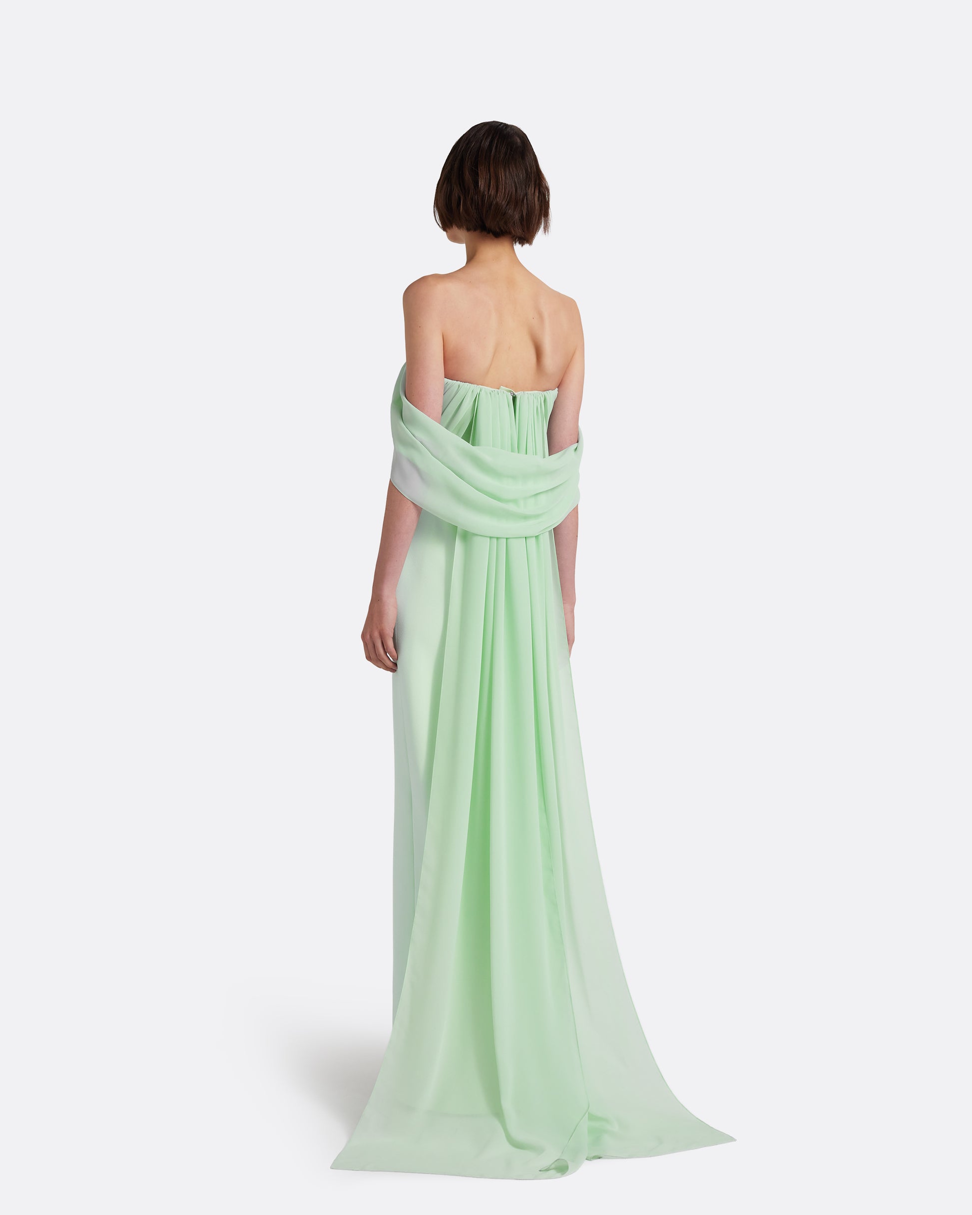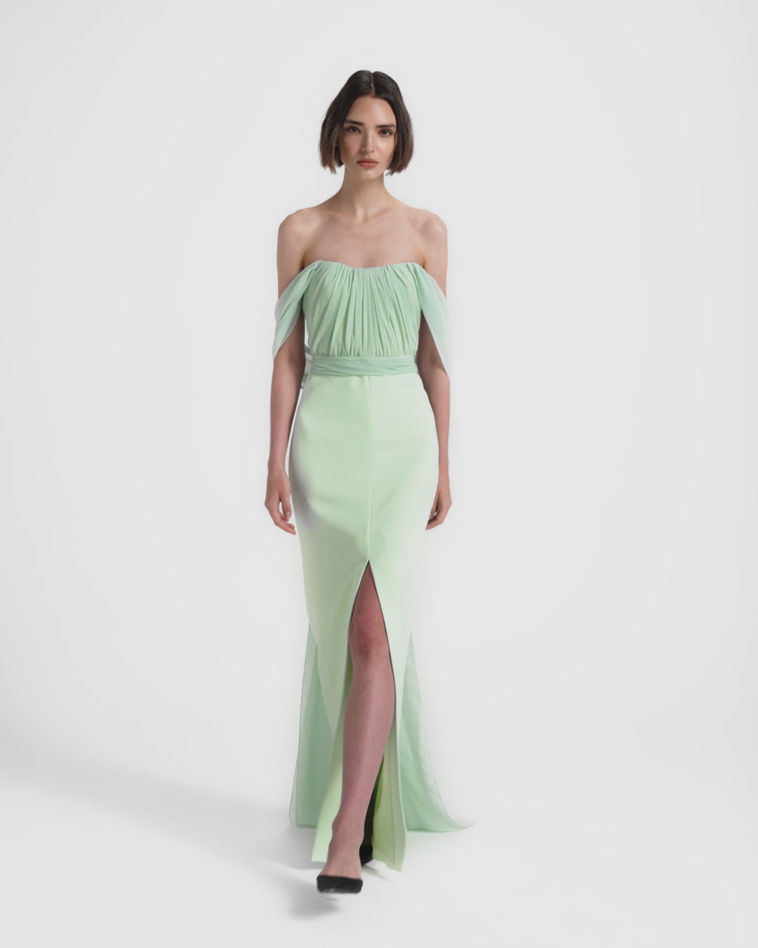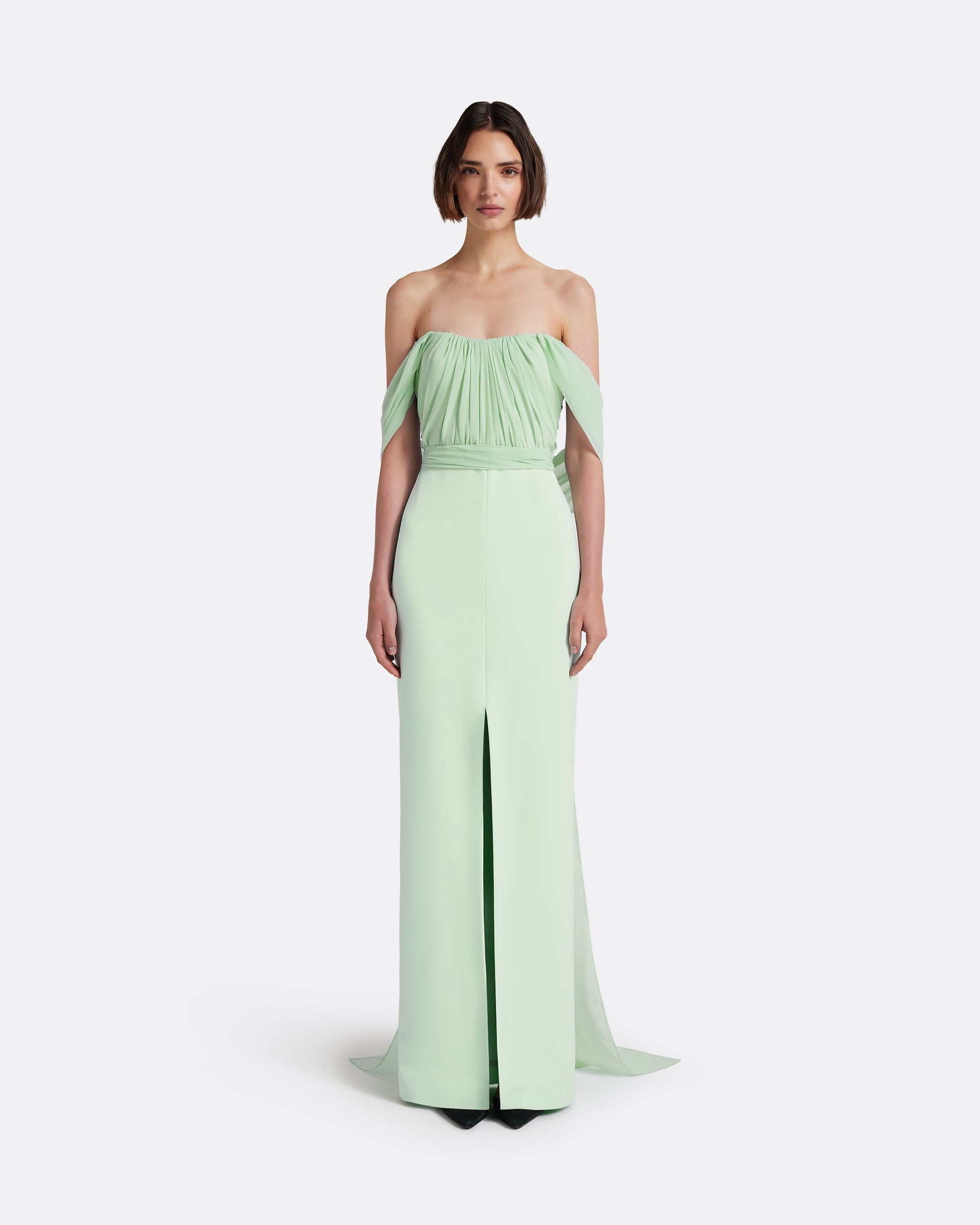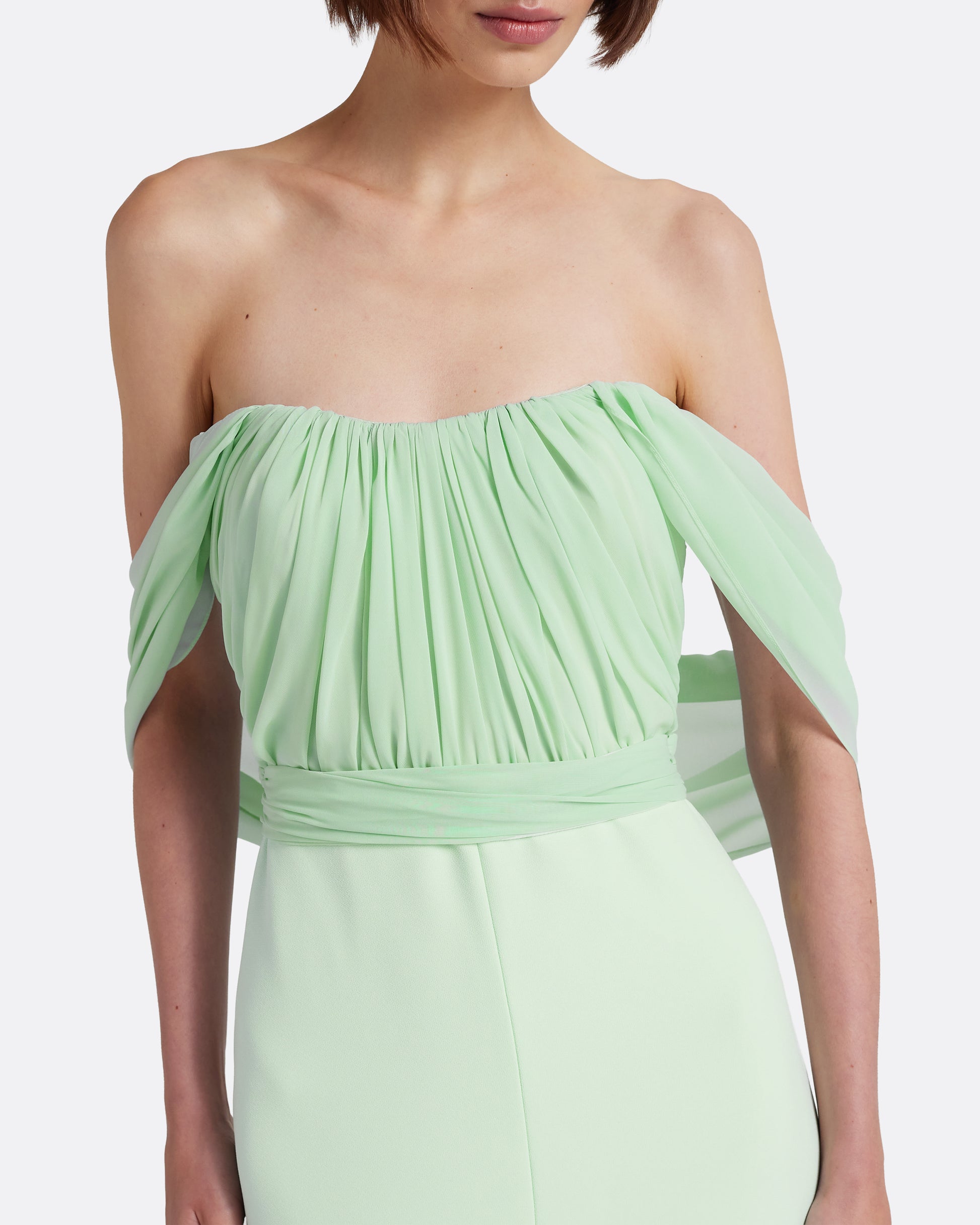 From the Pre-Fall ’26 collection, the Iselle Long Dress in sea glass is an evening gown designed for wedding guest, bridesmaid and formal occasion dressing. A micro chiffon bodice is softly draped, falling into a structured Heavy Crepe column skirt with a front slit that introduces fluid movement and ease.