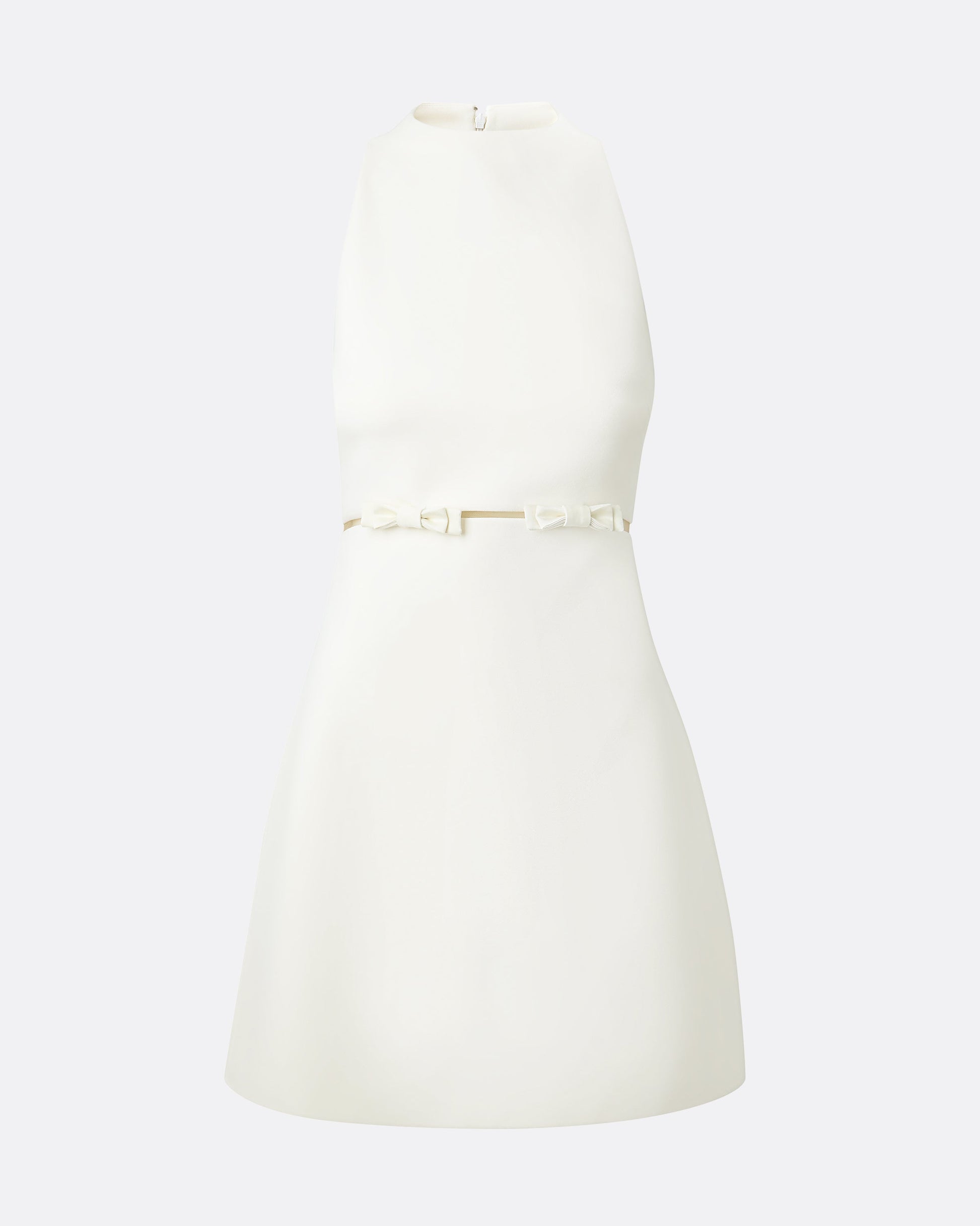 A-line mini dress with racer neck and bow detail in ivory Heavy Crepe with ivory Satin Bow embroidery.