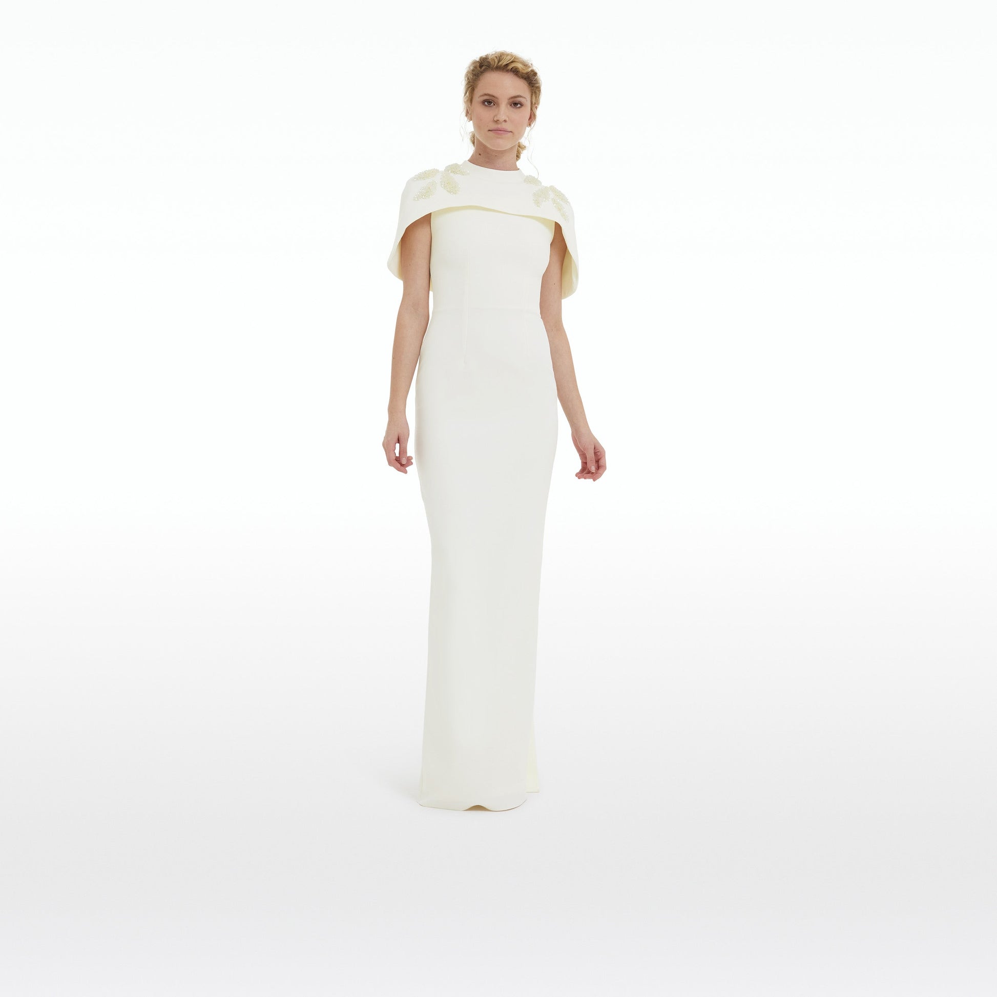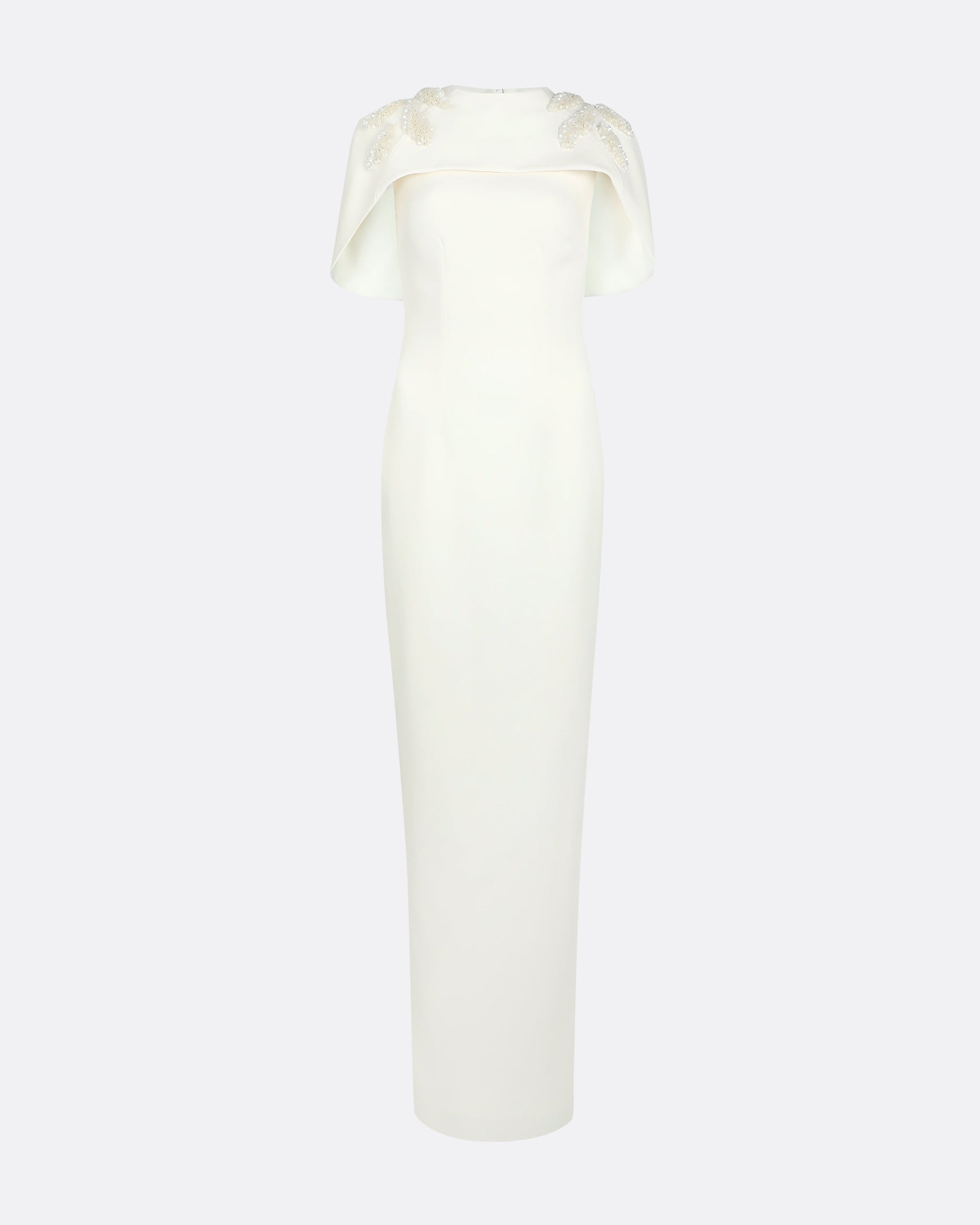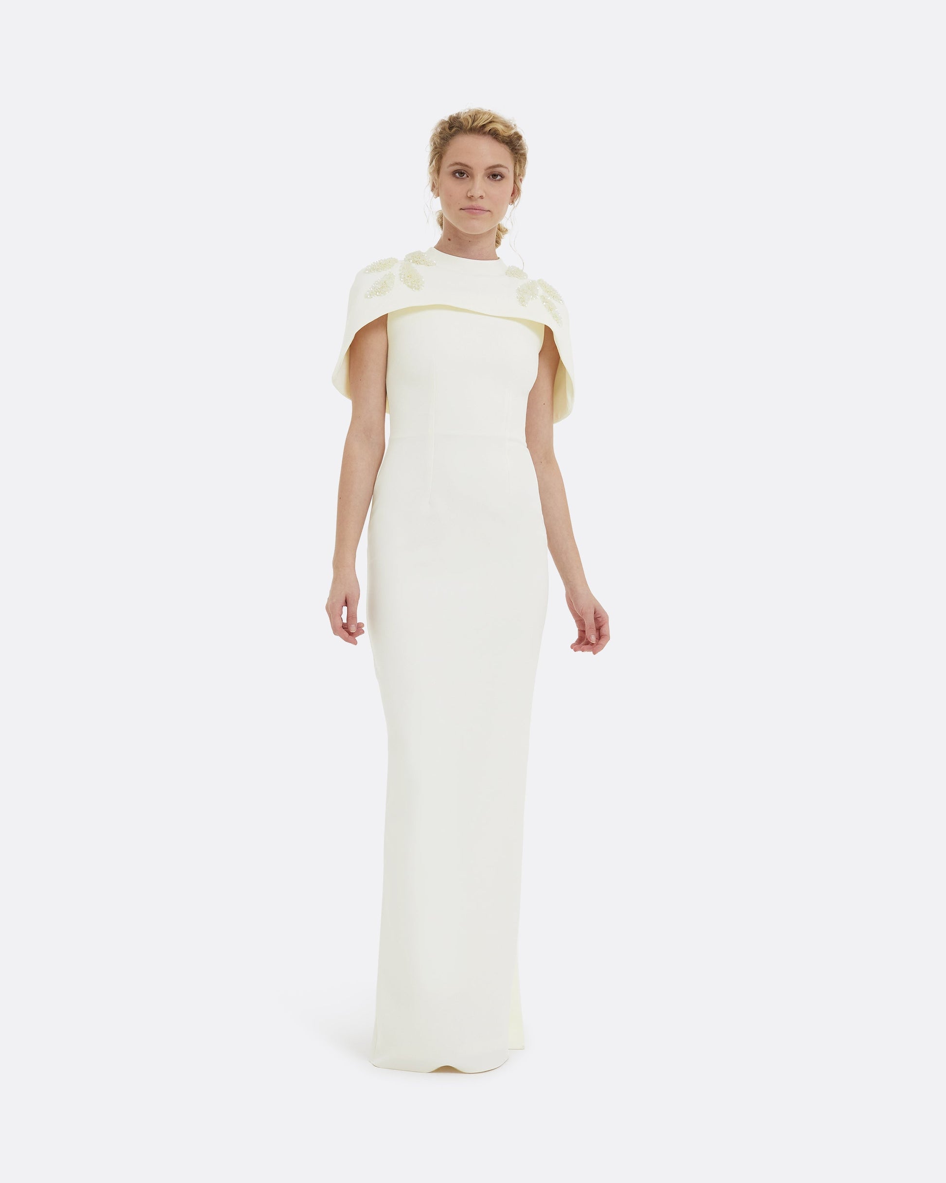 Raised collar long dress with Curled Leaf embroidered shoulder cape and back drape detail. Item fully lined.