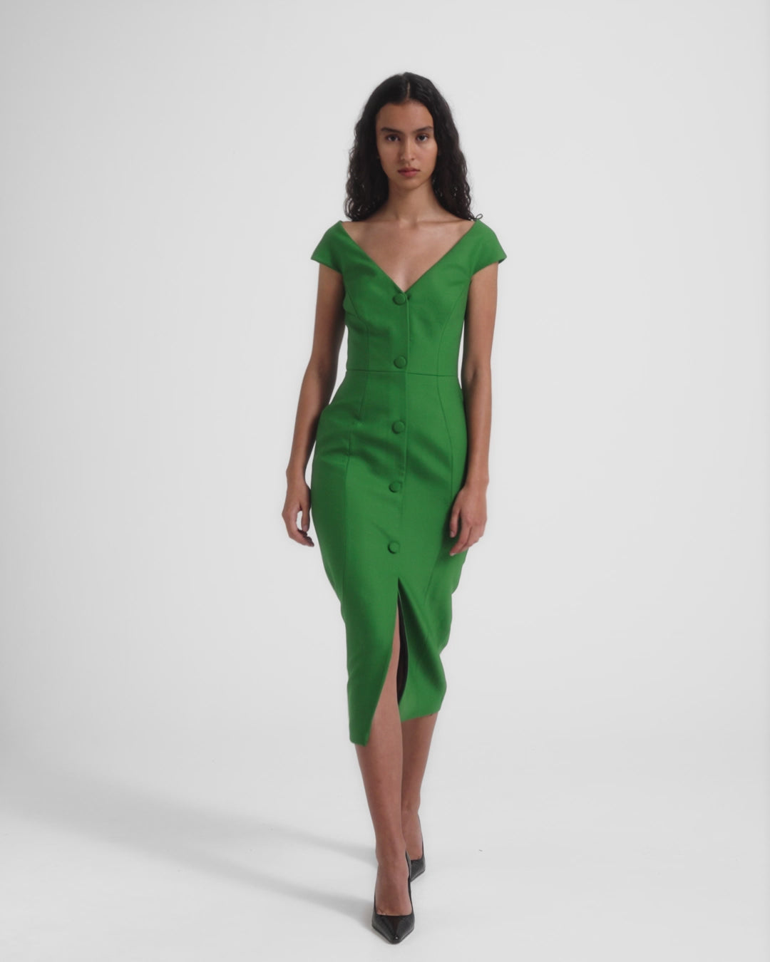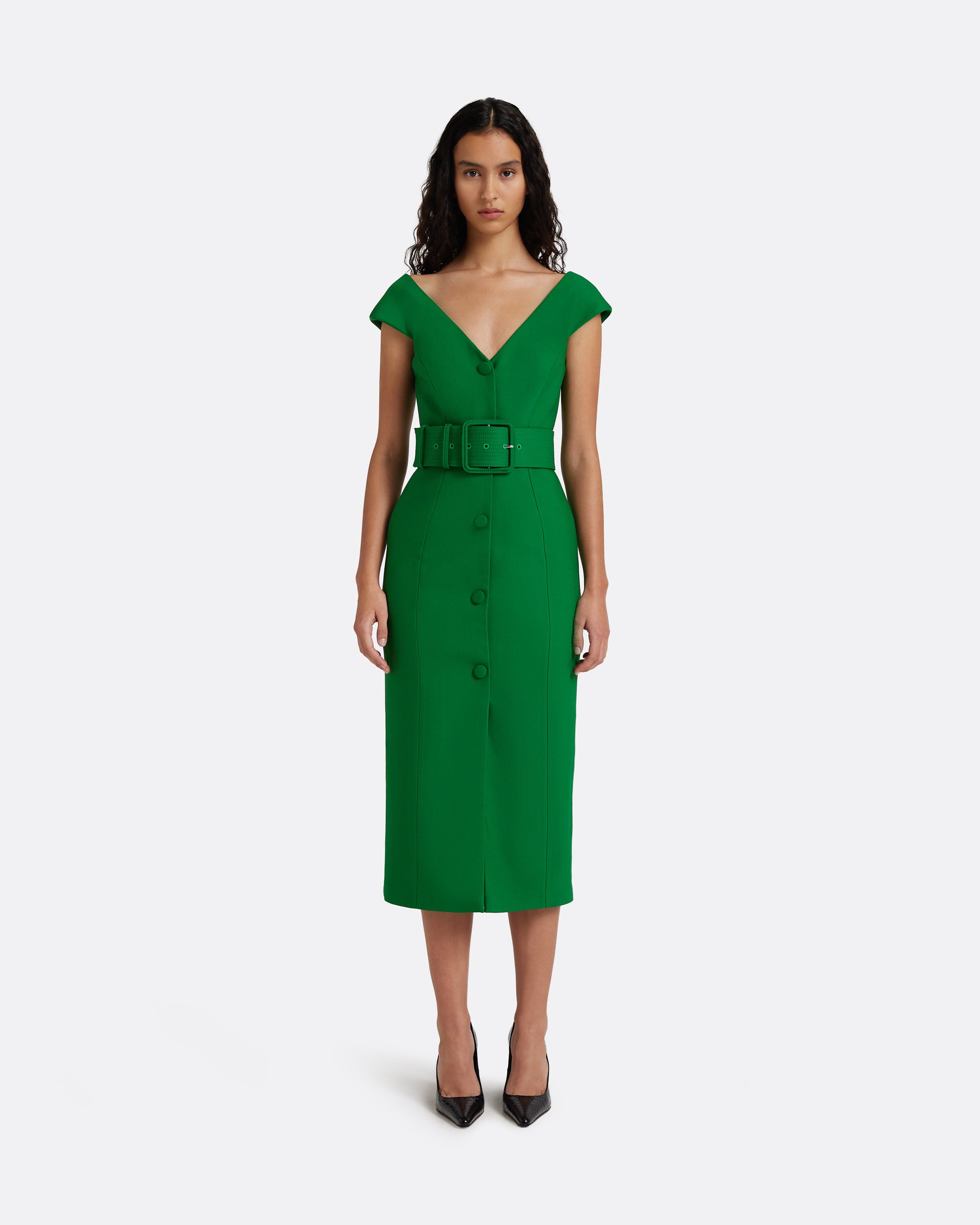 From the Pre-Fall ’26 collection, the Klea Midi Dress in blade green wool offers a refined take on tailored daywear and workwear dressing. Cut to a structured midi silhouette with cap sleeves, it features self-covered buttons through the front for a clean, polished finish. Designed to be styled with the Waltonz Belt for a defined waist.