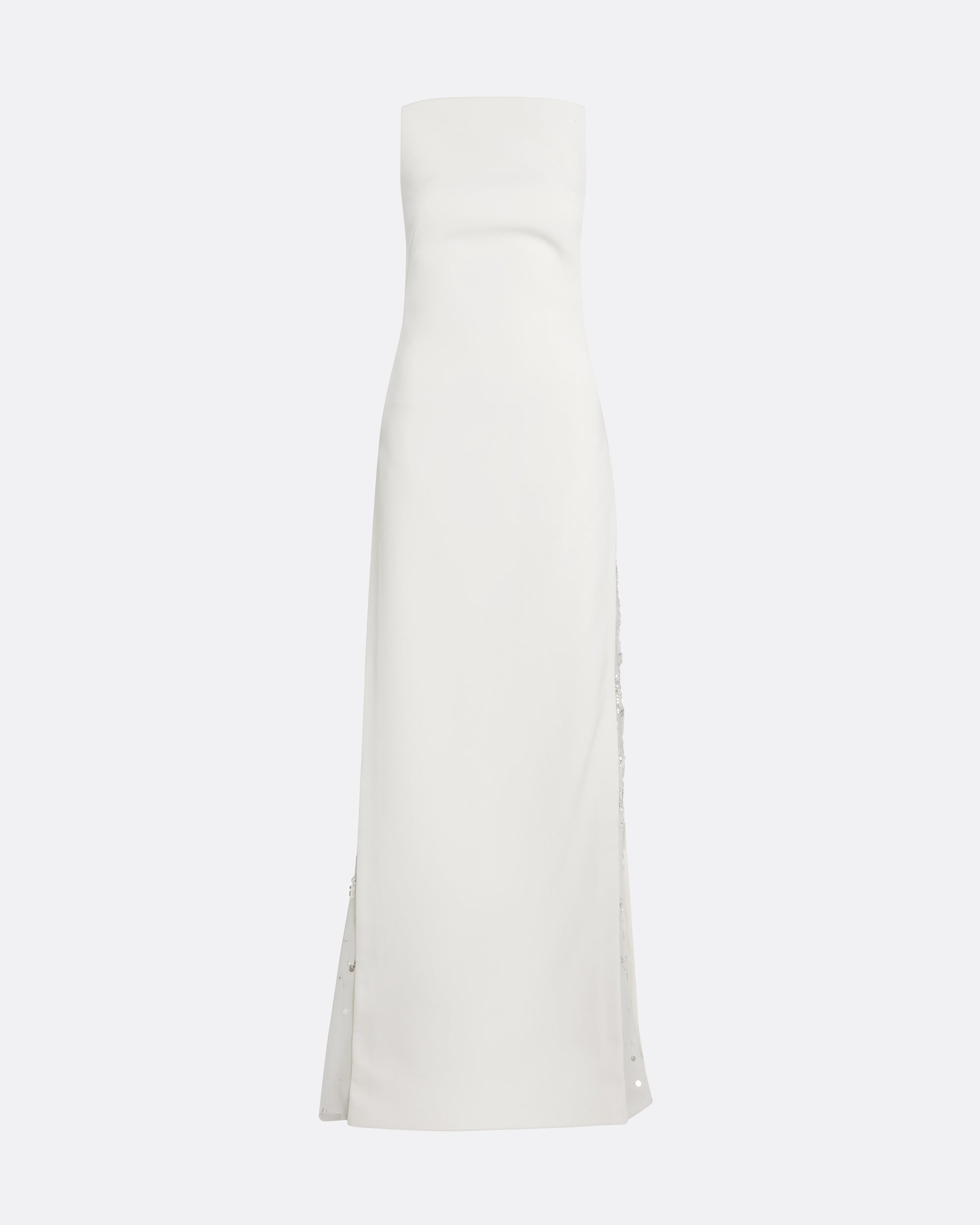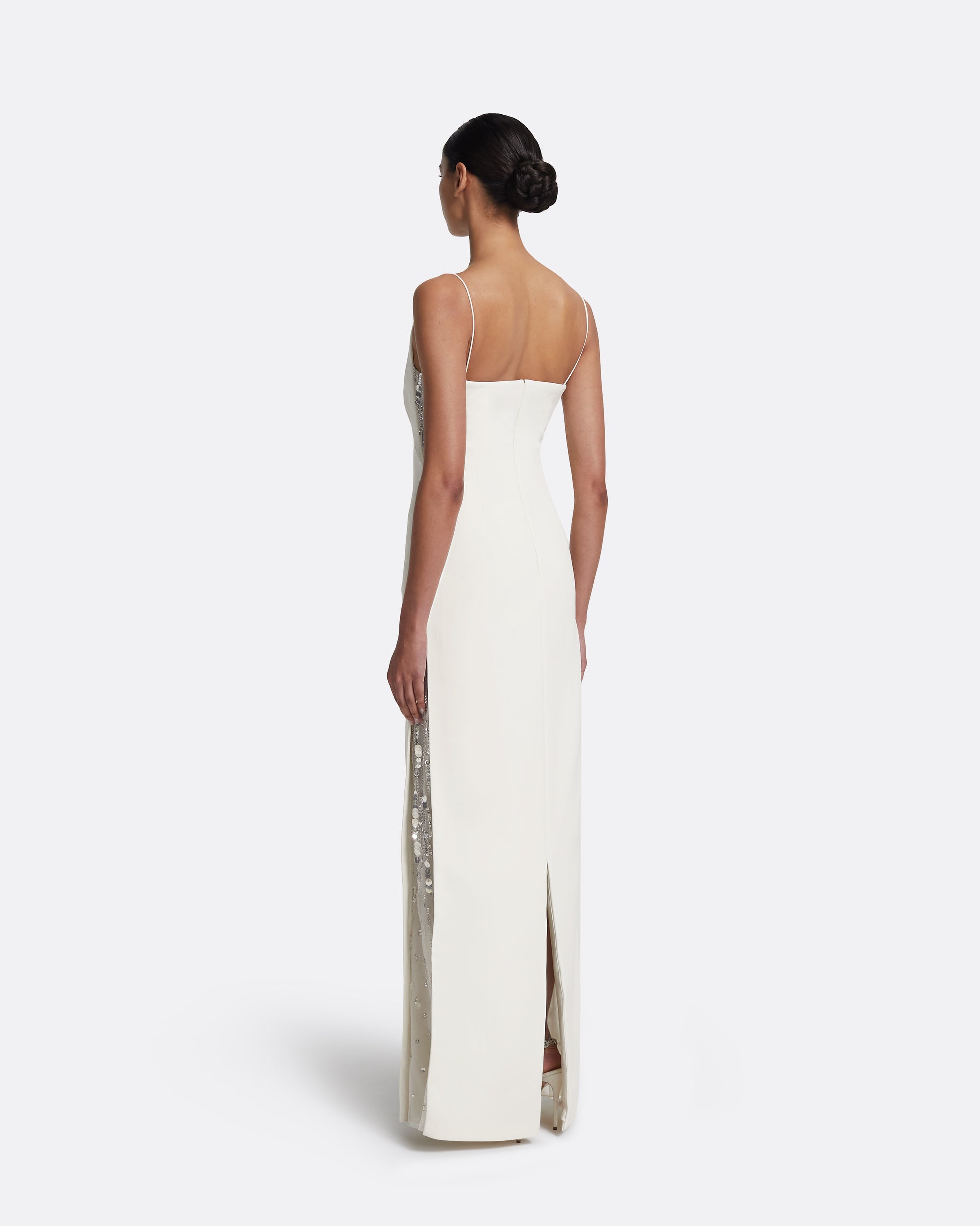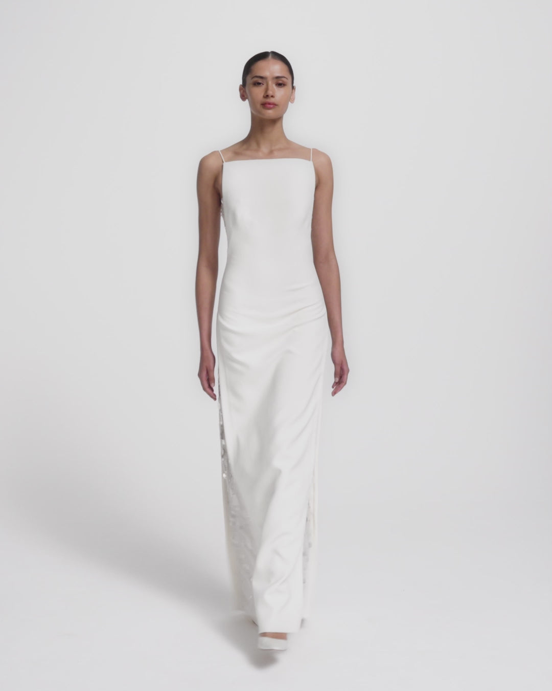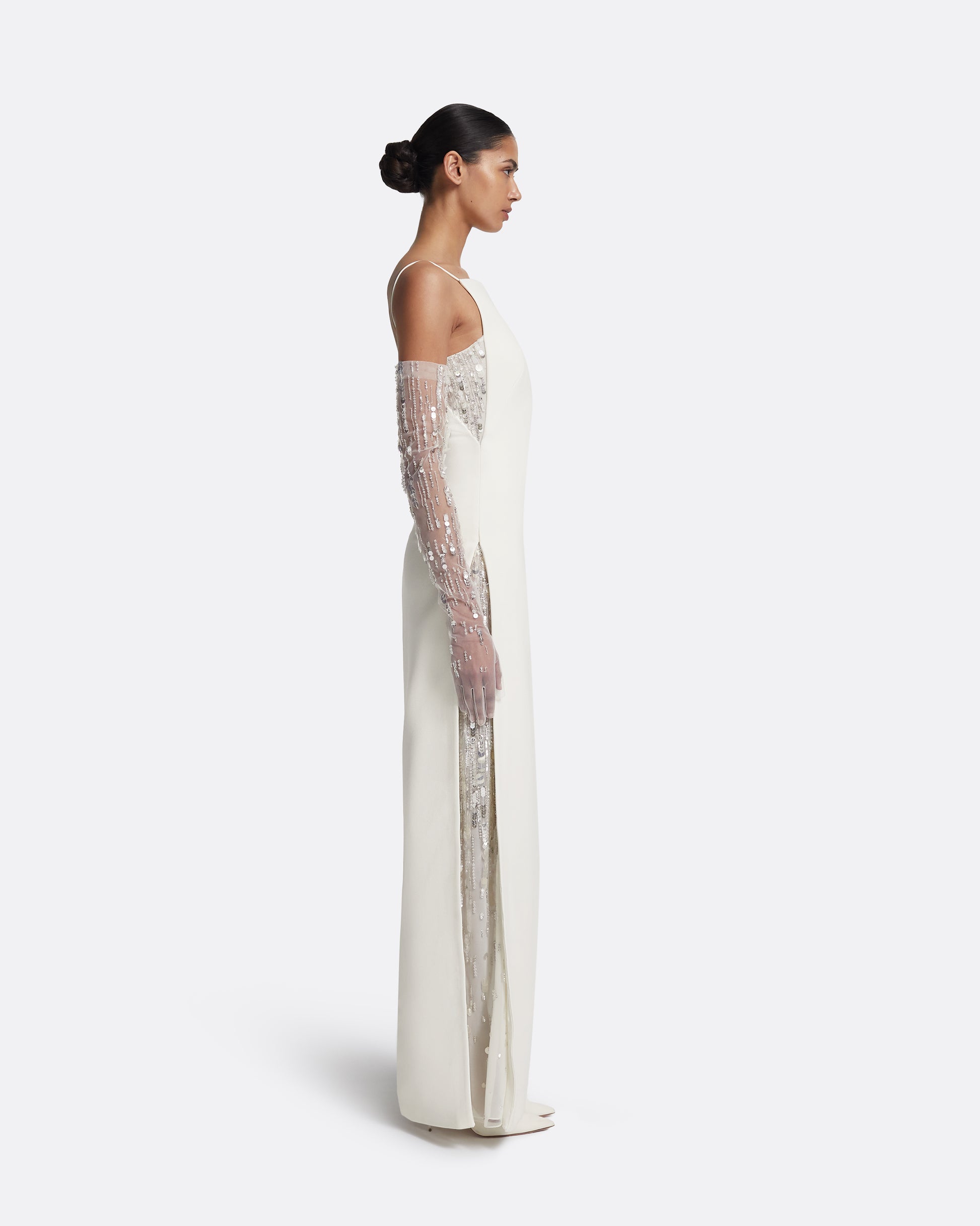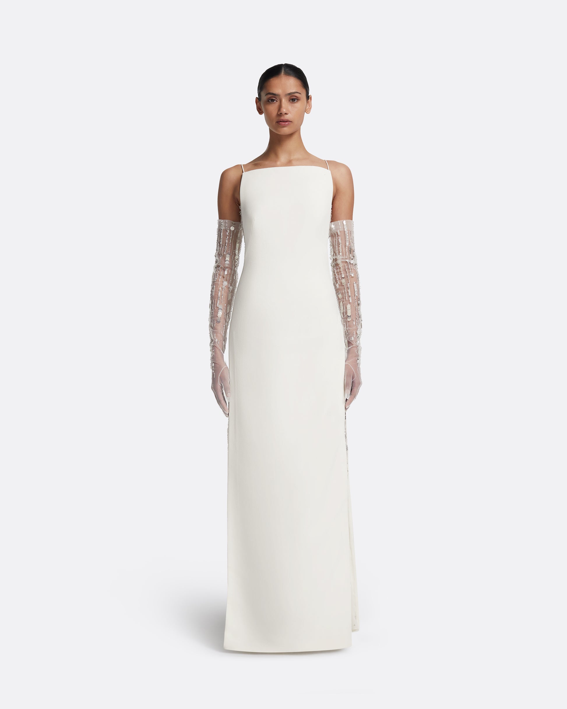 From the Bridal '26 collection, the Leanne gown in ivory with crystal embellishments is a bold expression of sculptural design. Its architectural neckline and graceful lines create a commanding presence in eveningwear.