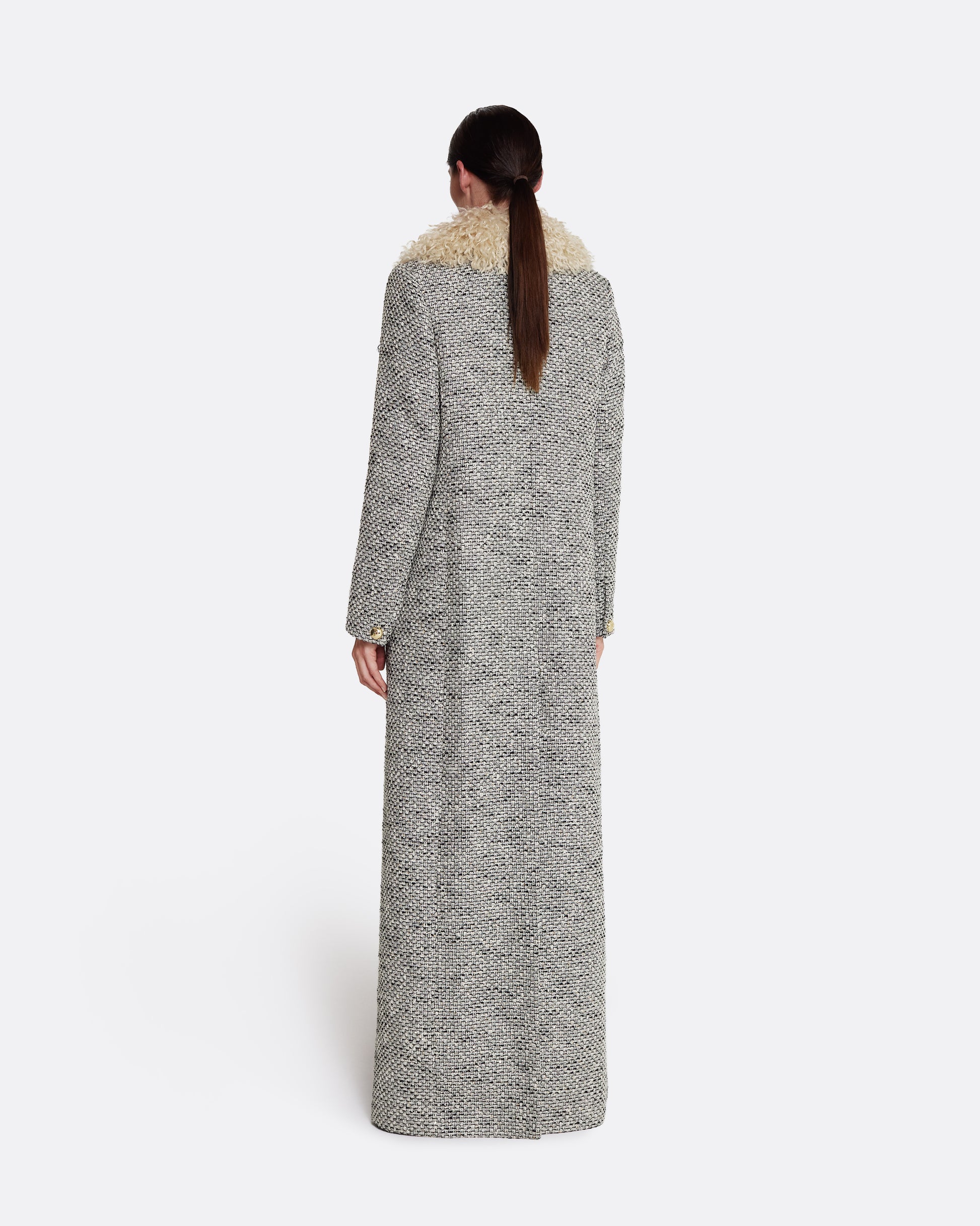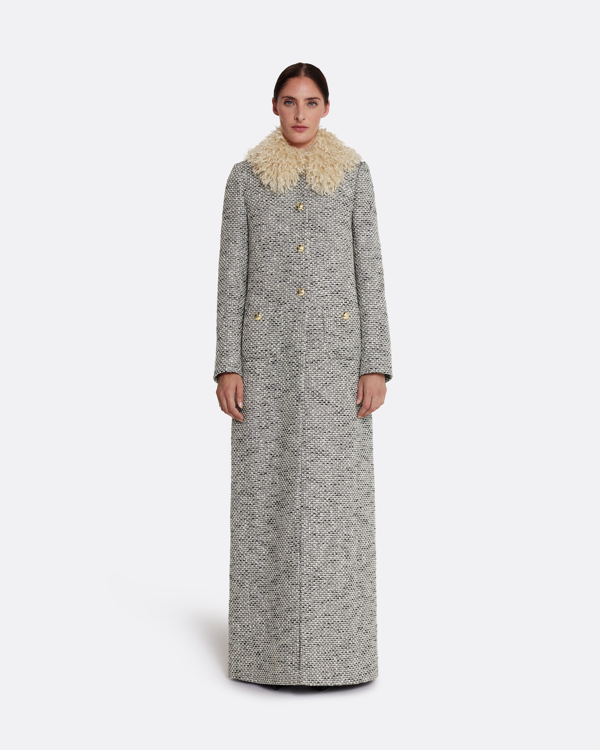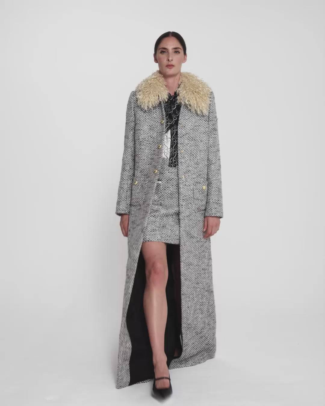 From the Spring Summer ’26 collection, the Leonora Coat in greyscale reimagines classic tailoring with sculptural flair. The longline cut is punctuated by a bold shearling collar and gold-tone buttons, creating a strong statement in texture and proportion.