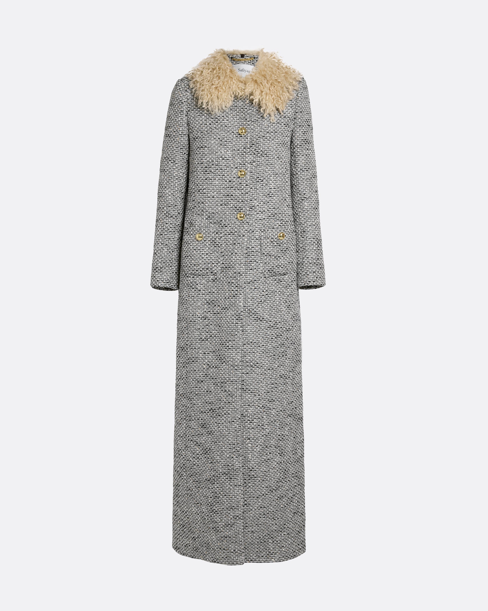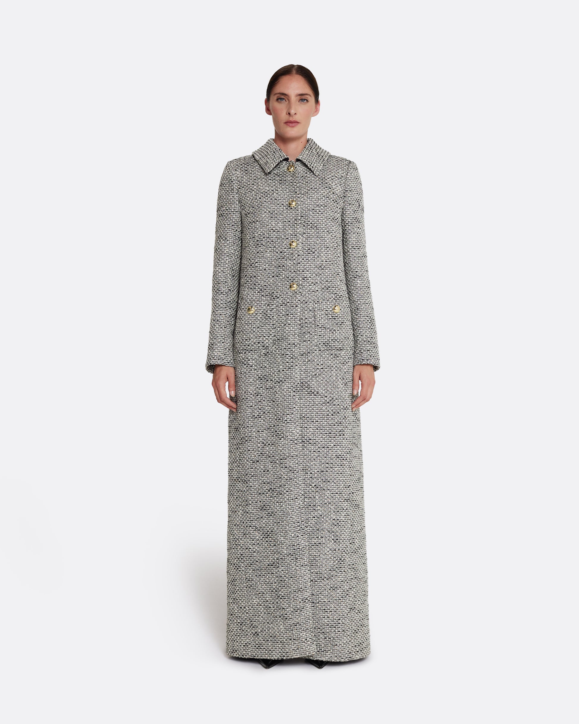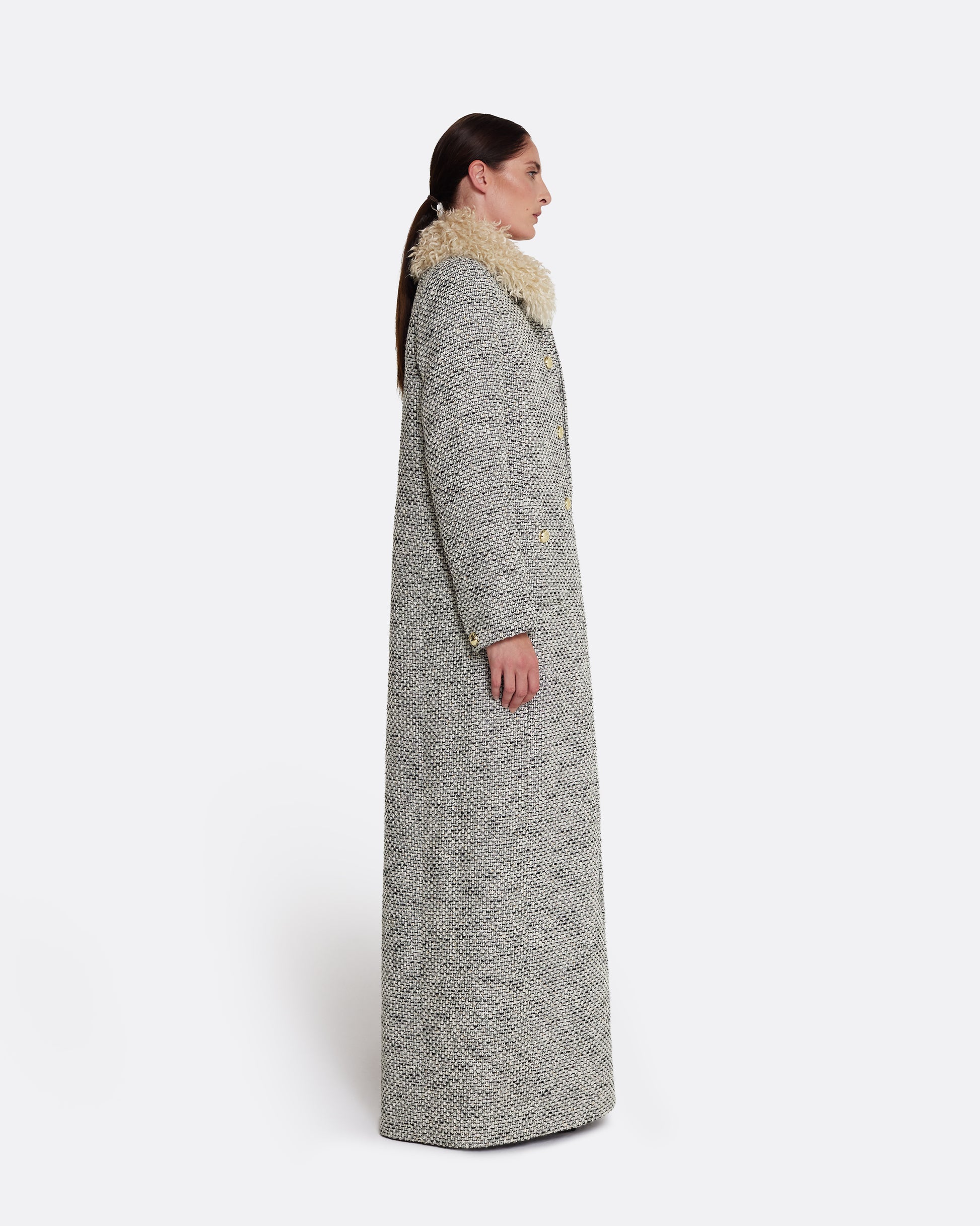 From the Spring Summer ’26 collection, the Leonora Coat in greyscale reimagines classic tailoring with sculptural flair. The longline cut is punctuated by a bold shearling collar and gold-tone buttons, creating a strong statement in texture and proportion.