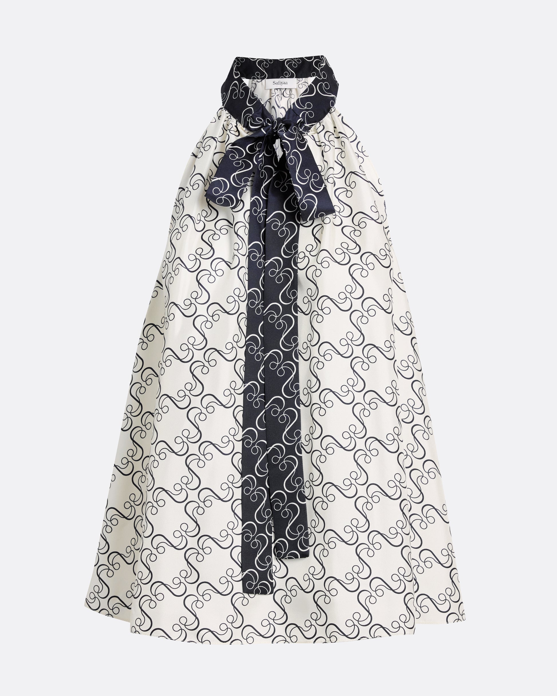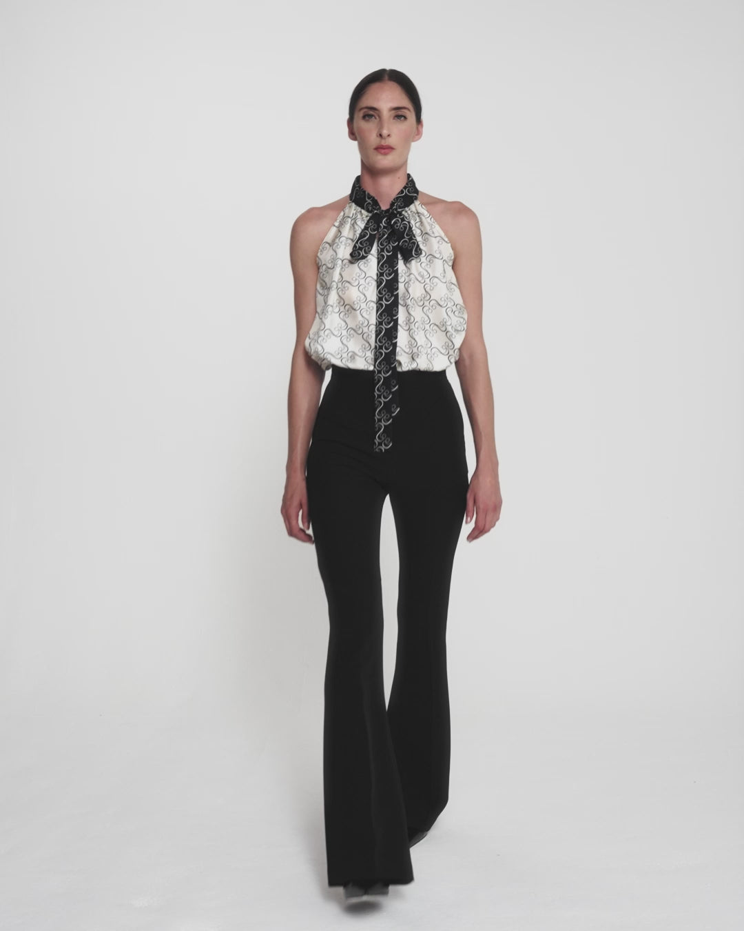 From the Spring Summer ’26 collection, the Letizia Top in black on ecru introduces contrast through a light, graphic composition. The halterneck cut creates a clean, elongated line, bringing focus to the neckline while keeping the overall look precise and composed.