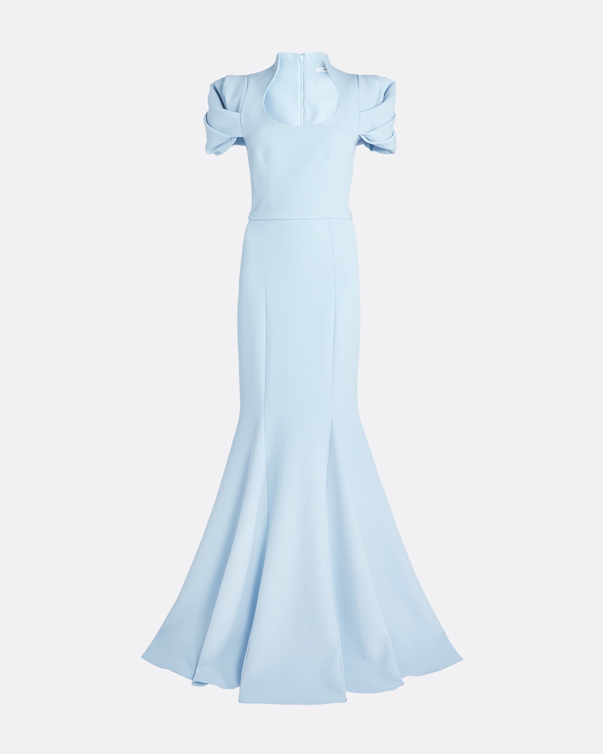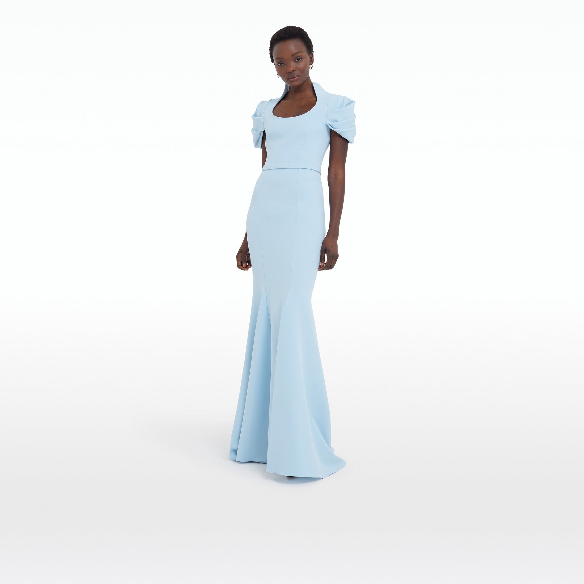 Long dress with scooped neckline with raised back and intertwined sleeve drape in pale blue.
