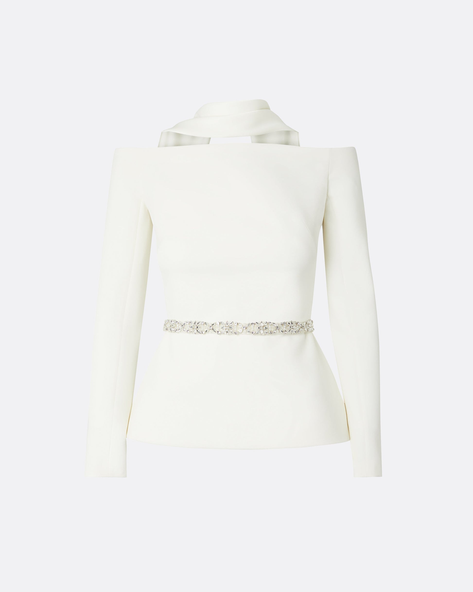 Off the shoulder top with sleeves and scarf drape in ivory Heavy Crepe and Satin Back Crepe, with Folius Trim embroidery.