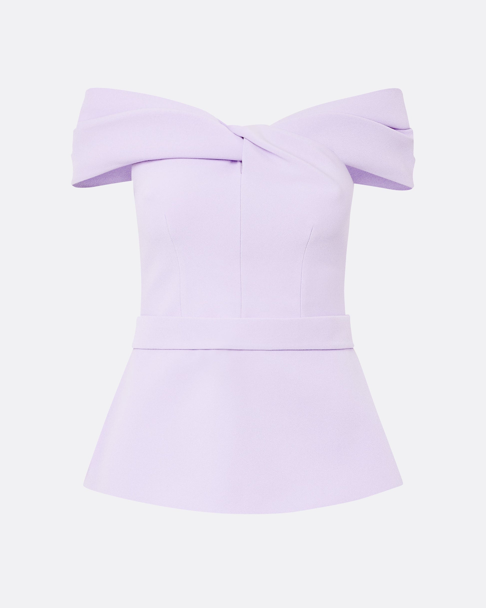 Off the shoulder top with twist detail and peplum in verbena Heavy Crepe.
