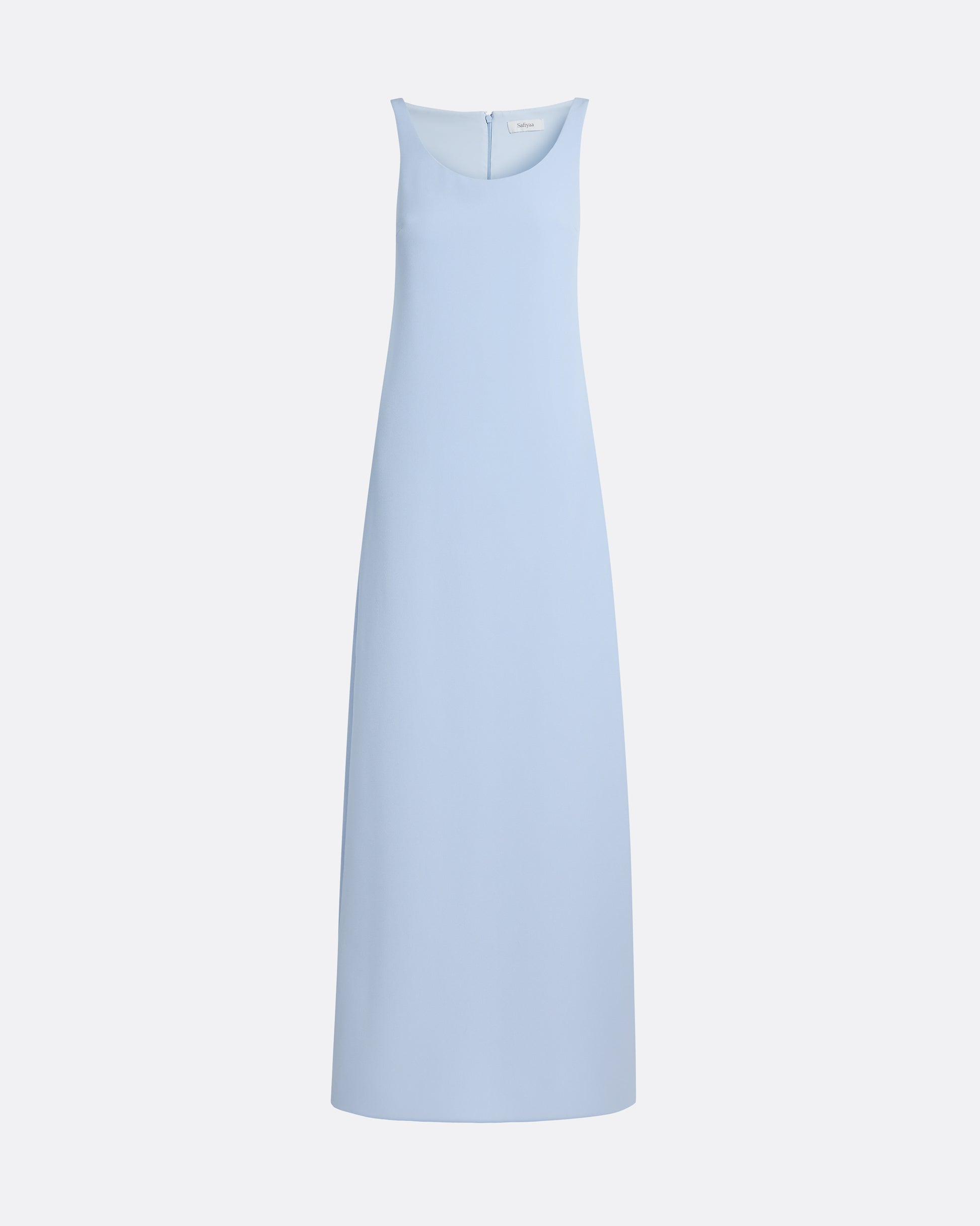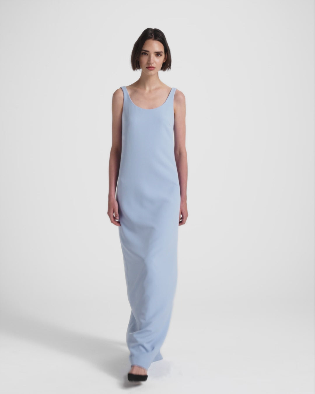From the Pre-Fall ’26 collection, the Maddison Long Dress in soft sky is a wedding guest dress designed for understated, formal dressing. Cut in signature Heavy Crepe, the sleeveless shift silhouette is defined by a clean round neckline, offering a simple, refined foundation. Designed to pair with the Elise Harness for added coverage and layered styling.
