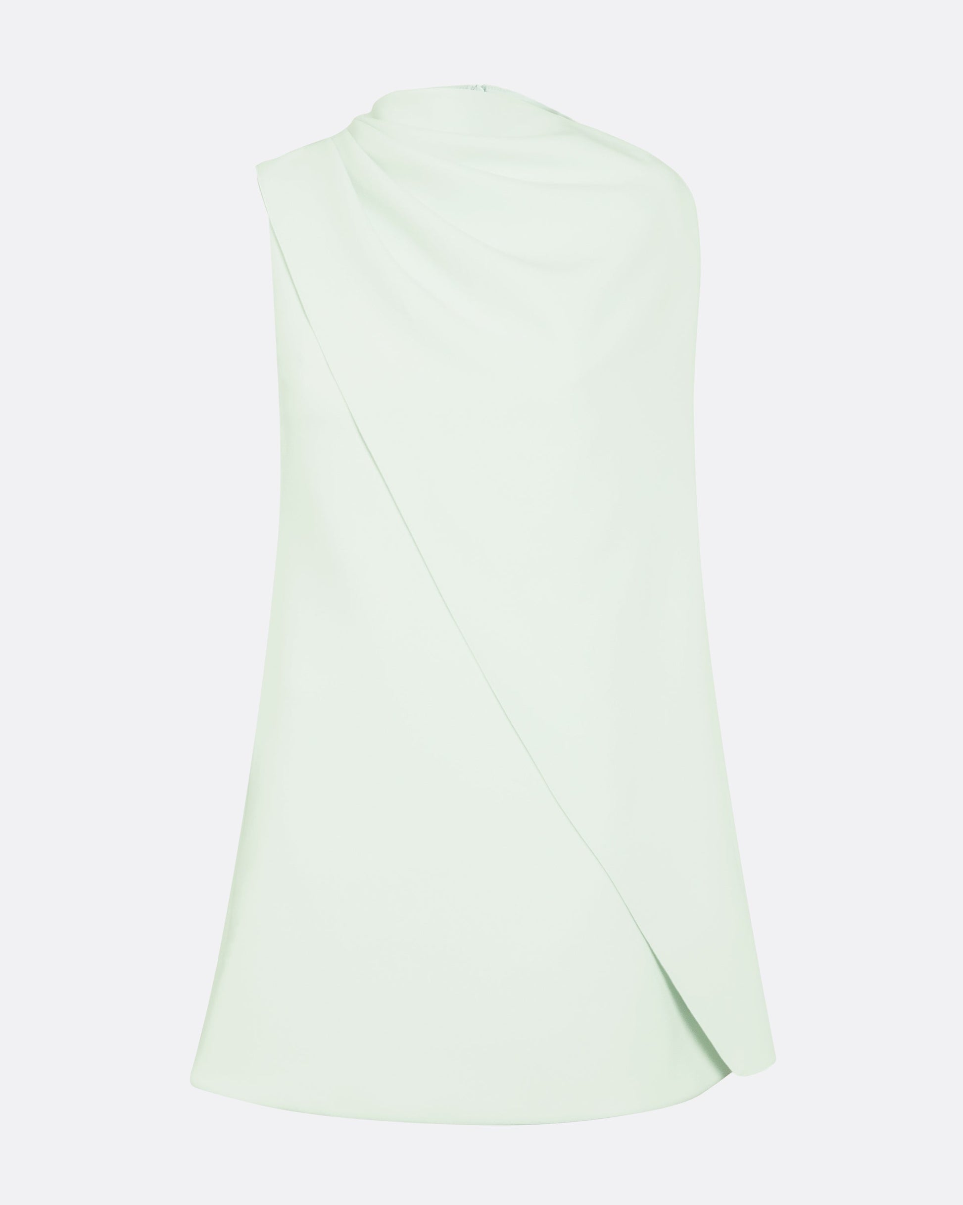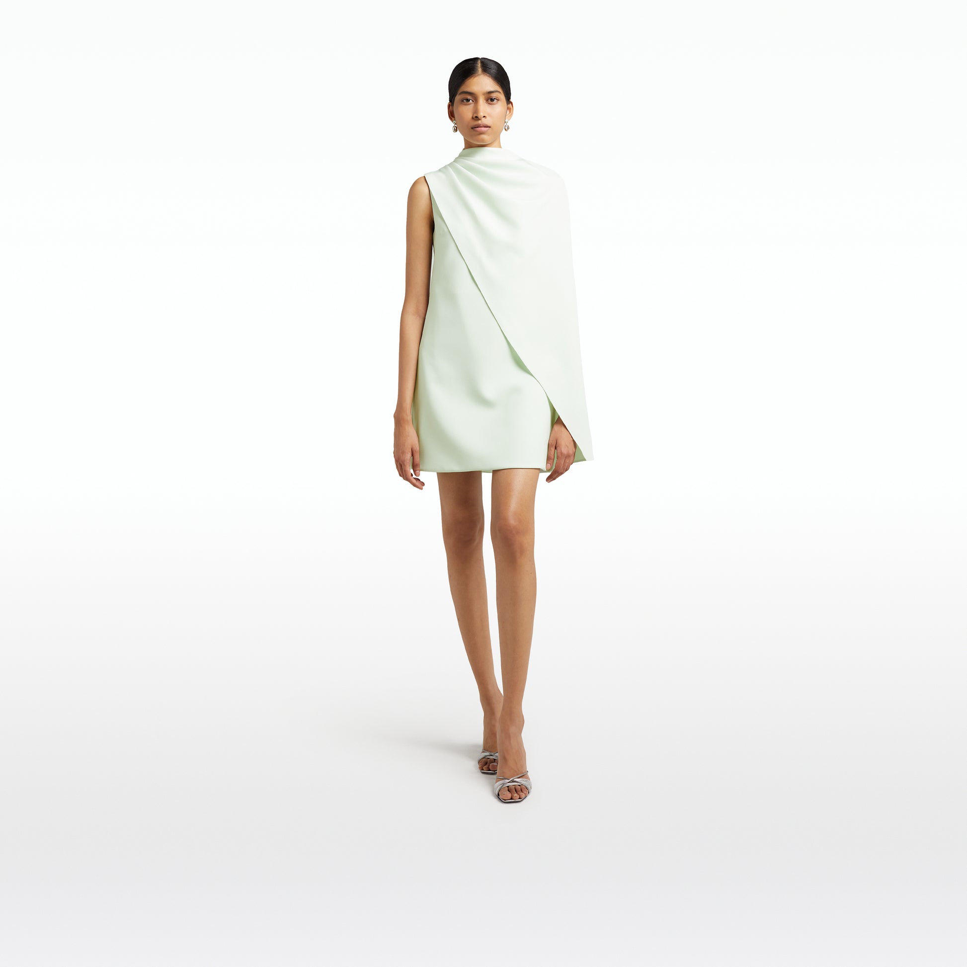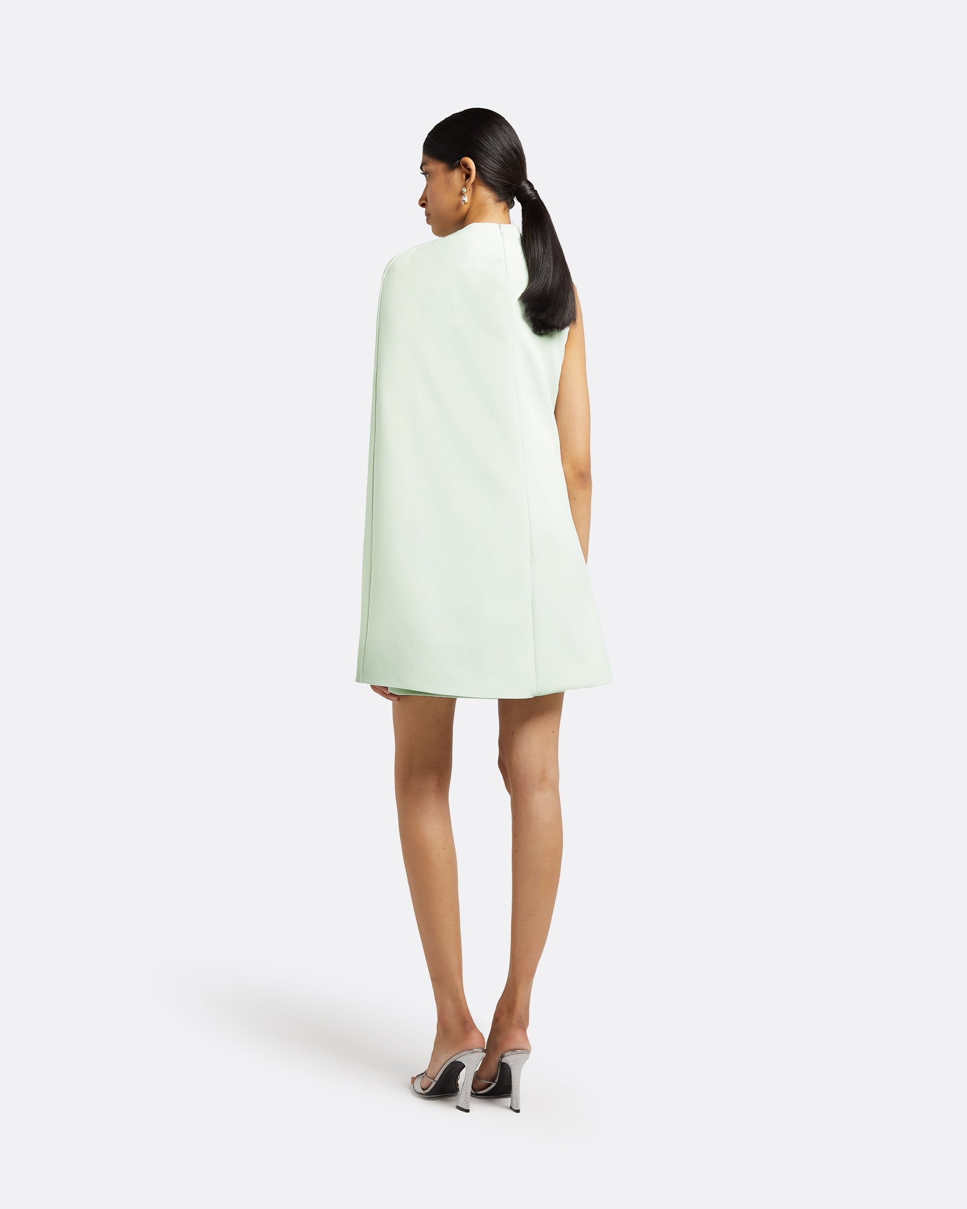 Mini A-line dress with draped cape sleeve and gathered neckline in spearmint Heavy Crepe.